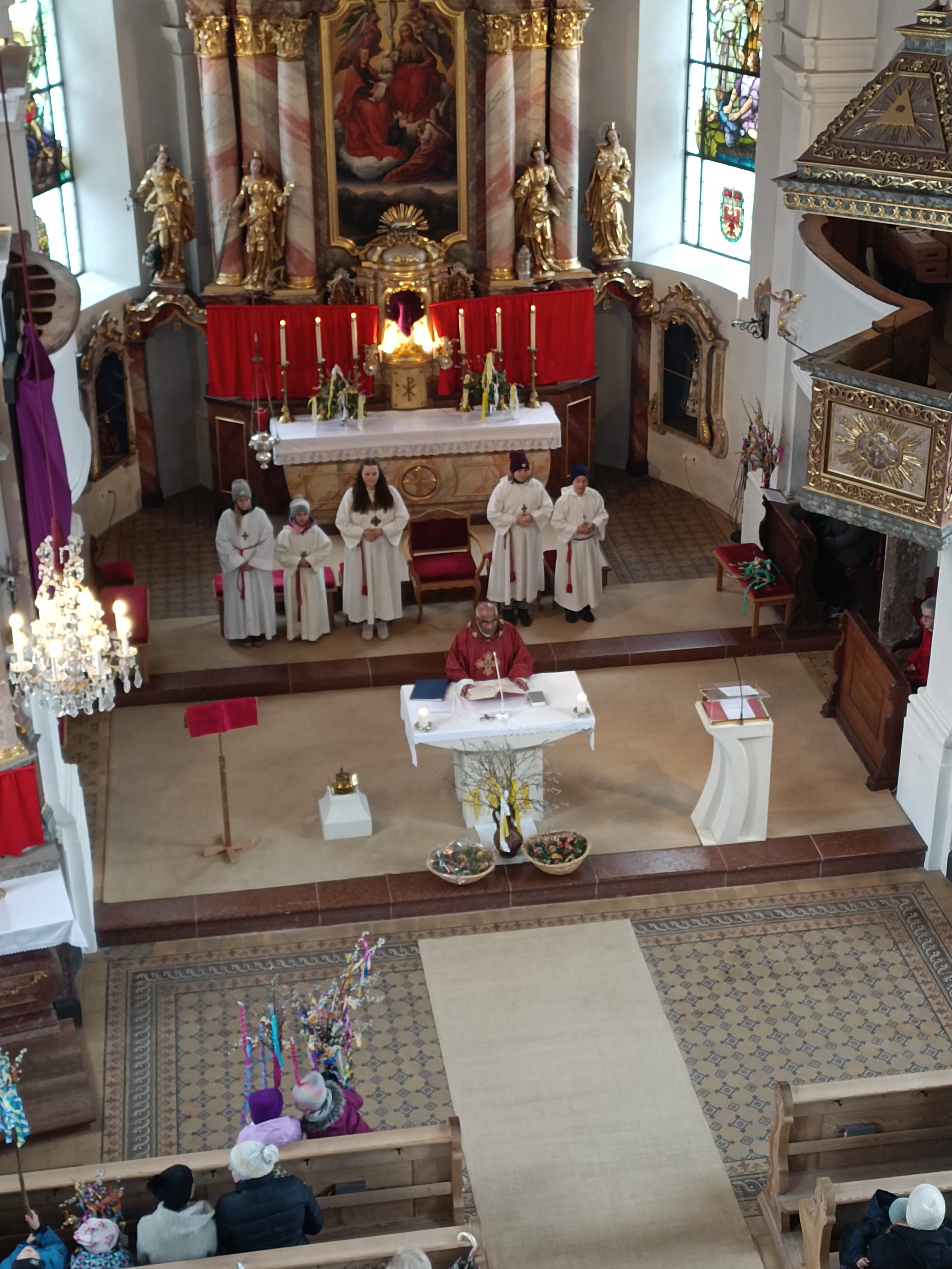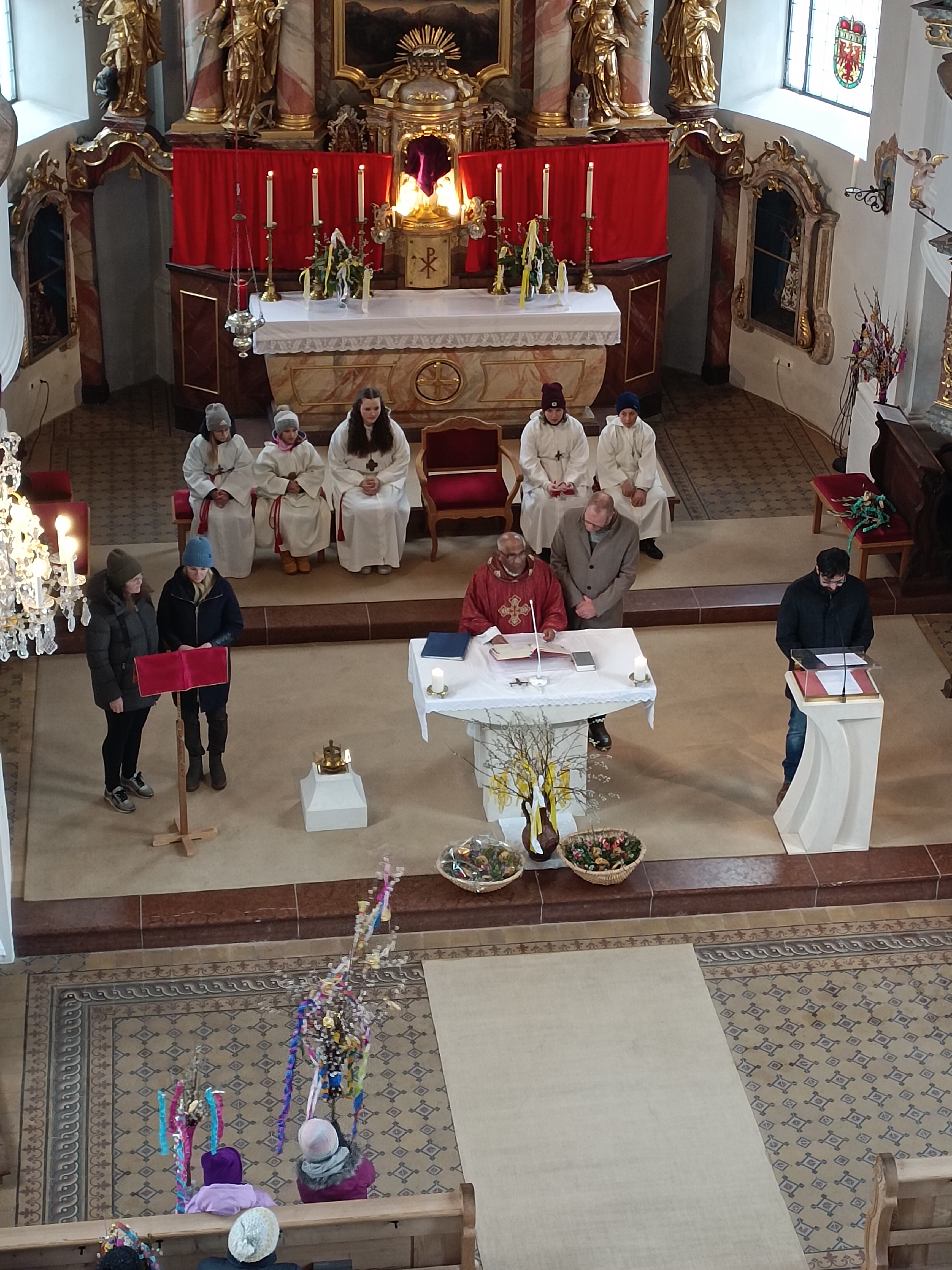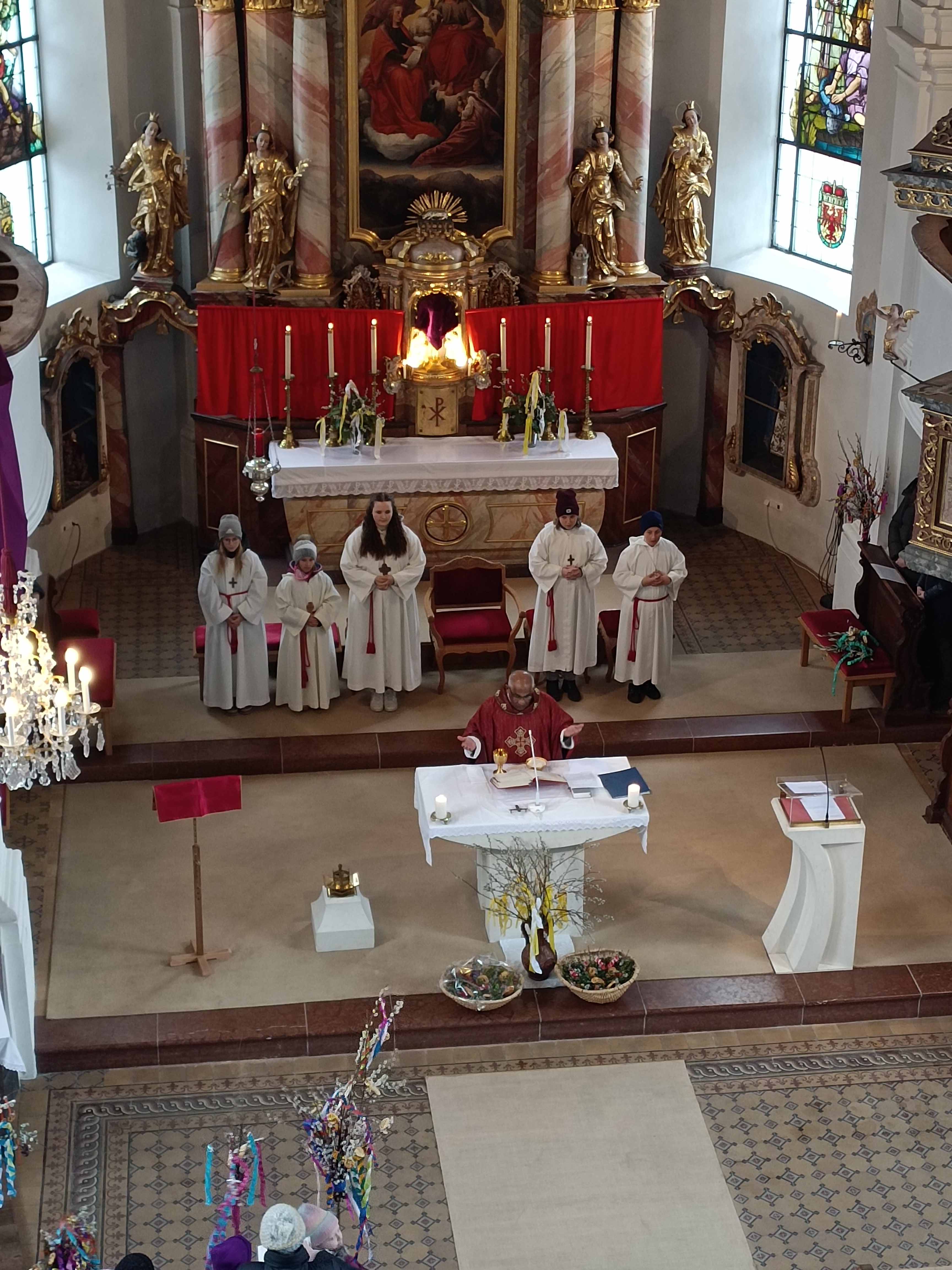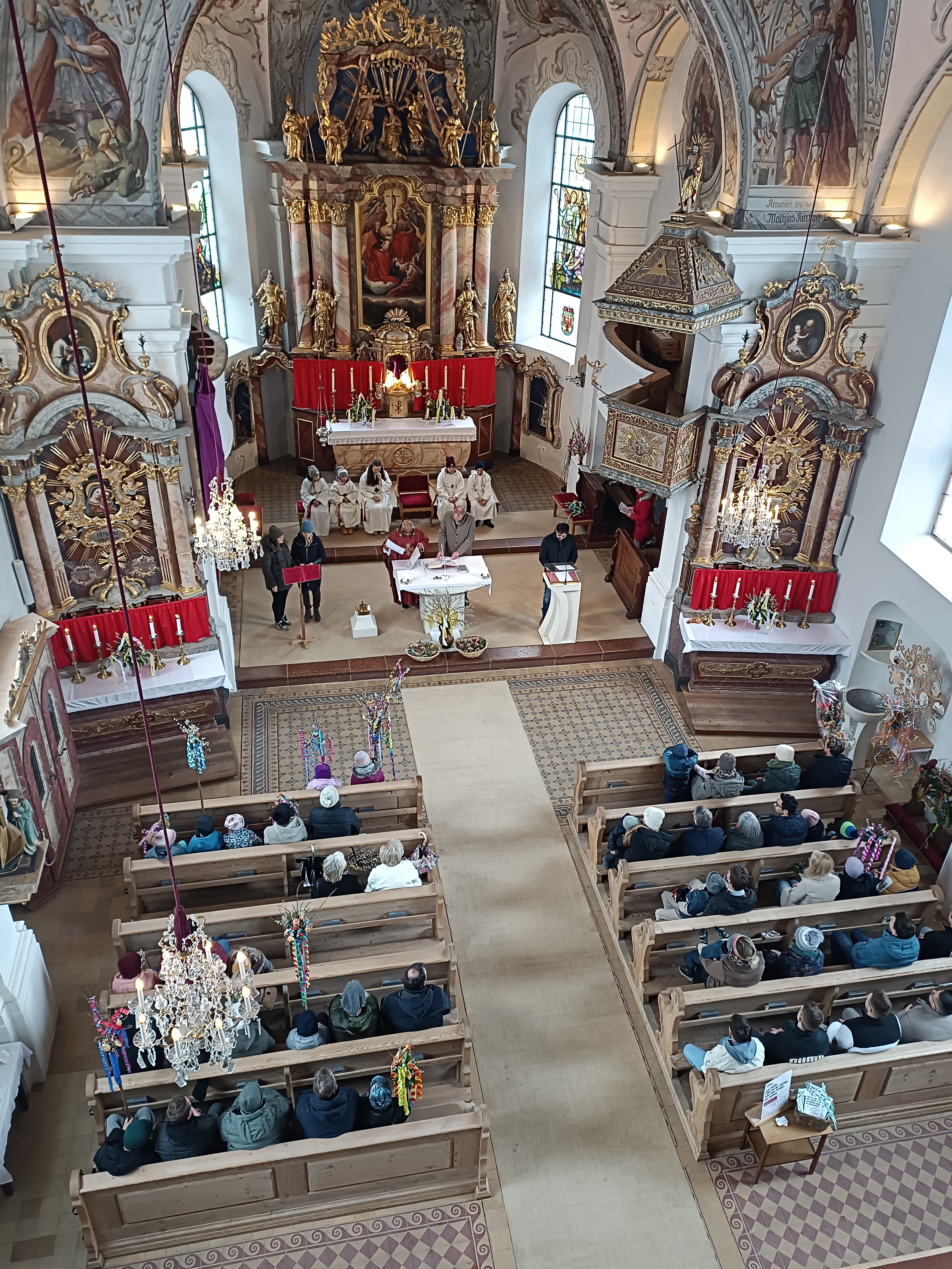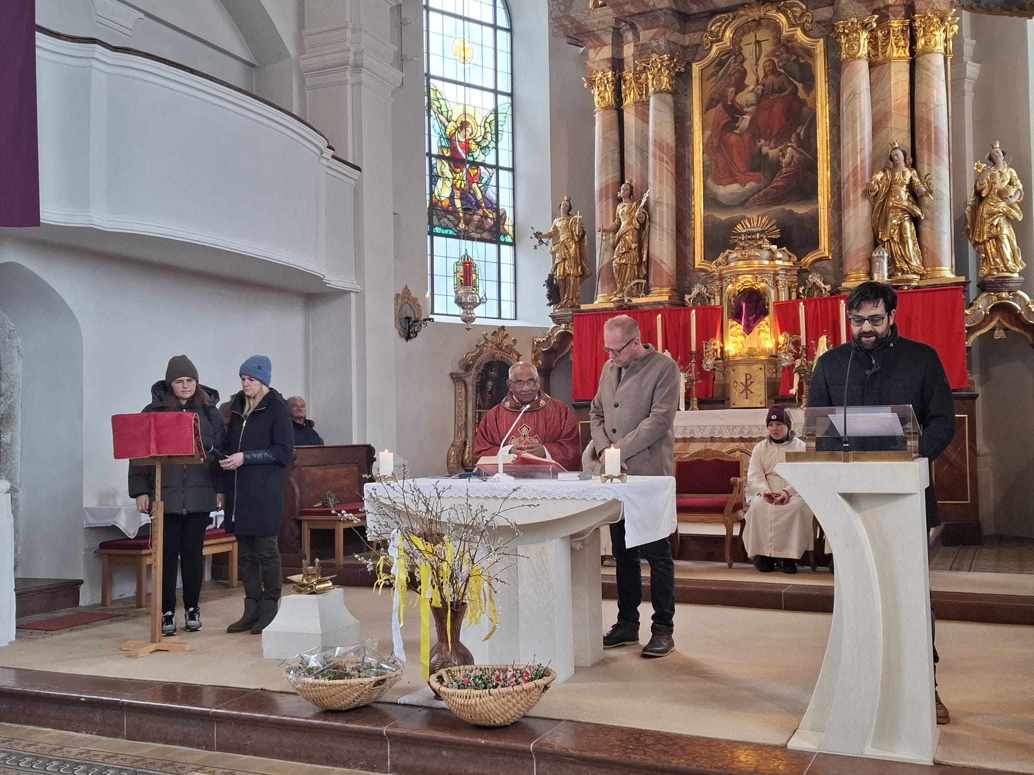 Im Anschluss zog die Prozession gemeinsam in die Kirche ein, wo der festliche Gottesdienst zum Palmsonntag gefeiert wurde. In der wohligen Wärme setzte sich die Feier in einem würdigen Rahmen fort. Die Lesung der Passion und die feierliche Liturgie erinnerten eindrucksvoll an den Beginn der Karwoche. Das feierliche Orgelspiel verlieh der Festmesse eine besonders würdige und festliche Atmosphäre.