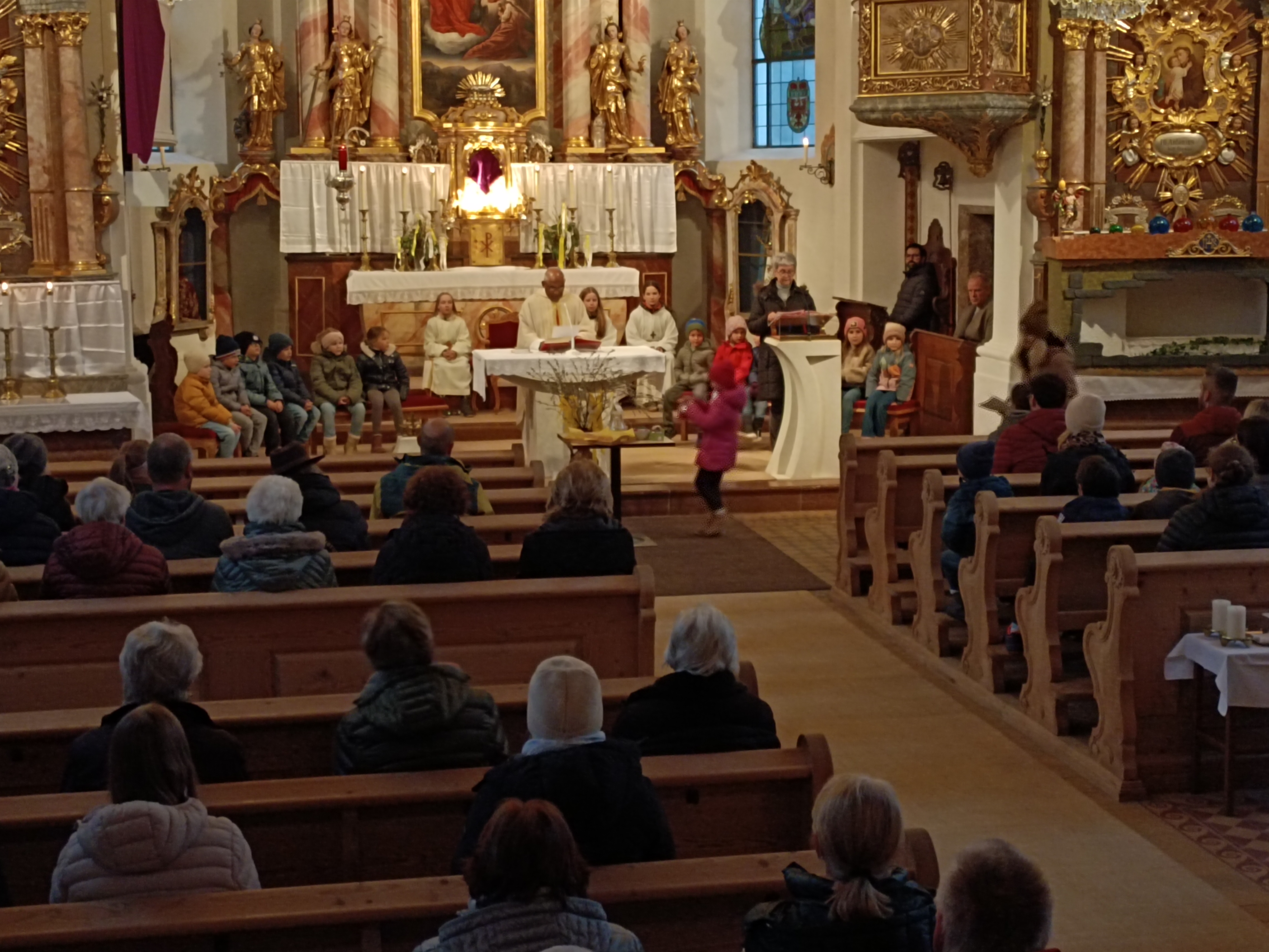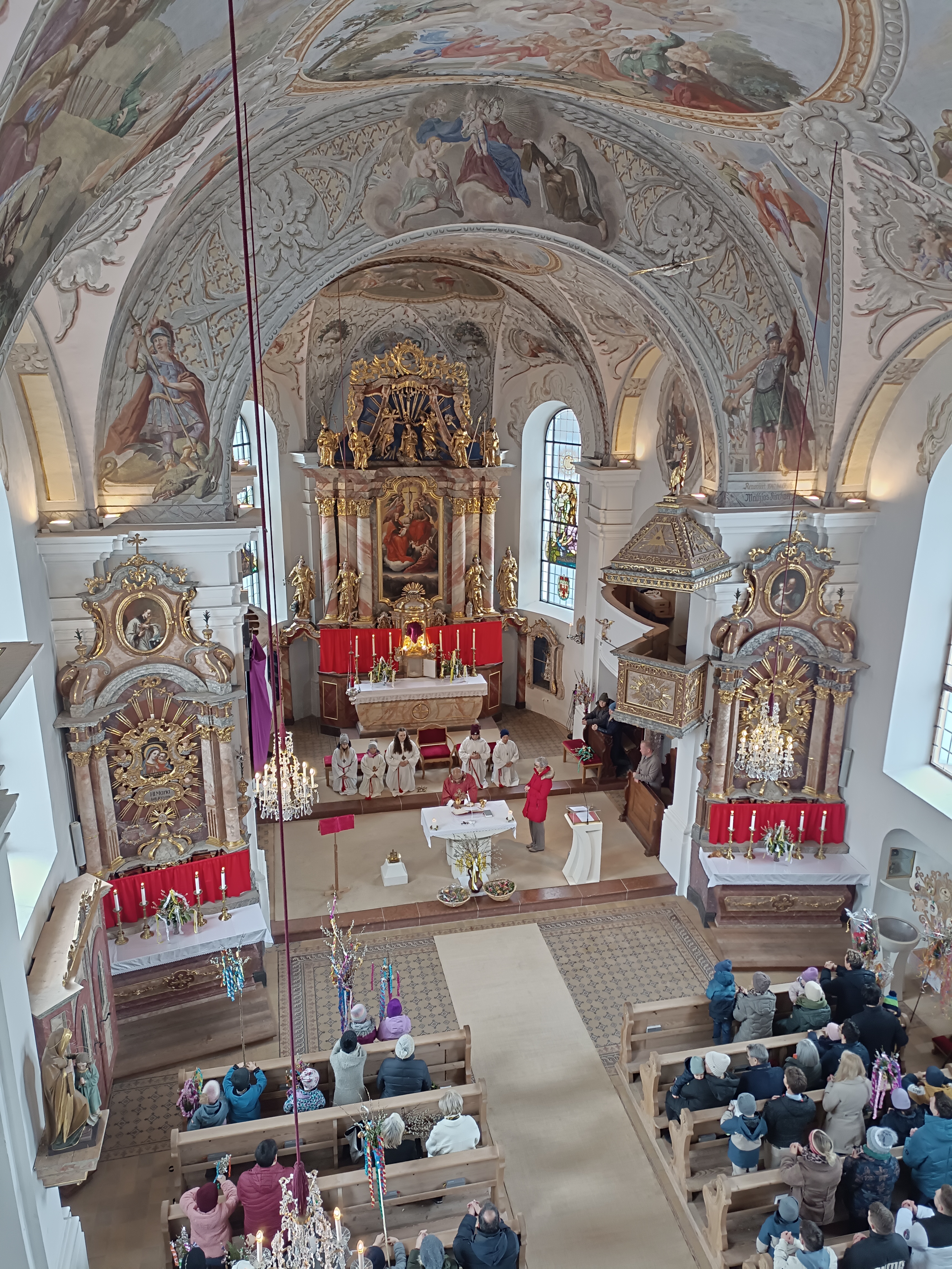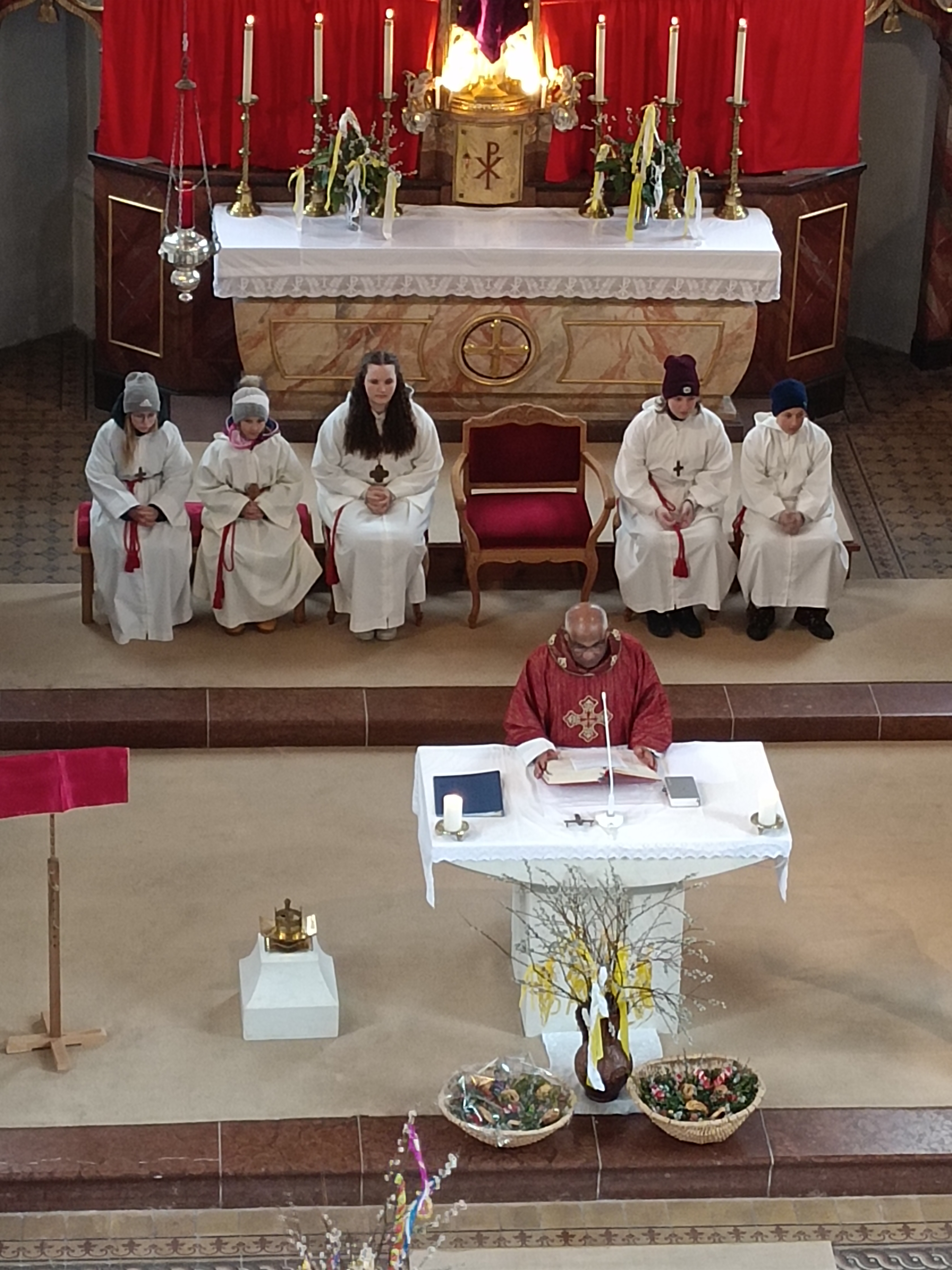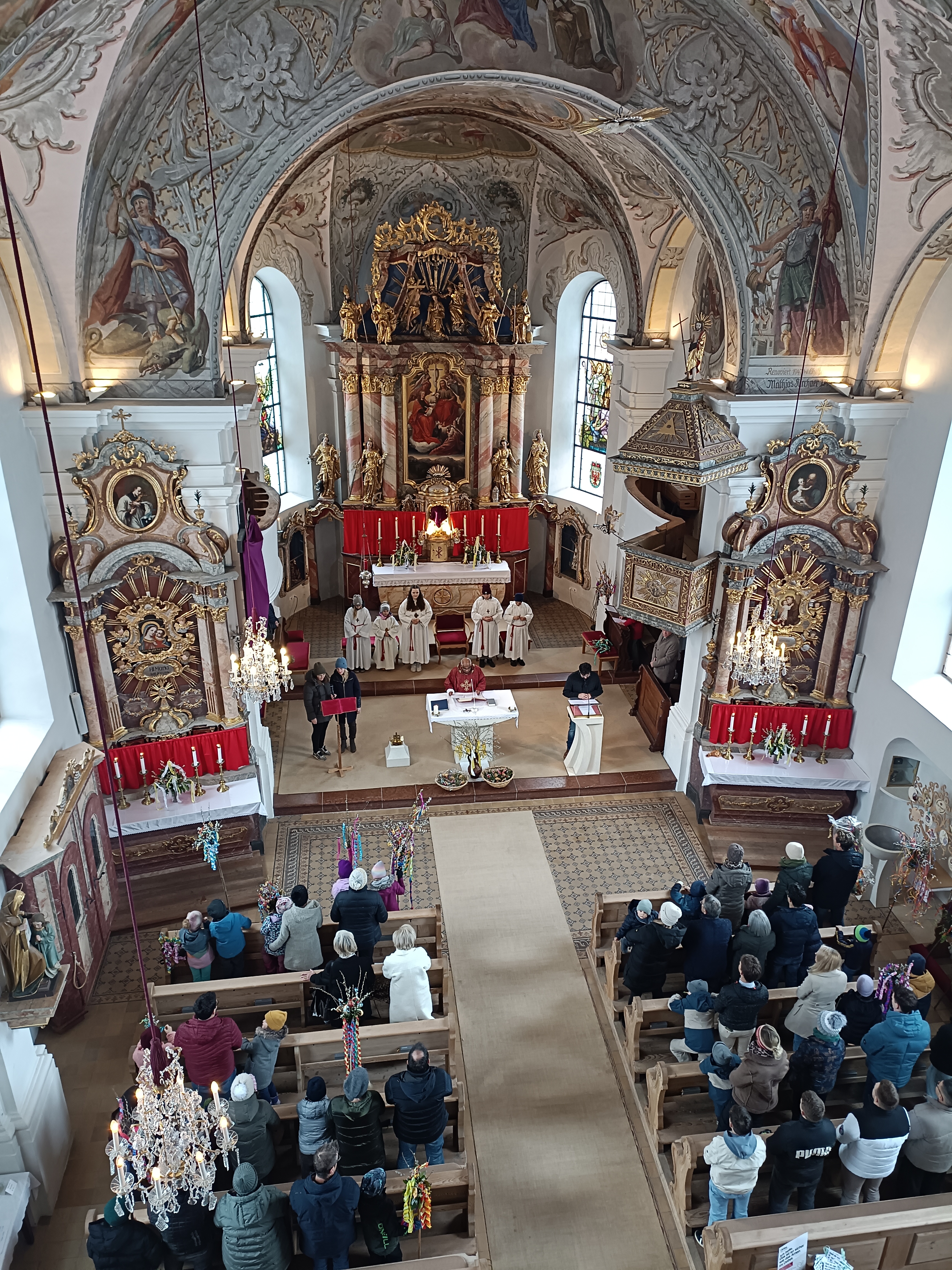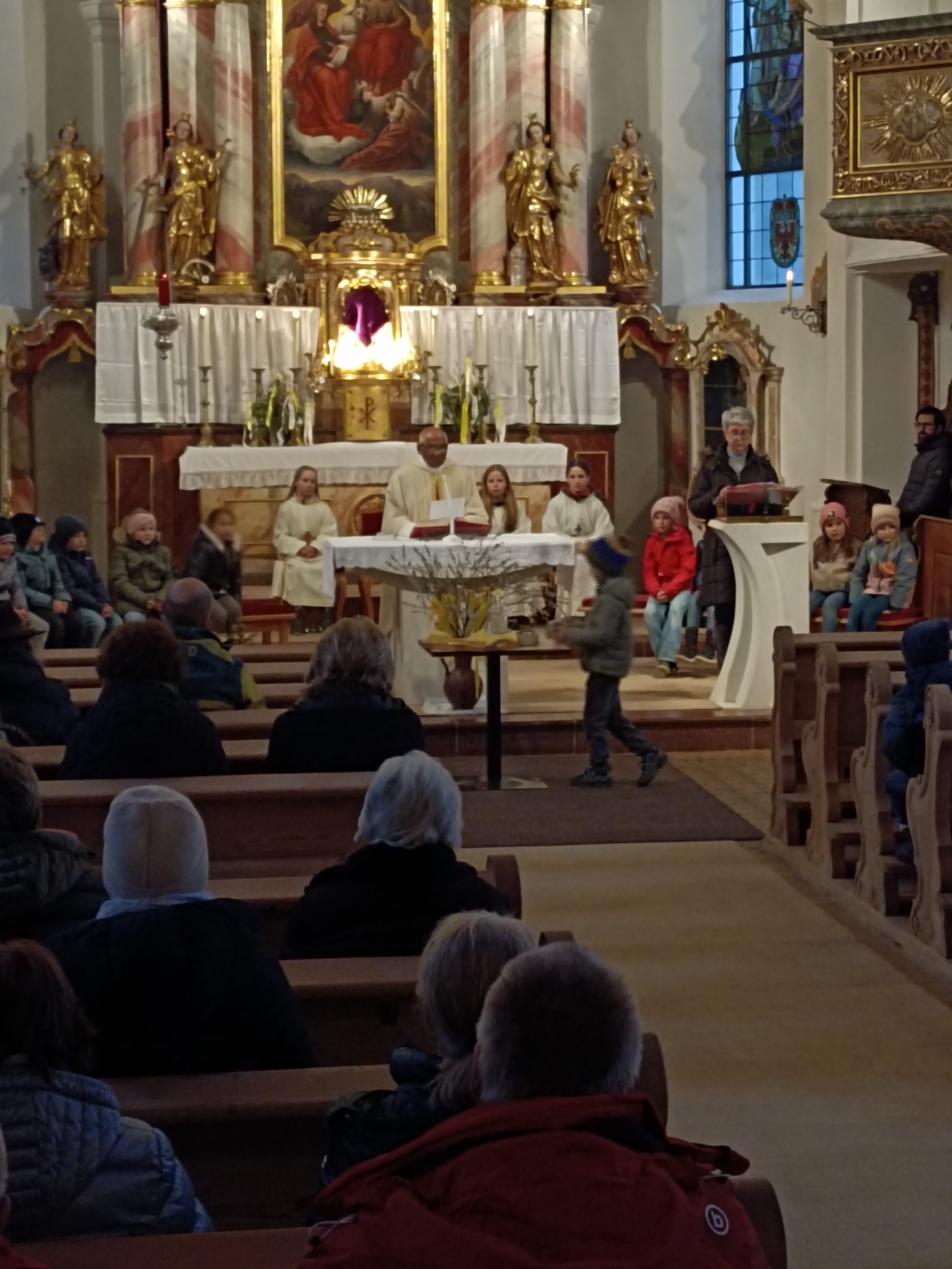 Im Anschluss zog die Prozession gemeinsam in die Kirche ein, wo der festliche Gottesdienst zum Palmsonntag gefeiert wurde. In der wohligen Wärme setzte sich die Feier in einem würdigen Rahmen fort. Die Lesung der Passion und die feierliche Liturgie erinnerten eindrucksvoll an den Beginn der Karwoche. Das feierliche Orgelspiel verlieh der Festmesse eine besonders würdige und festliche Atmosphäre.