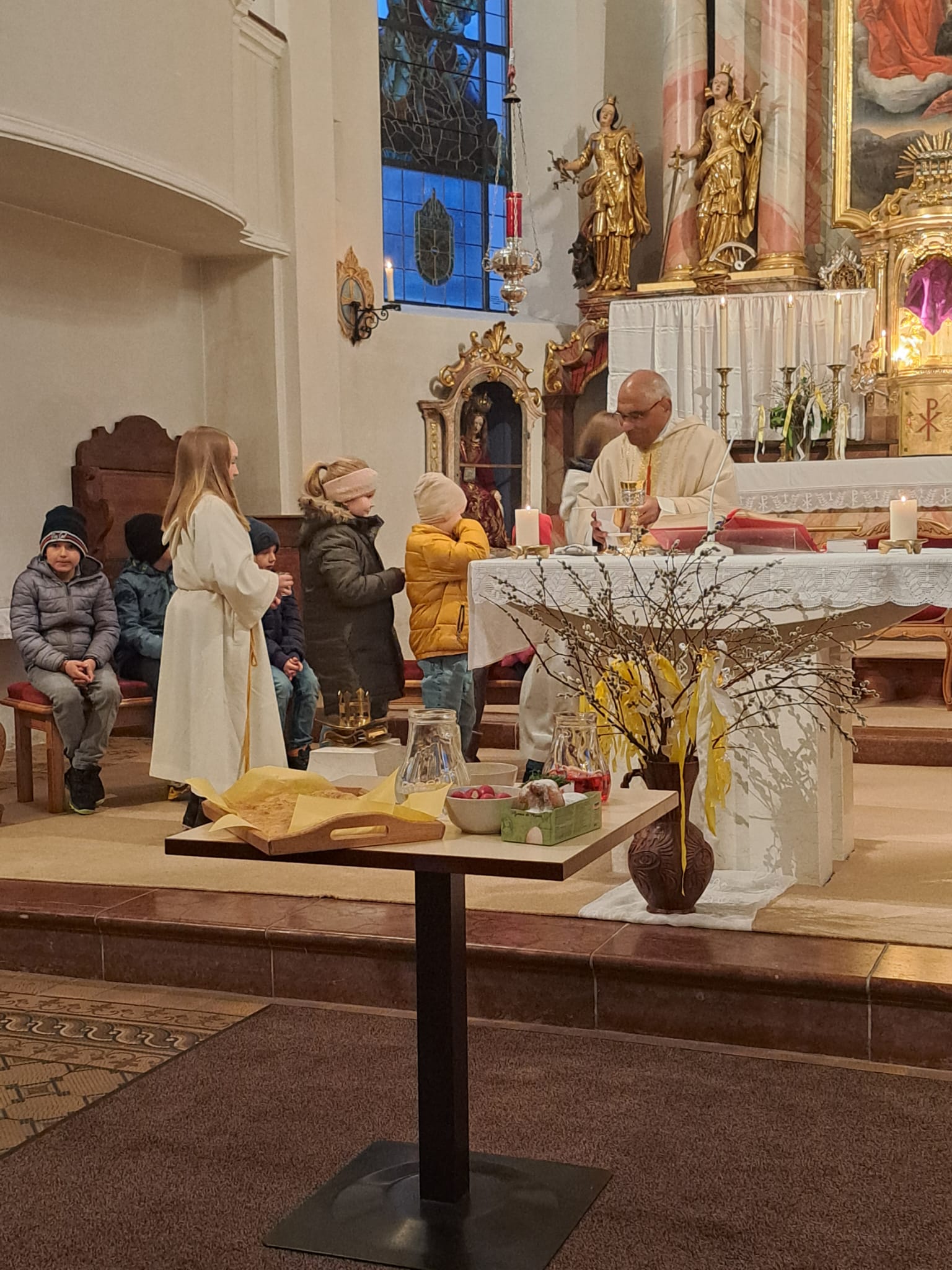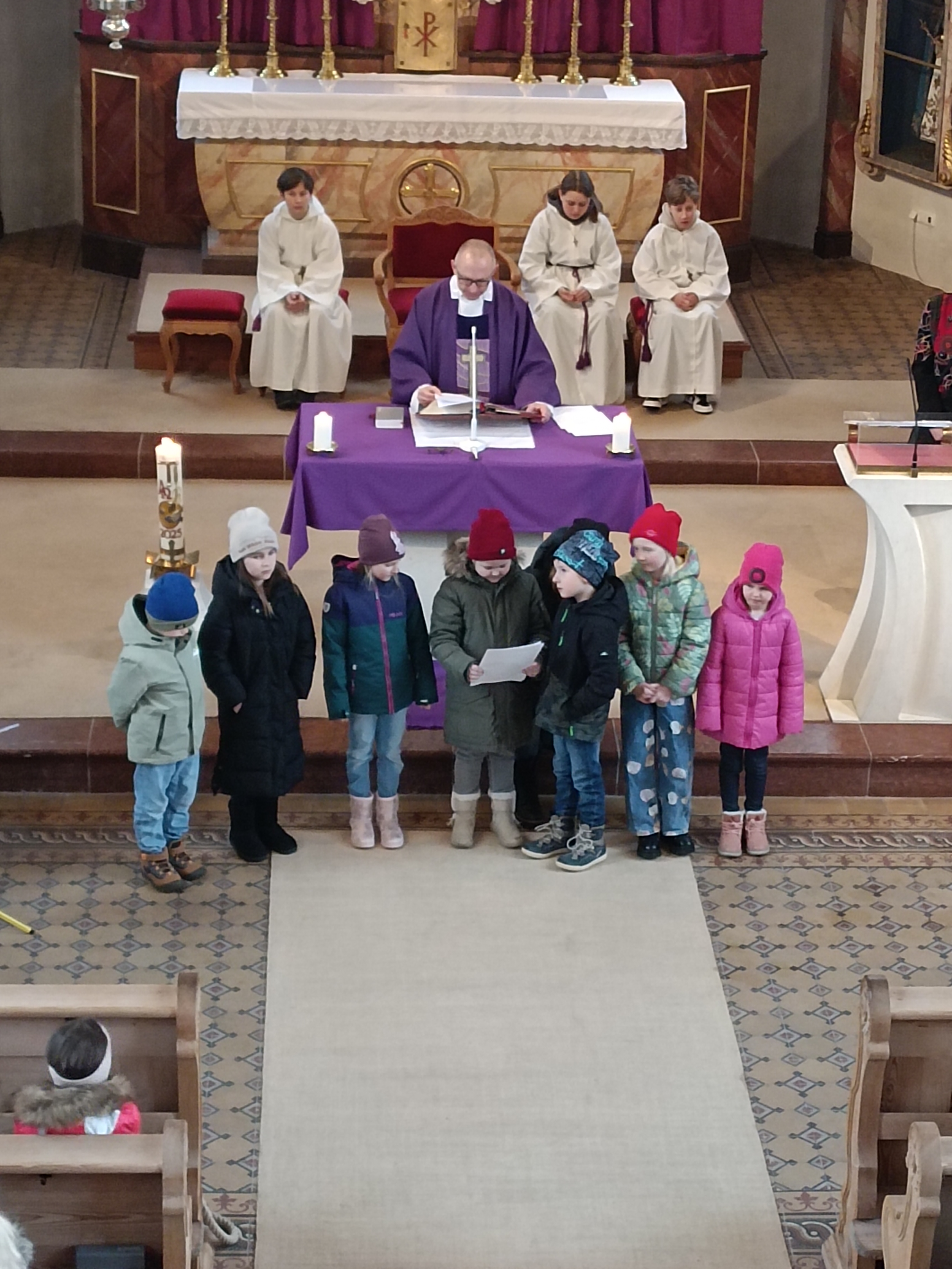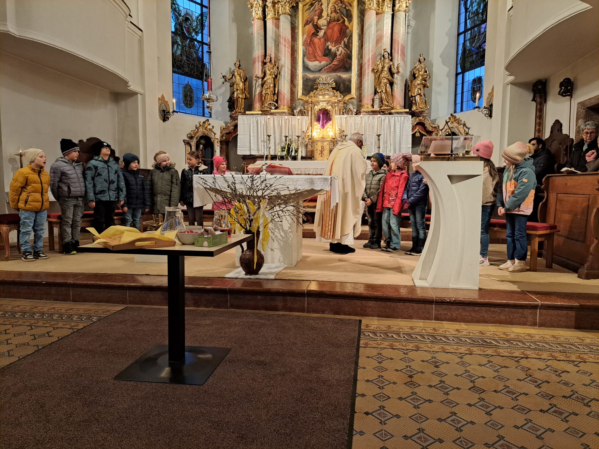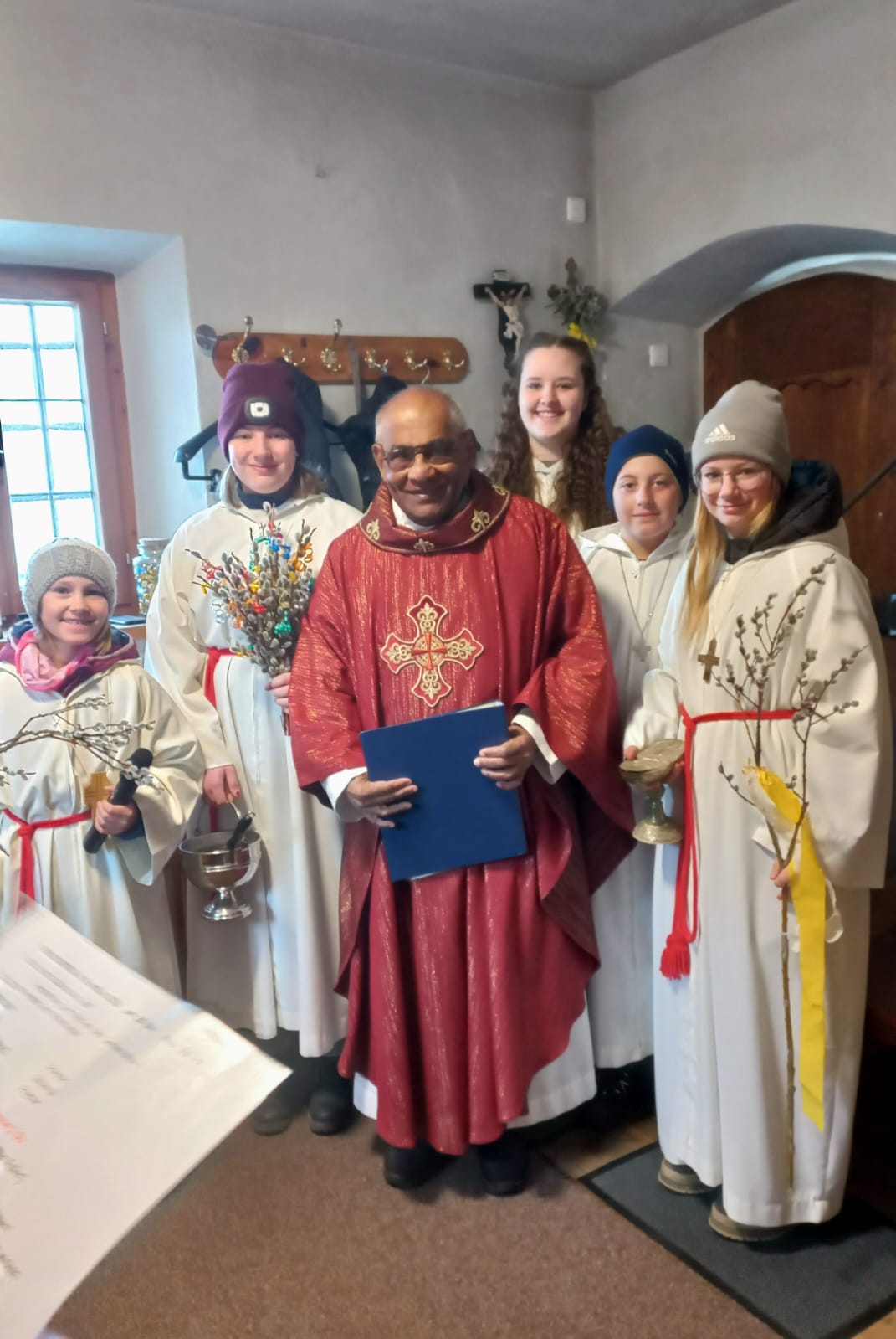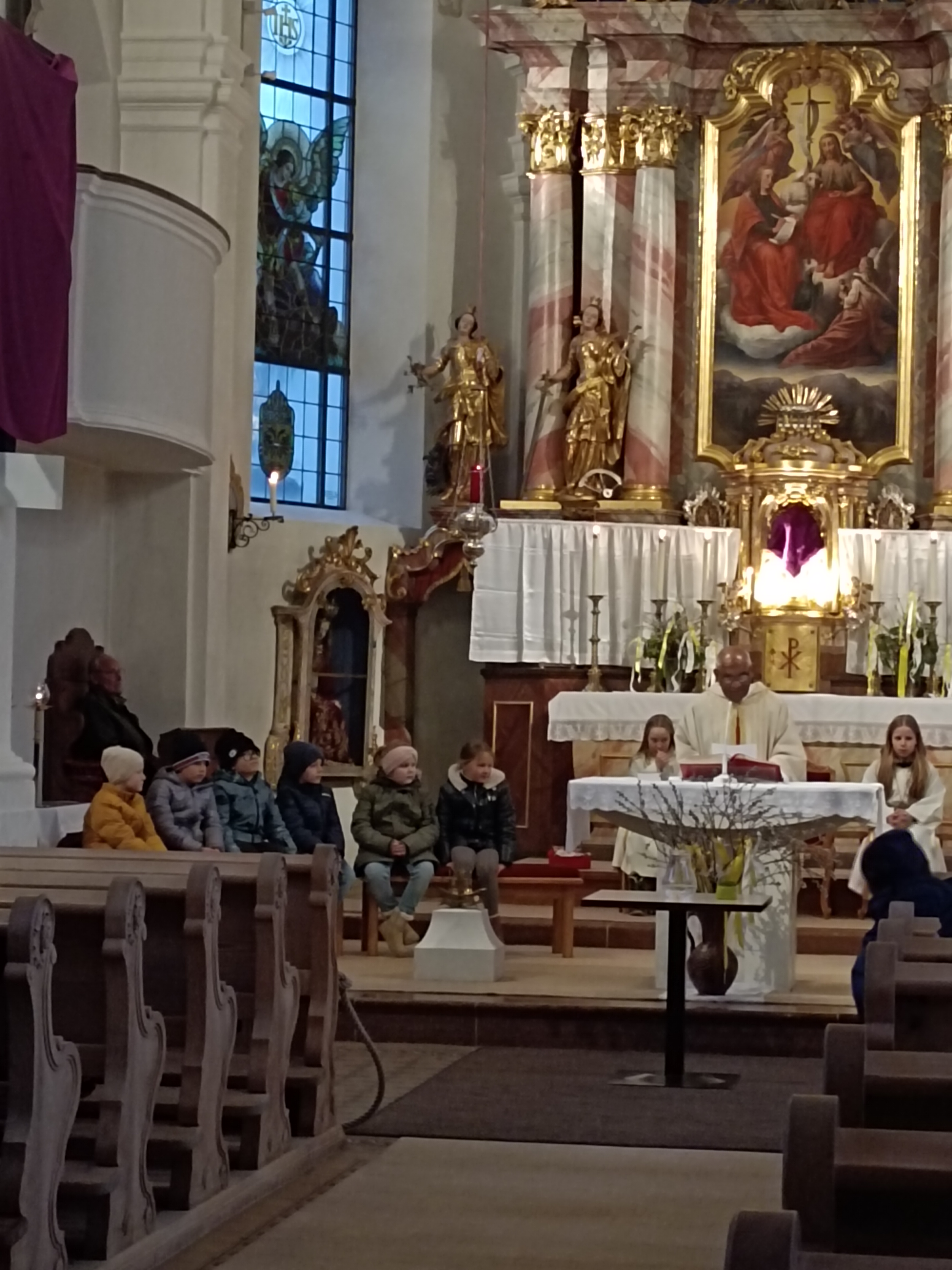 Im Anschluss zog die Prozession gemeinsam in die Kirche ein, wo der festliche Gottesdienst zum Palmsonntag gefeiert wurde. In der wohligen Wärme setzte sich die Feier in einem würdigen Rahmen fort. Die Lesung der Passion und die feierliche Liturgie erinnerten eindrucksvoll an den Beginn der Karwoche. Das feierliche Orgelspiel verlieh der Festmesse eine besonders würdige und festliche Atmosphäre.