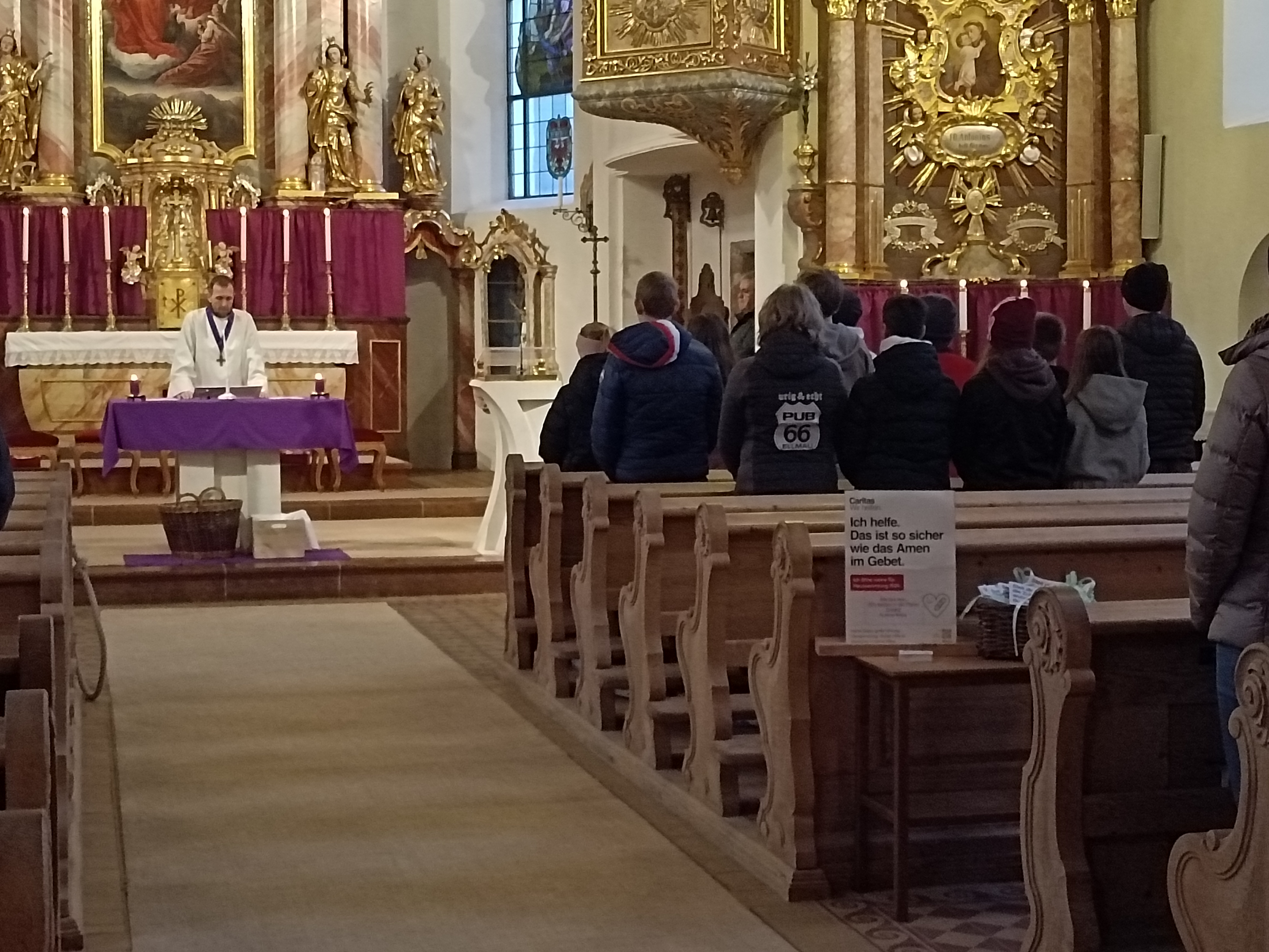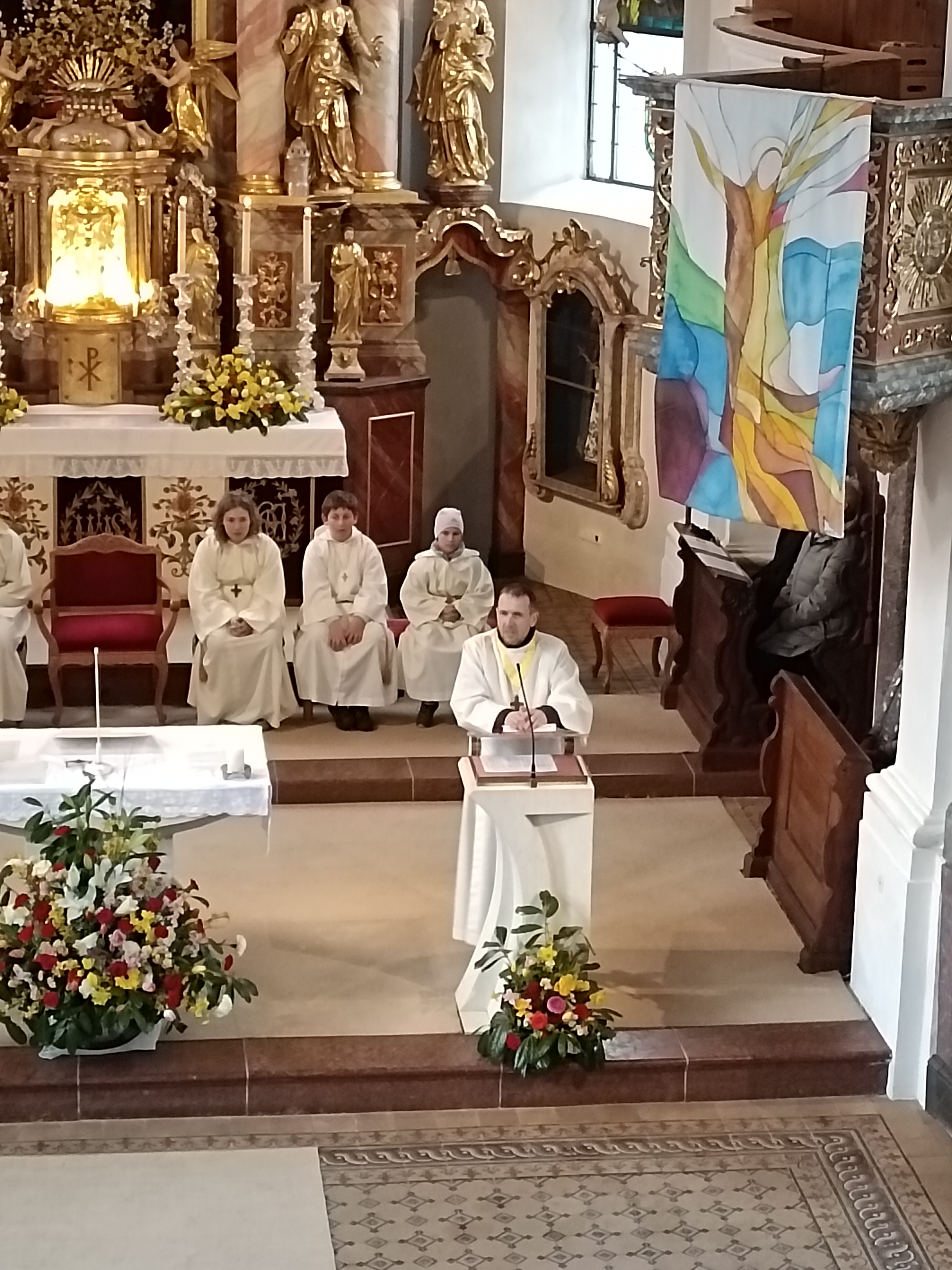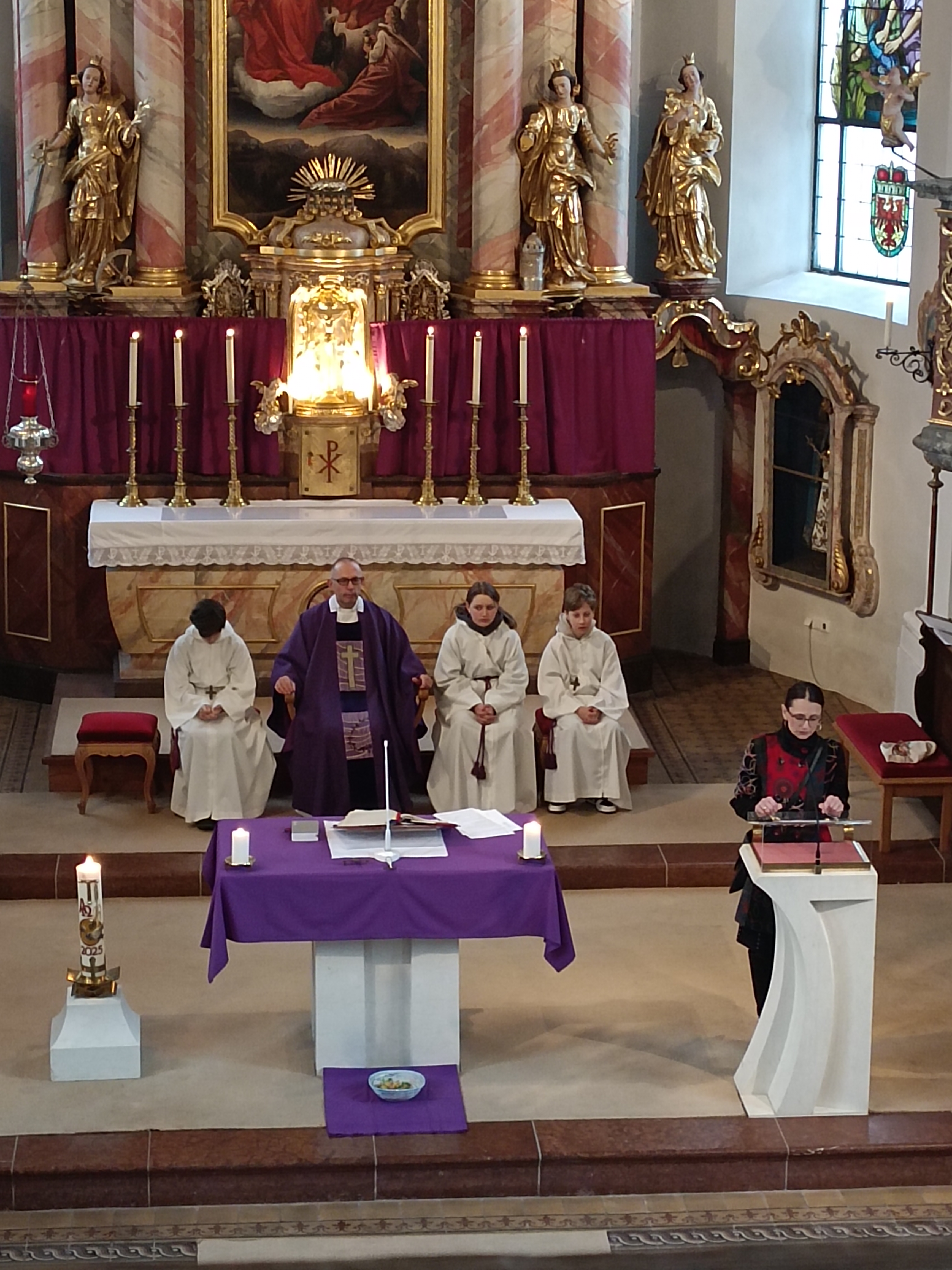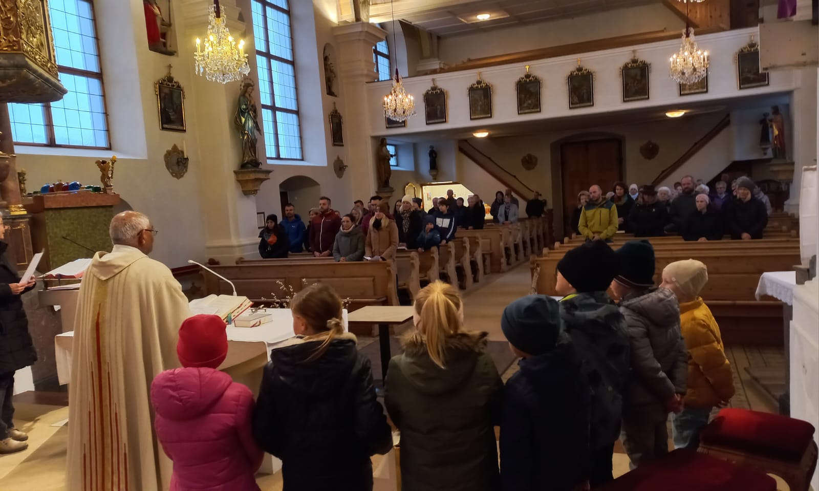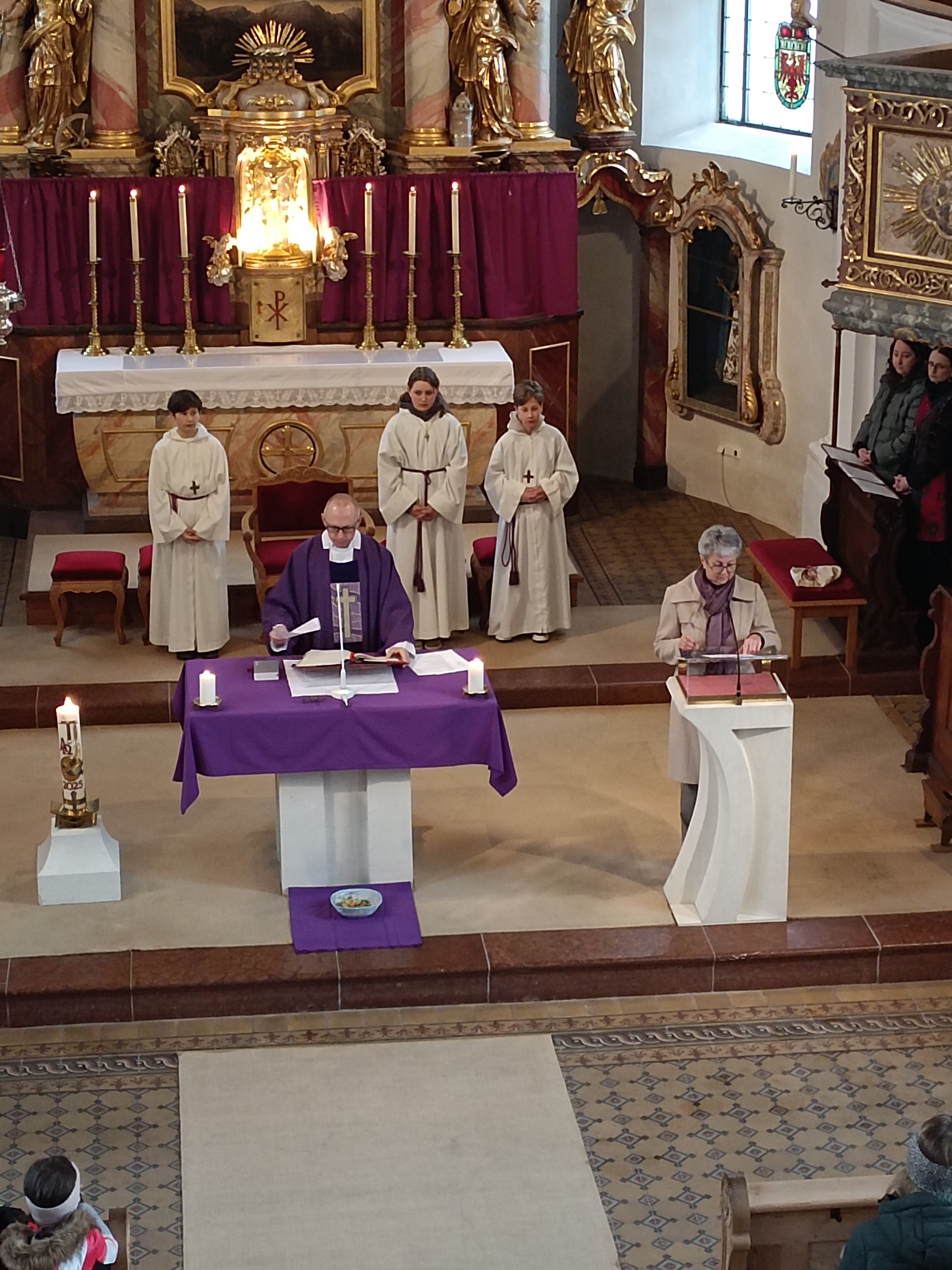Im Anschluss zog die Prozession gemeinsam in die Kirche ein, wo der festliche Gottesdienst zum Palmsonntag gefeiert wurde. In der wohligen Wärme setzte sich die Feier in einem würdigen Rahmen fort. Die Lesung der Passion und die feierliche Liturgie erinnerten eindrucksvoll an den Beginn der Karwoche. Das feierliche Orgelspiel verlieh der Festmesse eine besonders würdige und festliche Atmosphäre.