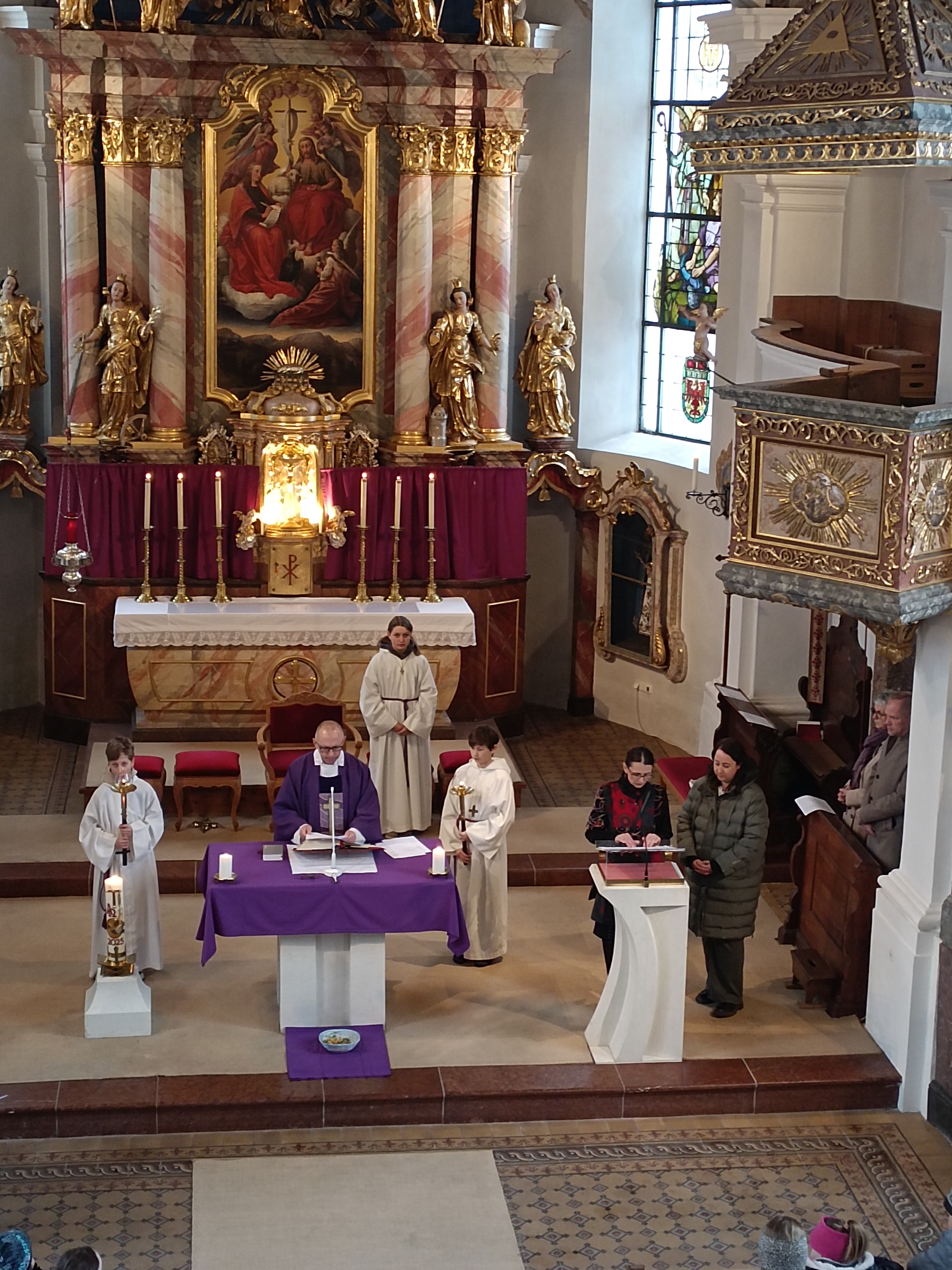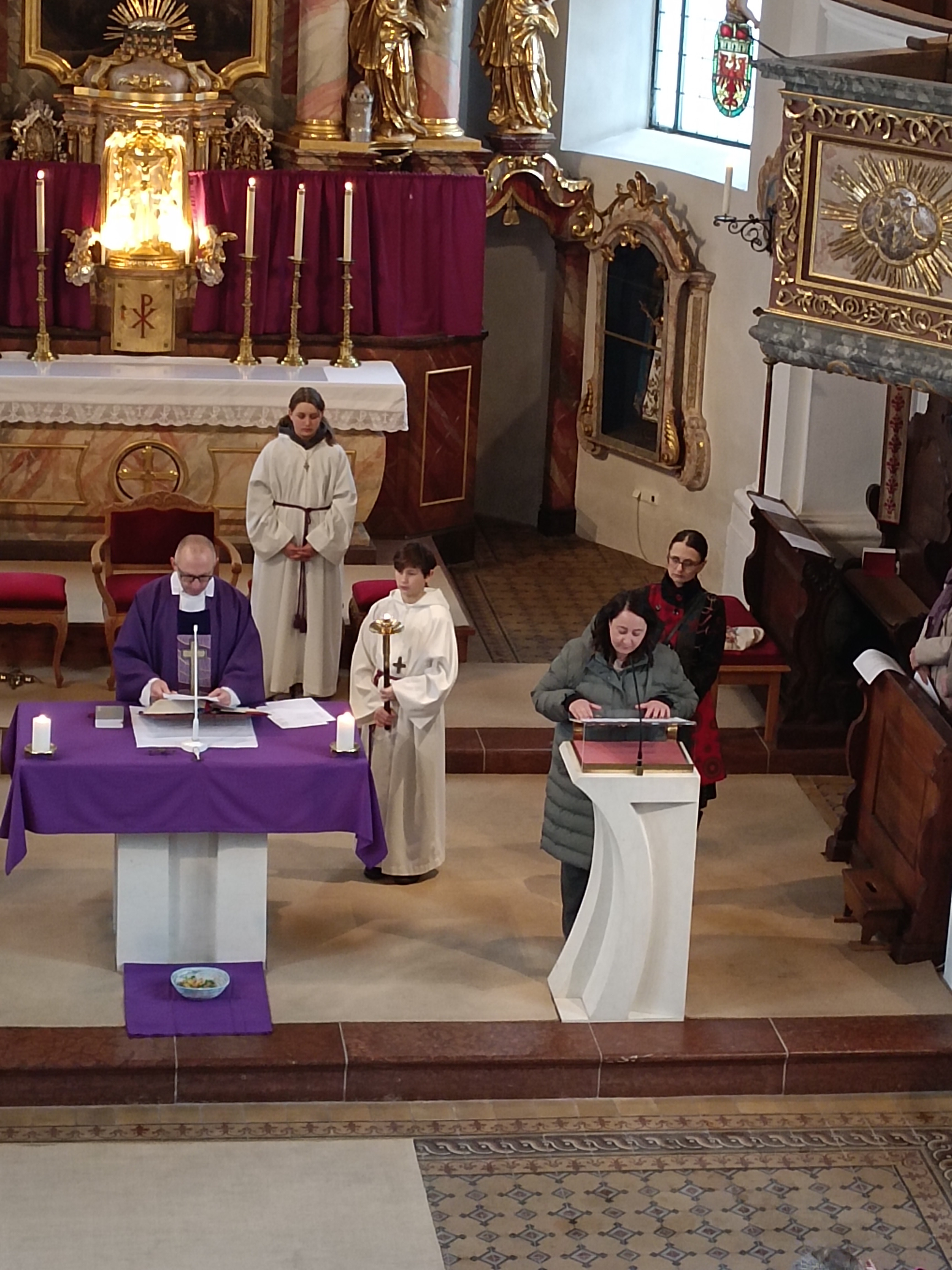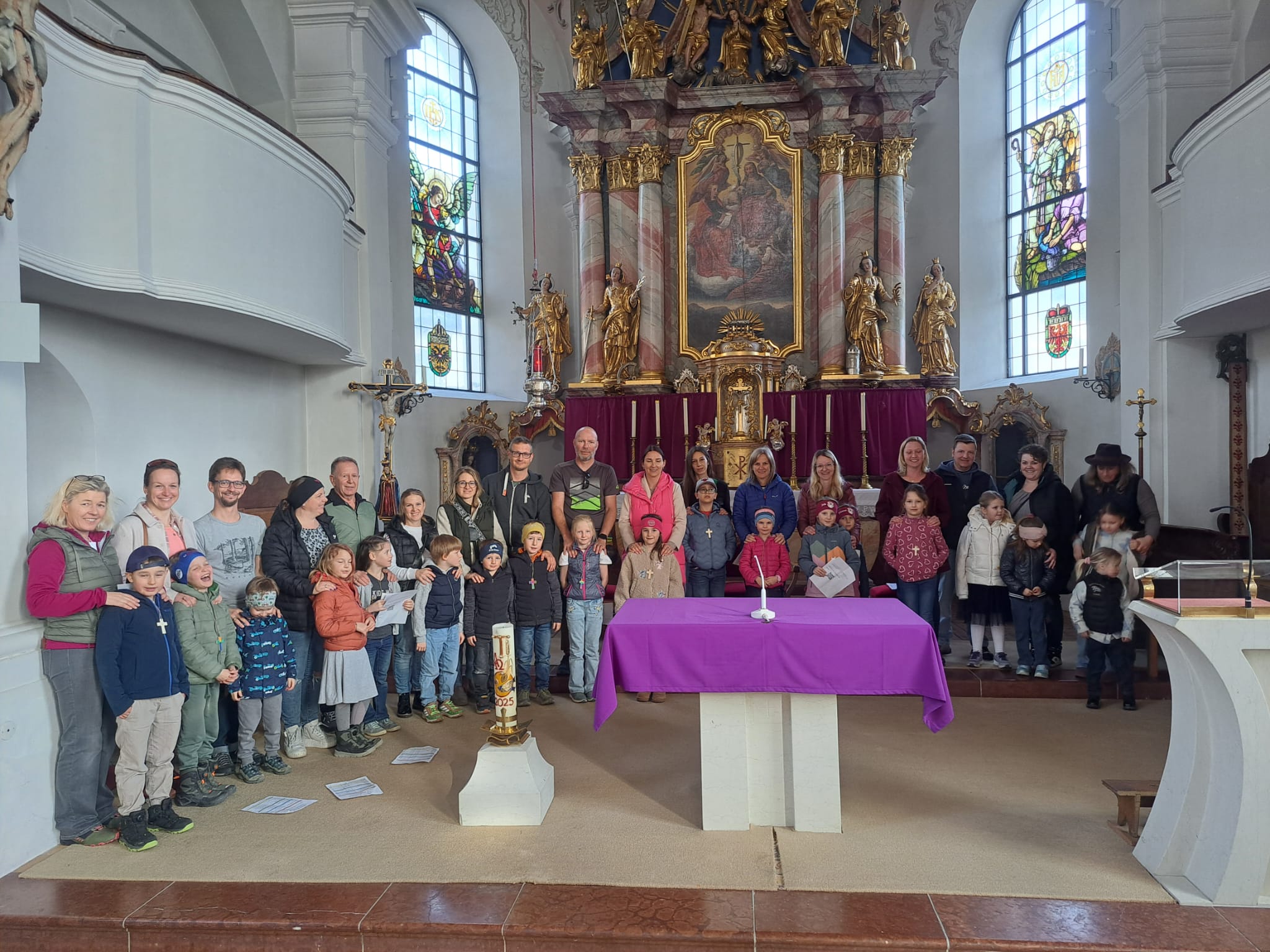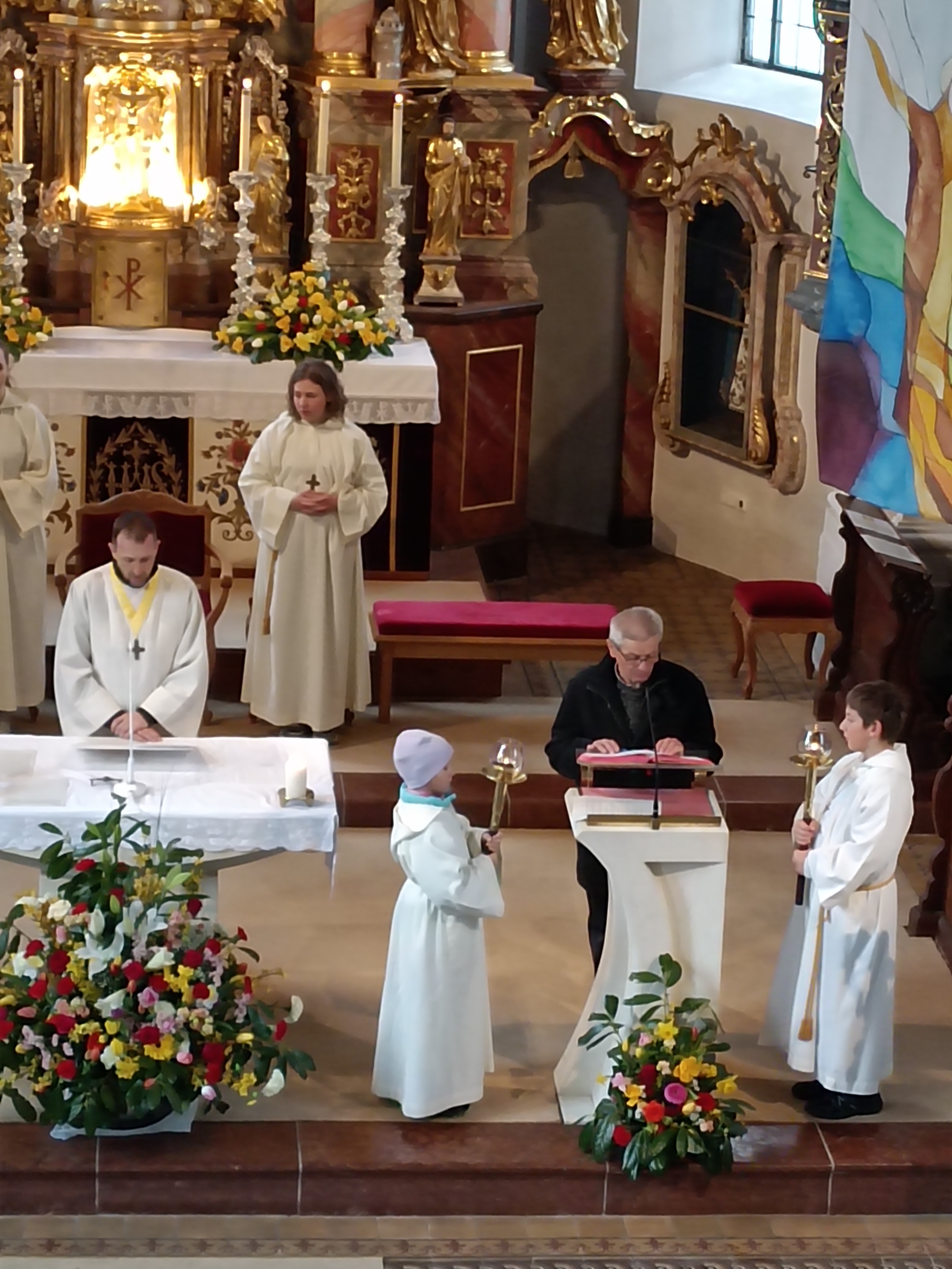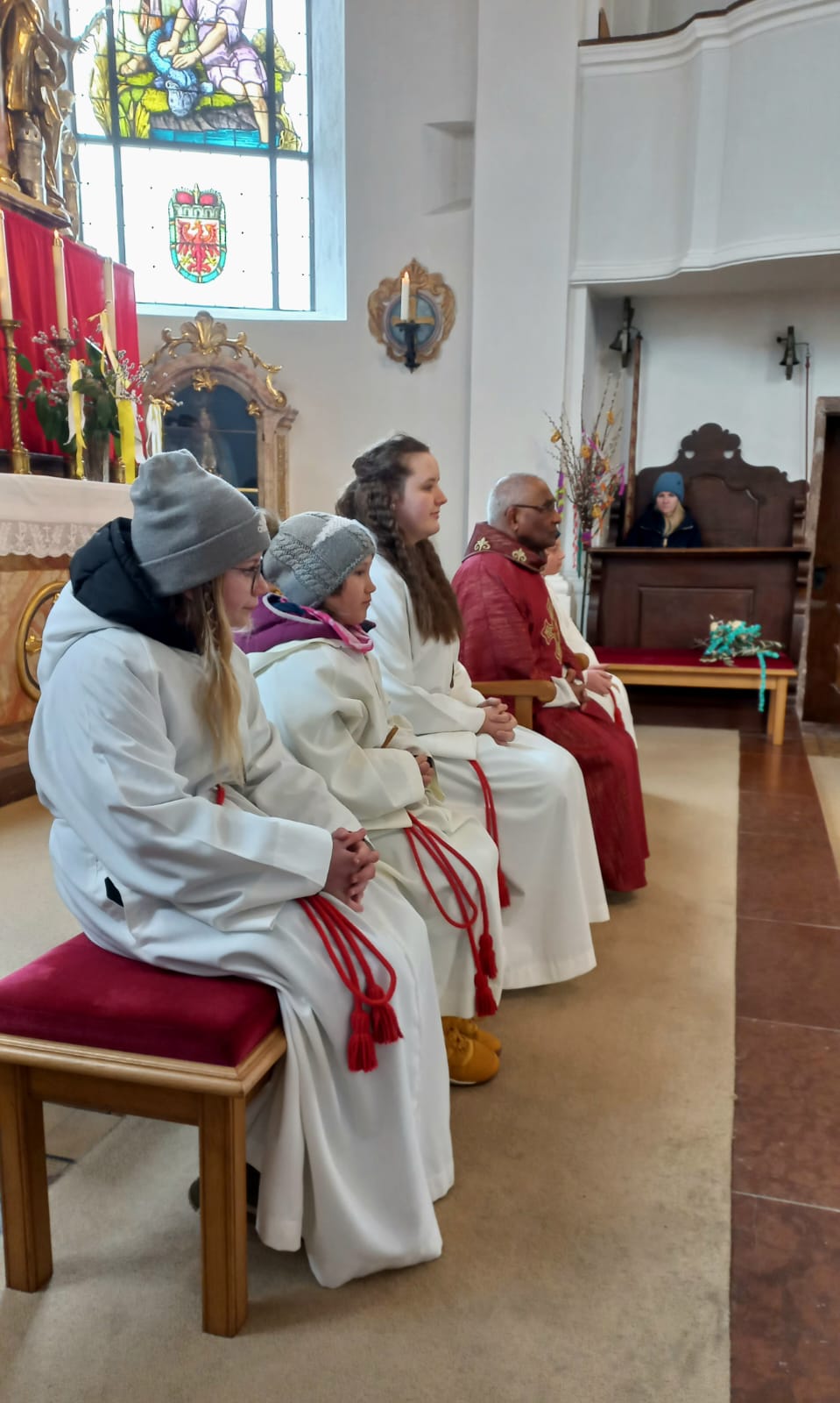 Im Anschluss zog die Prozession gemeinsam in die Kirche ein, wo der festliche Gottesdienst zum Palmsonntag gefeiert wurde. In der wohligen Wärme setzte sich die Feier in einem würdigen Rahmen fort. Die Lesung der Passion und die feierliche Liturgie erinnerten eindrucksvoll an den Beginn der Karwoche. Das feierliche Orgelspiel verlieh der Festmesse eine besonders würdige und festliche Atmosphäre.
