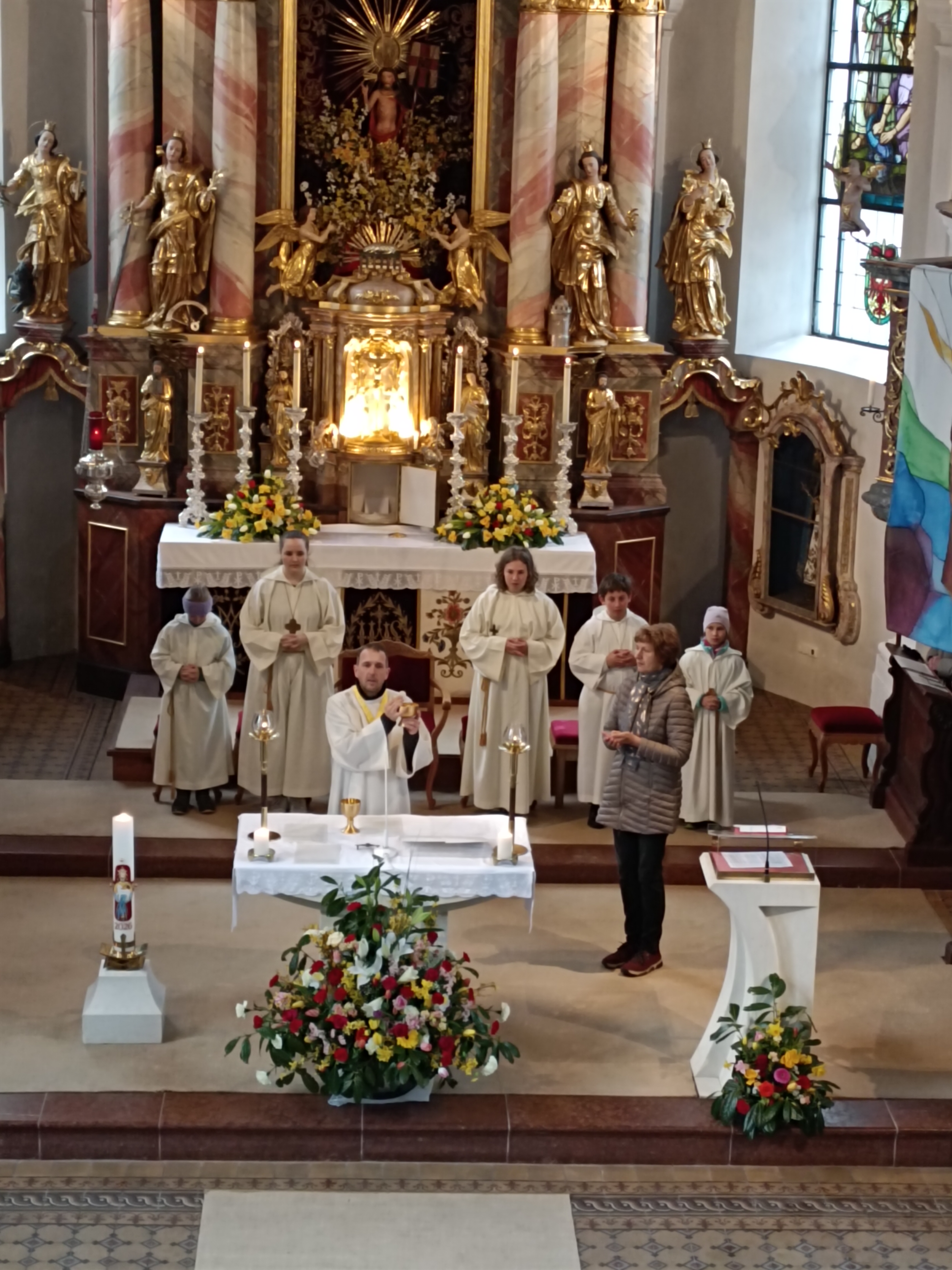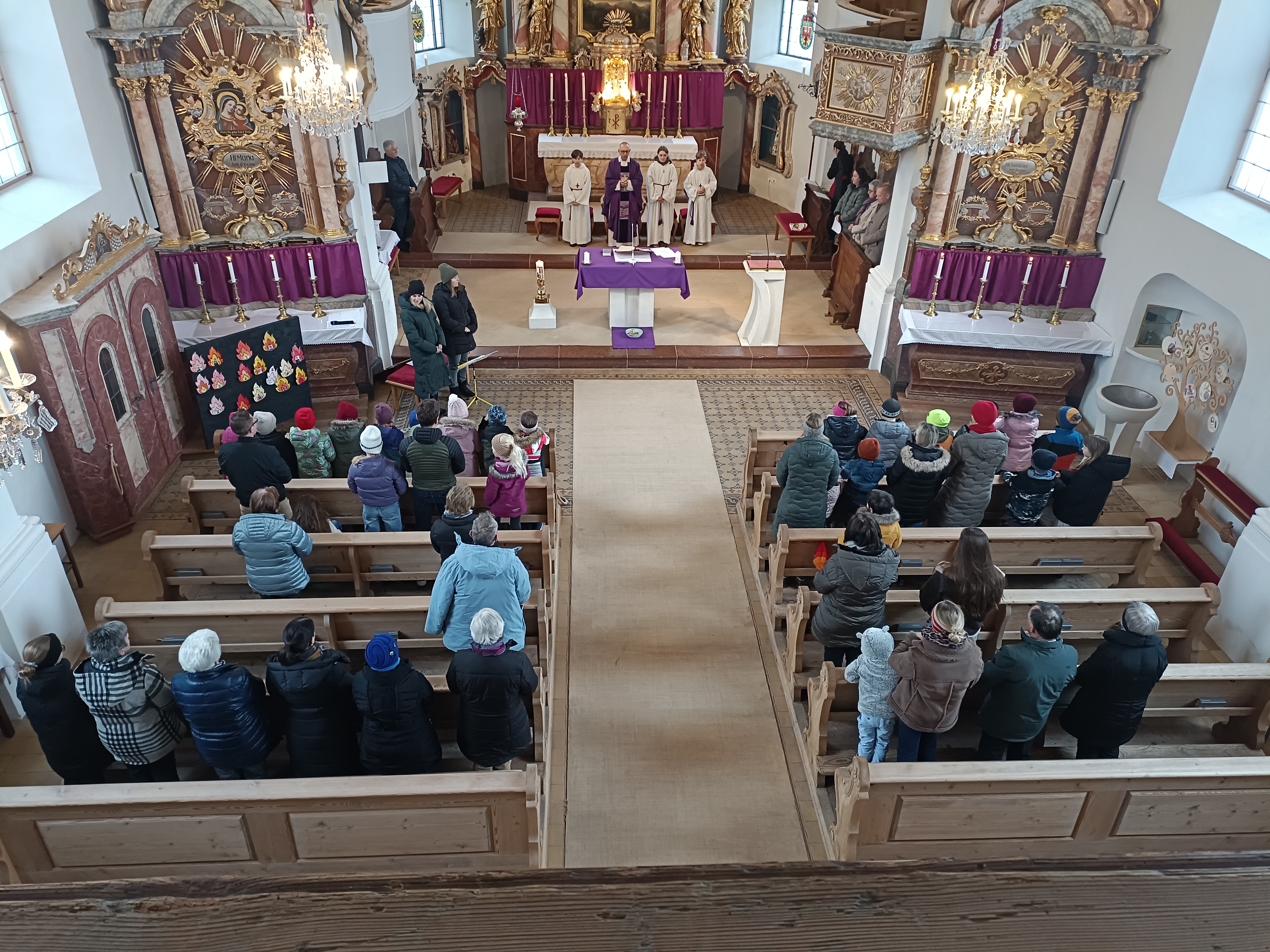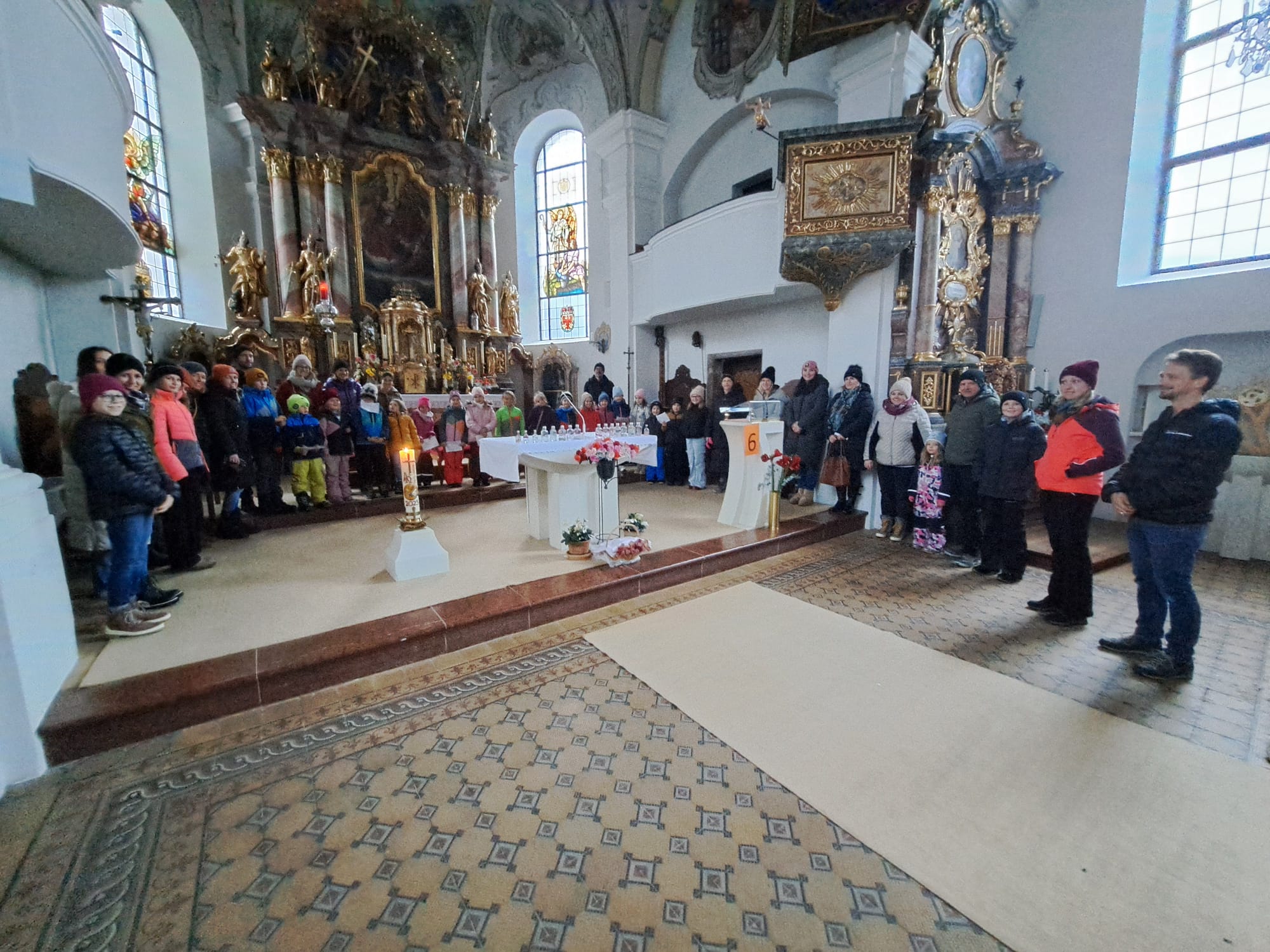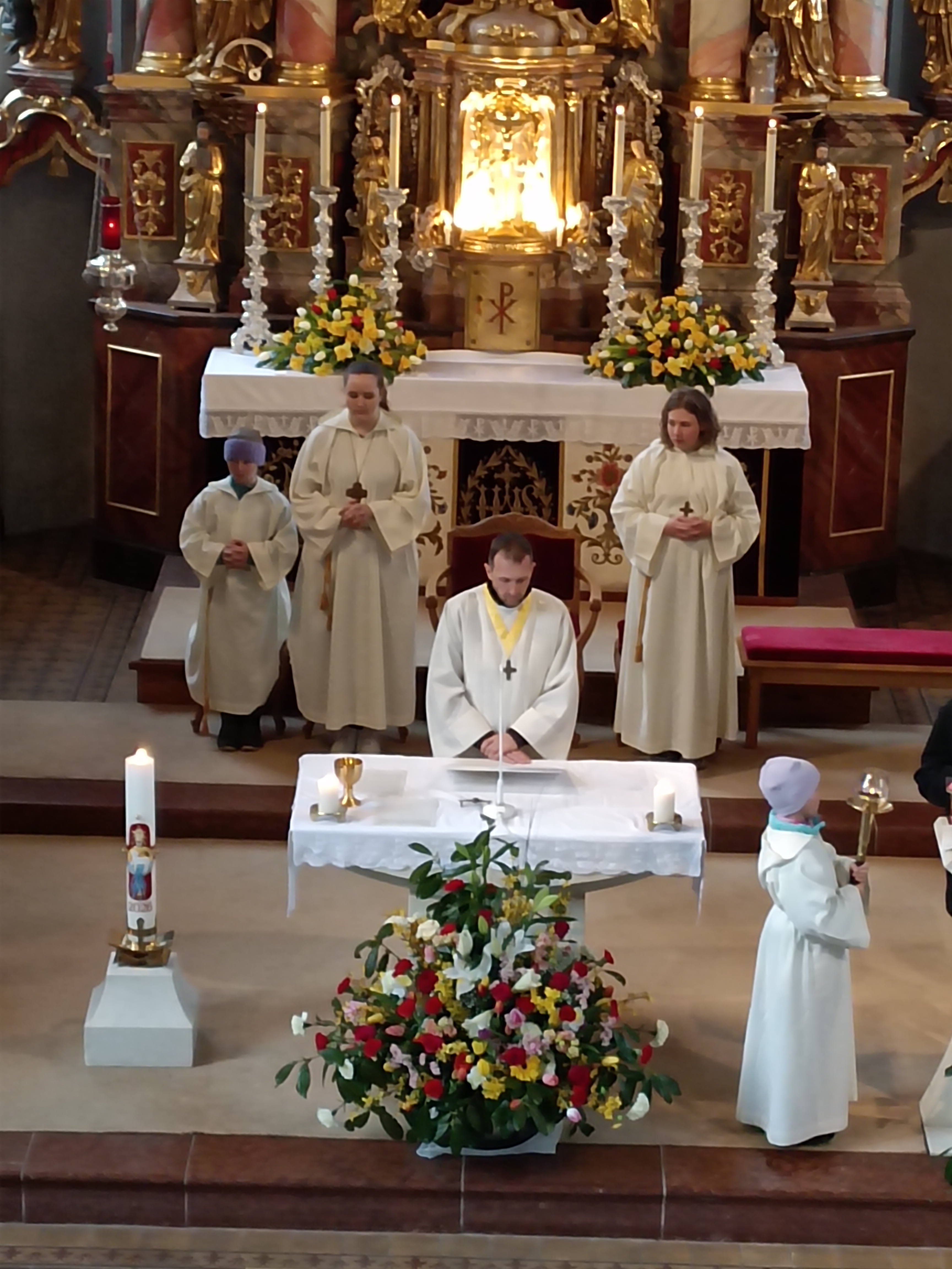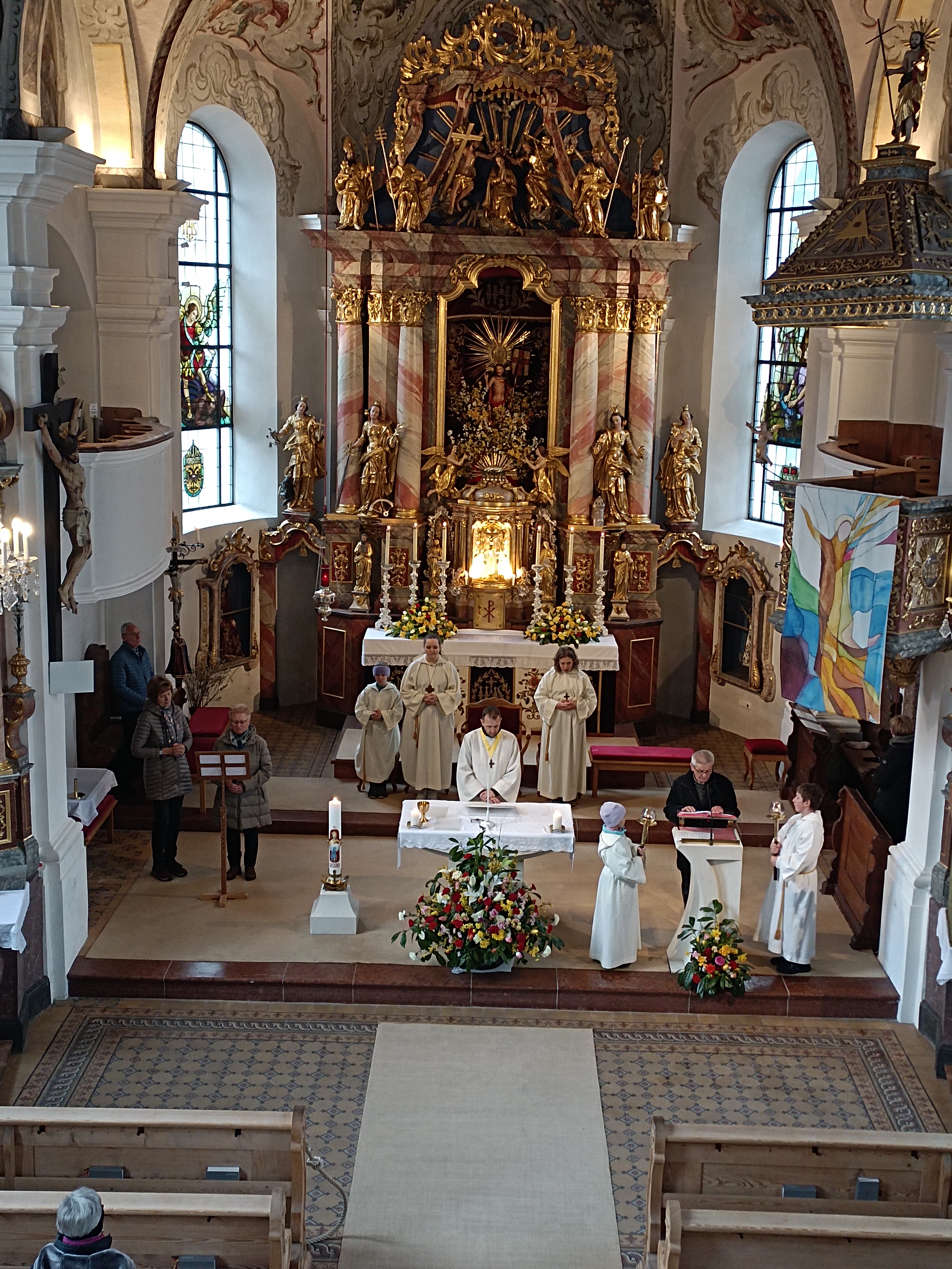 Im Anschluss zog die Prozession gemeinsam in die Kirche ein, wo der festliche Gottesdienst zum Palmsonntag gefeiert wurde. In der wohligen Wärme setzte sich die Feier in einem würdigen Rahmen fort. Die Lesung der Passion und die feierliche Liturgie erinnerten eindrucksvoll an den Beginn der Karwoche. Das feierliche Orgelspiel verlieh der Festmesse eine besonders würdige und festliche Atmosphäre.