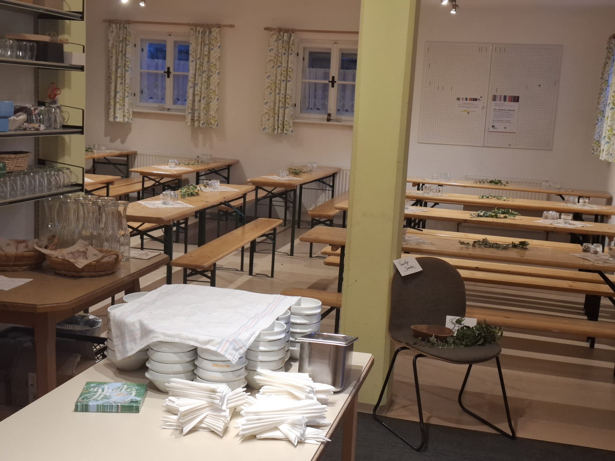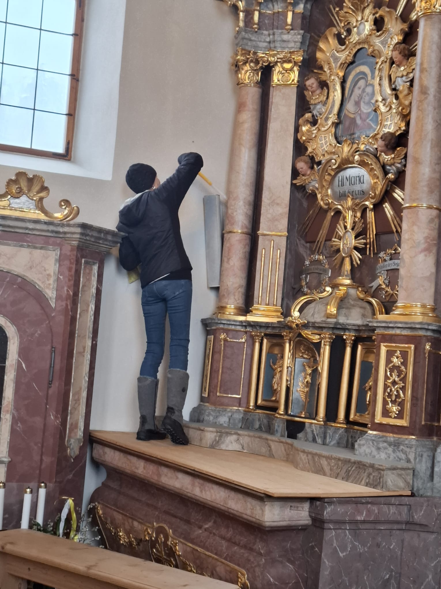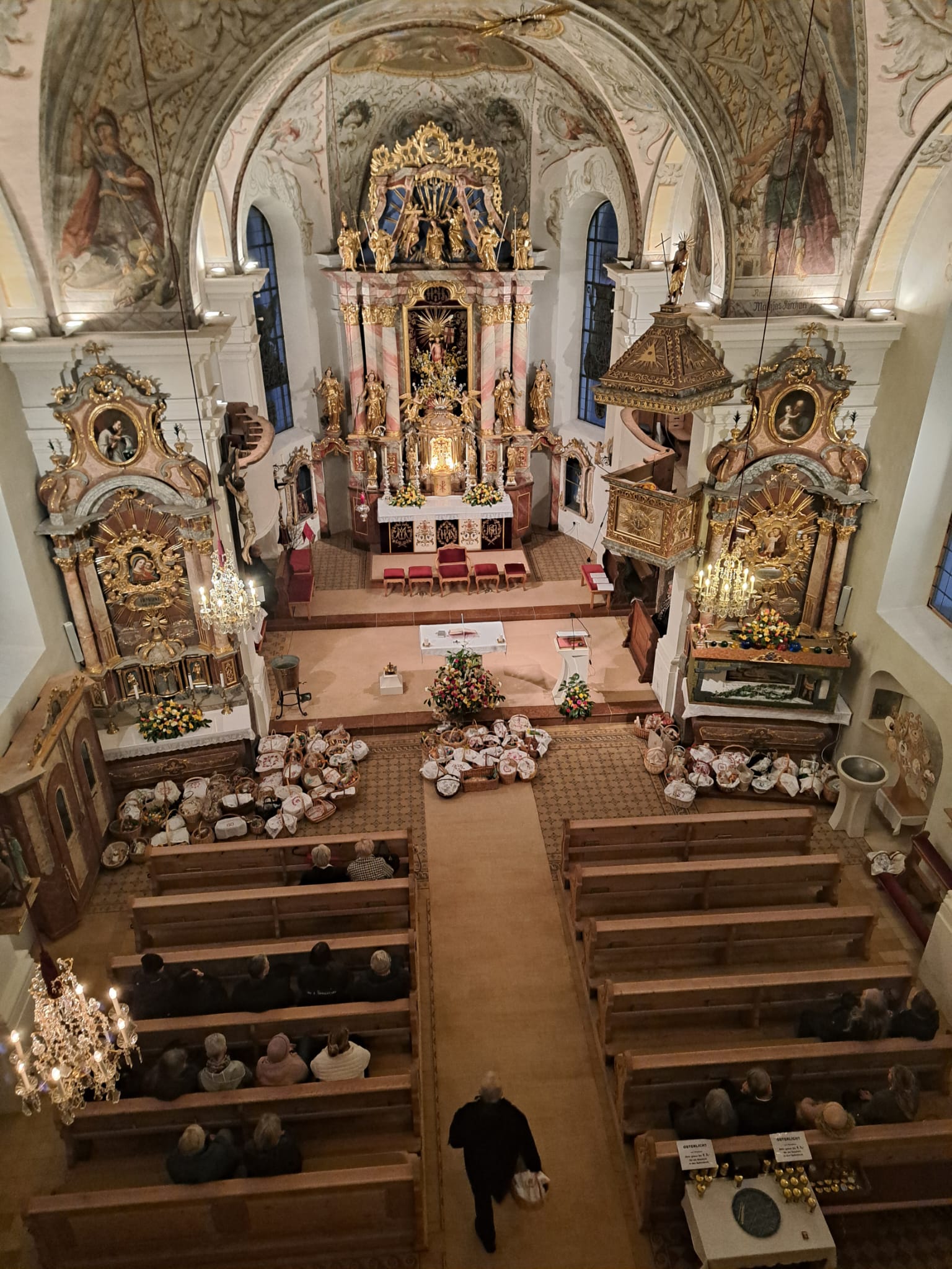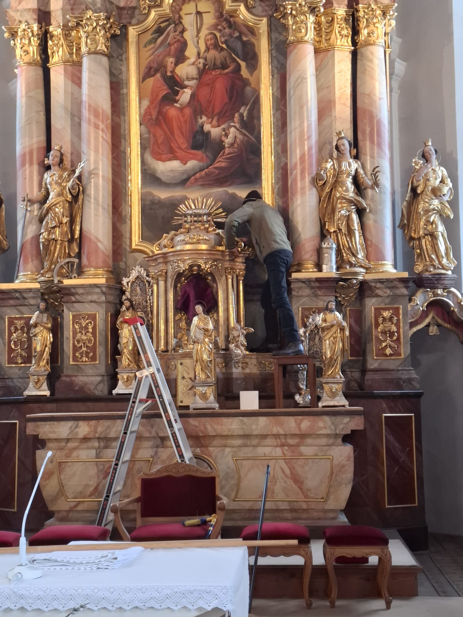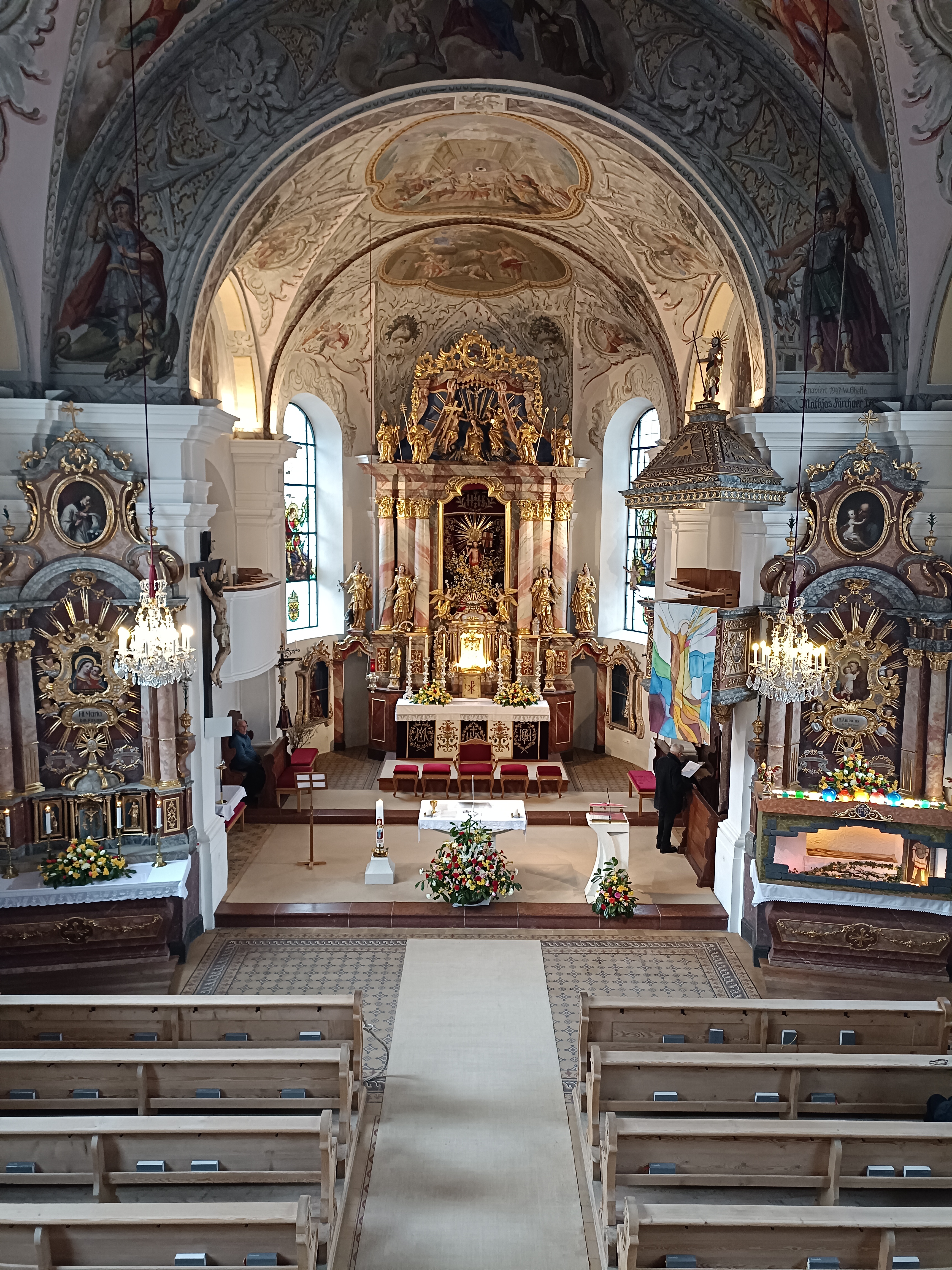 Am Dienstag vor Ostern wird die Kirche geputzt. Freiwillige Helfer*innen bringen sie auf Hochglanz. Zur Belohnung gibt es im Pfarrheim Suppe mit Würsteln, gespendet von Vroni Niederacher.
