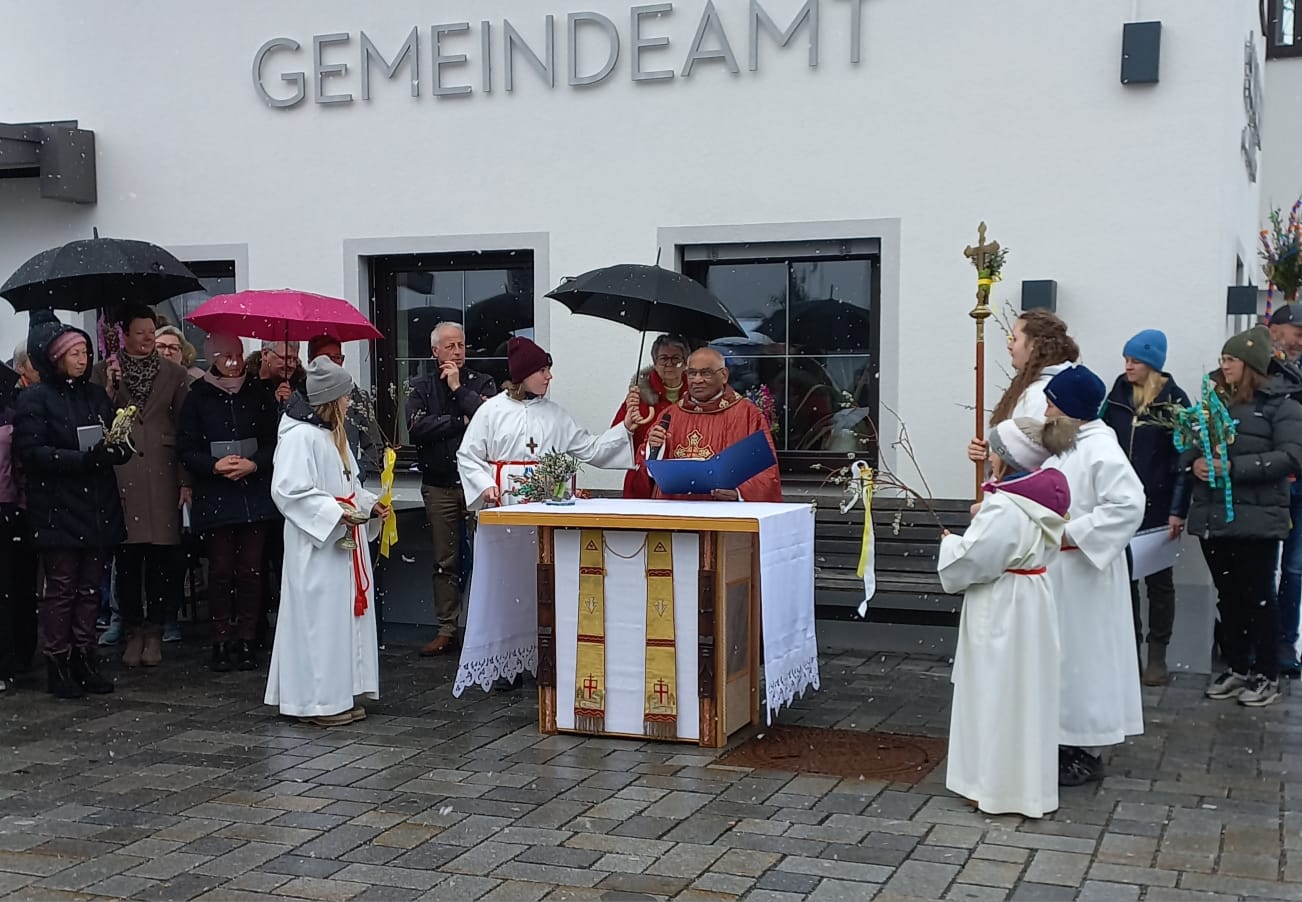 Die Osterwoche beginnt mit dem Palmsonntag. An diesem Tag erinnern Christen an den Einzug Jesu in Jerusalem. Vor dem Gemeindehaus segnete Pfarrer Ignaci Siluvai die Palmzweige. Danach zogen alle gemeinsam in die Kirche ein, musikalisch begleitet von den Bläsern der BMK, der Orgel und dem Kirchenchor.