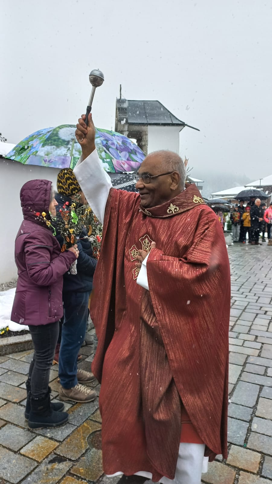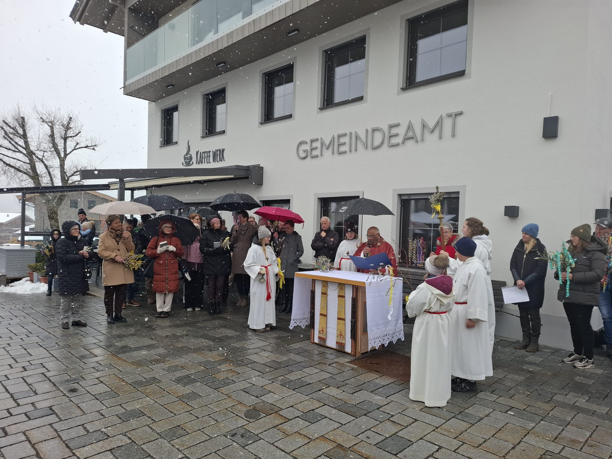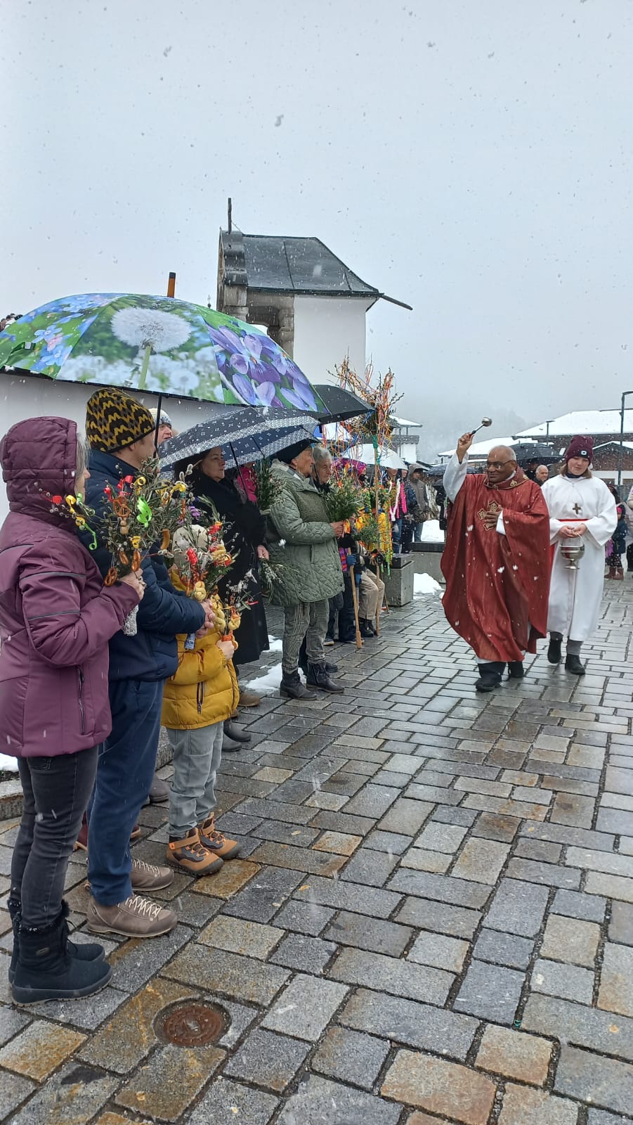 Palmsonntag – und statt frühlingshafter Temperaturen fielen Schneeflocken. Trotz der winterlichen Kälte fand die Palmweihe wie geplant unter freiem Himmel statt und wurde von Msgr. Ignaci Siluvai gemeinsam mit der Pfarrgemeinde feierlich gestaltet. Für die musikalische Umrahmung sorgten die Bläsergruppe der BMK sowie der Kirchenchor.