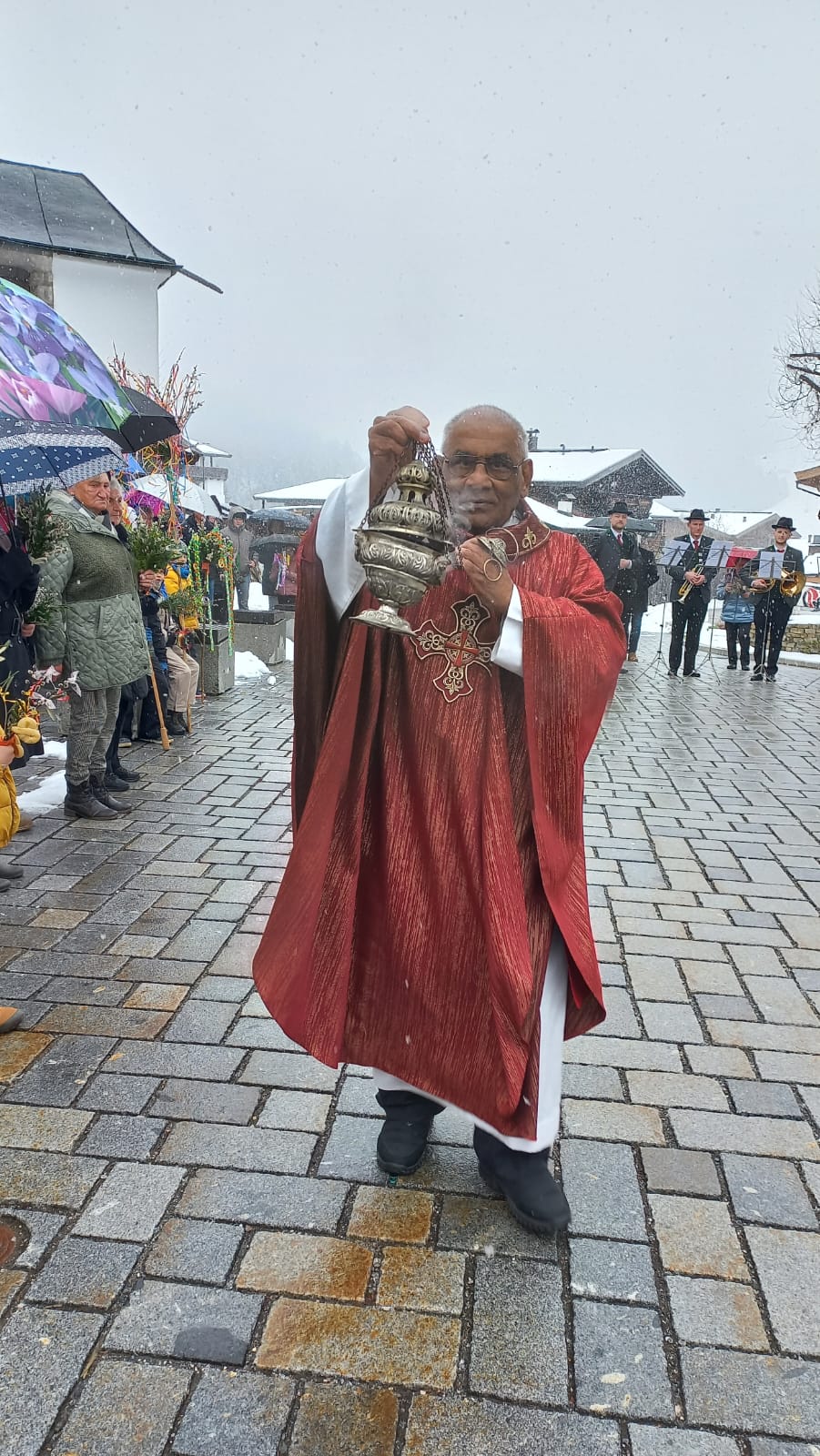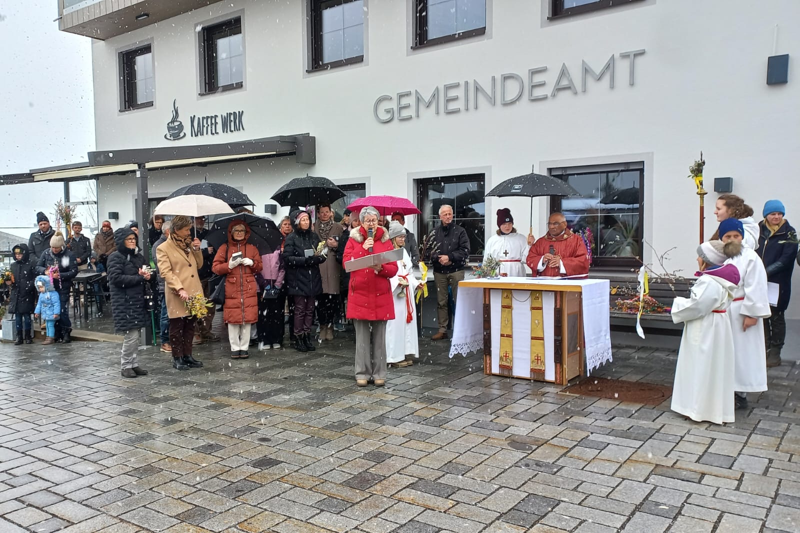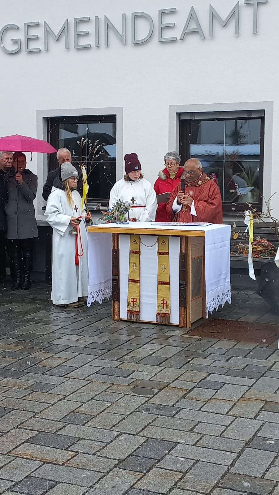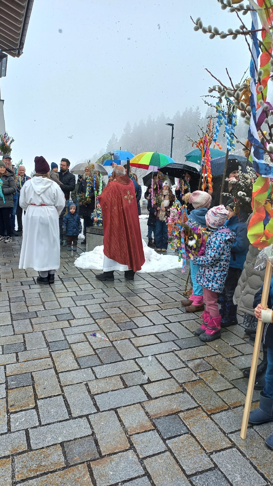 Palmsonntag – und statt frühlingshafter Temperaturen fielen Schneeflocken. Trotz der winterlichen Kälte fand die Palmweihe wie geplant unter freiem Himmel statt und wurde von Msgr. Ignaci Siluvai gemeinsam mit der Pfarrgemeinde feierlich gestaltet. Für die musikalische Umrahmung sorgten die Bläsergruppe der BMK sowie der Kirchenchor.