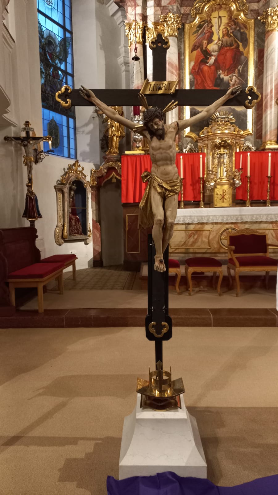 Der Karfreitag ist ein stiller Tag des Gedenkens an Jesu Kreuzigung und Tod. Auch bei uns wird das Evangelium in eindrucksvoller Gestaltung von allen Mitwirkenden vorgetragen. Die Gläubigen verehren das Kreuz mit einer Blume und gedenken in Stille des Leidens Jesu.