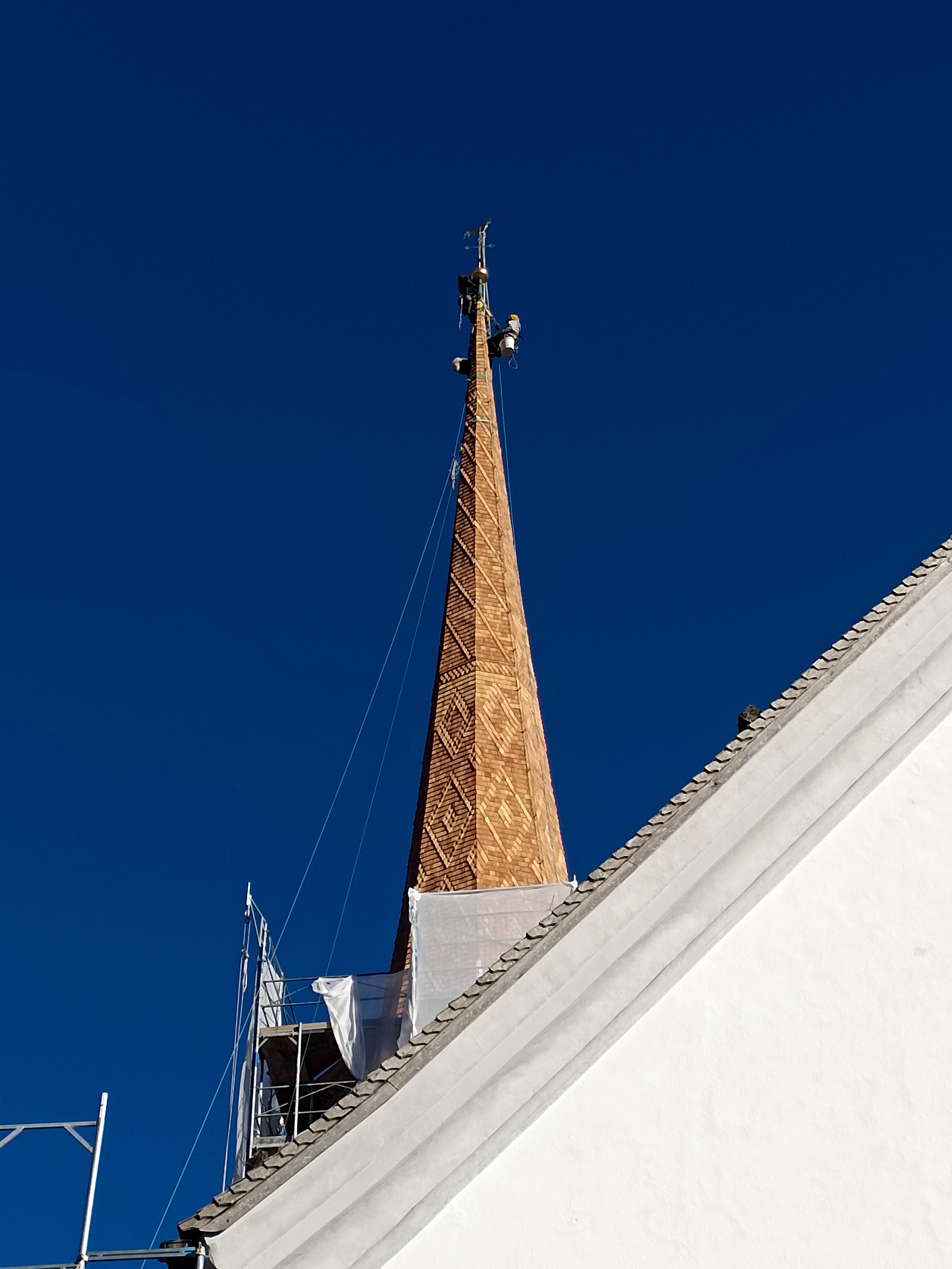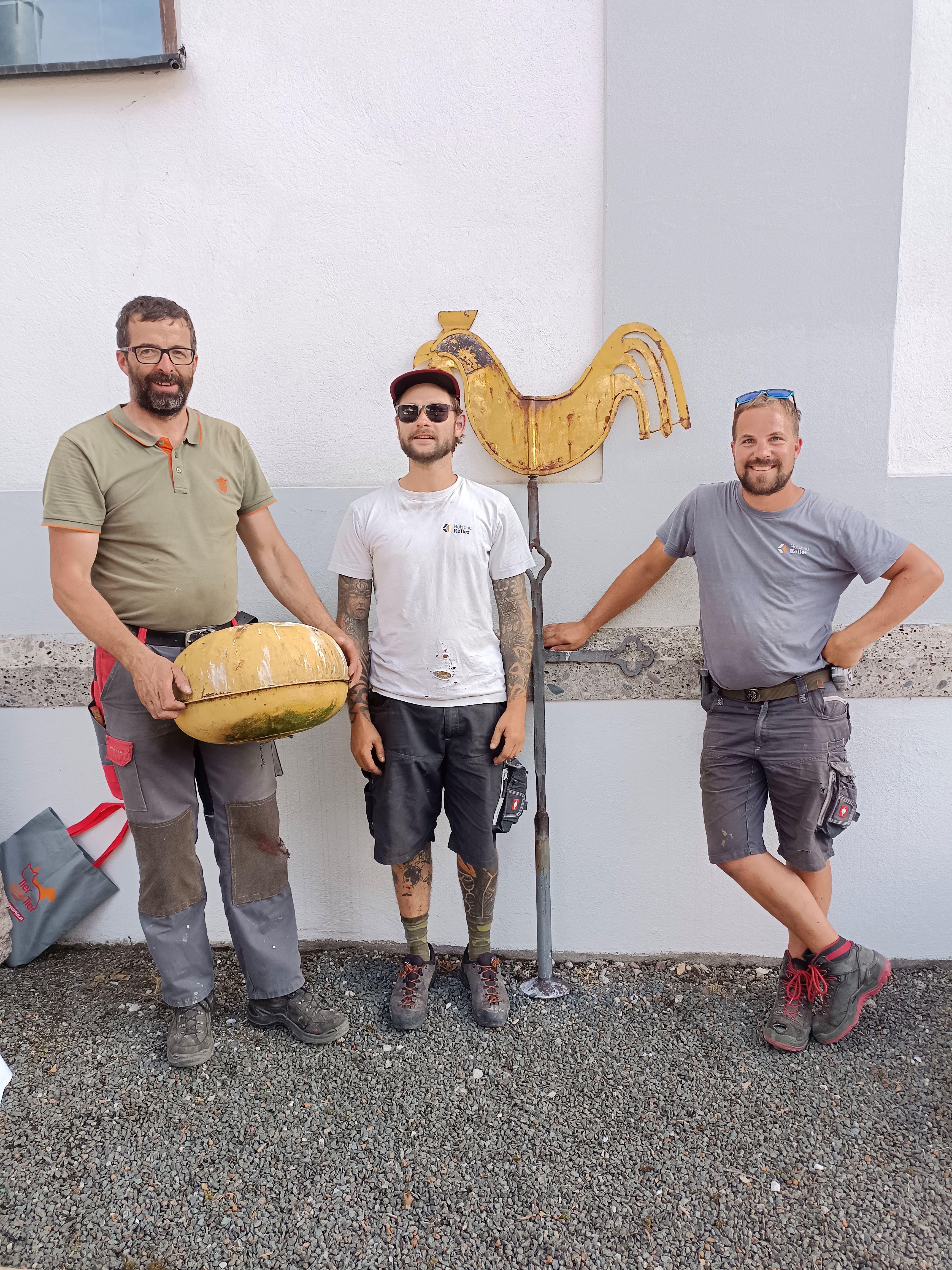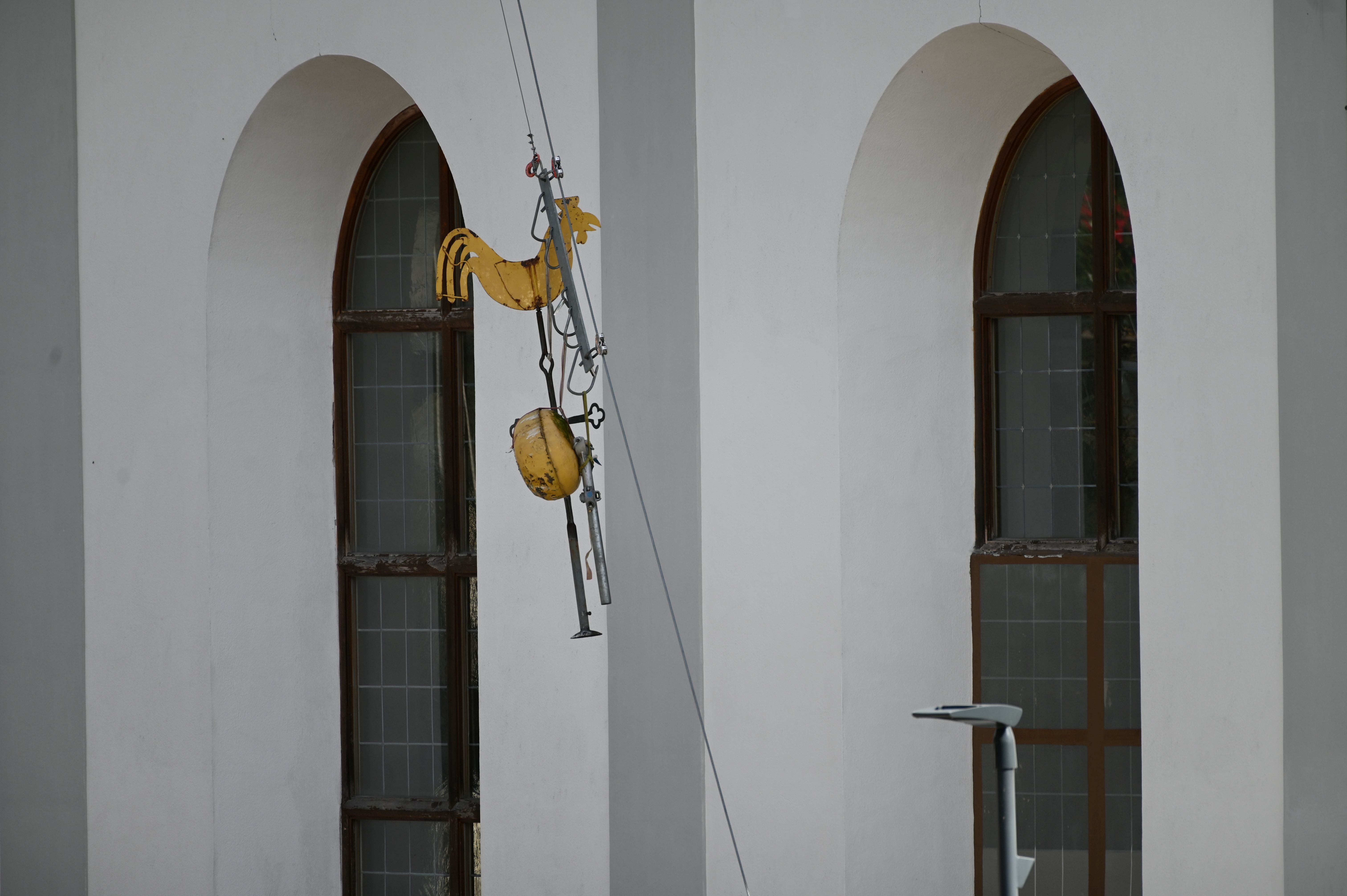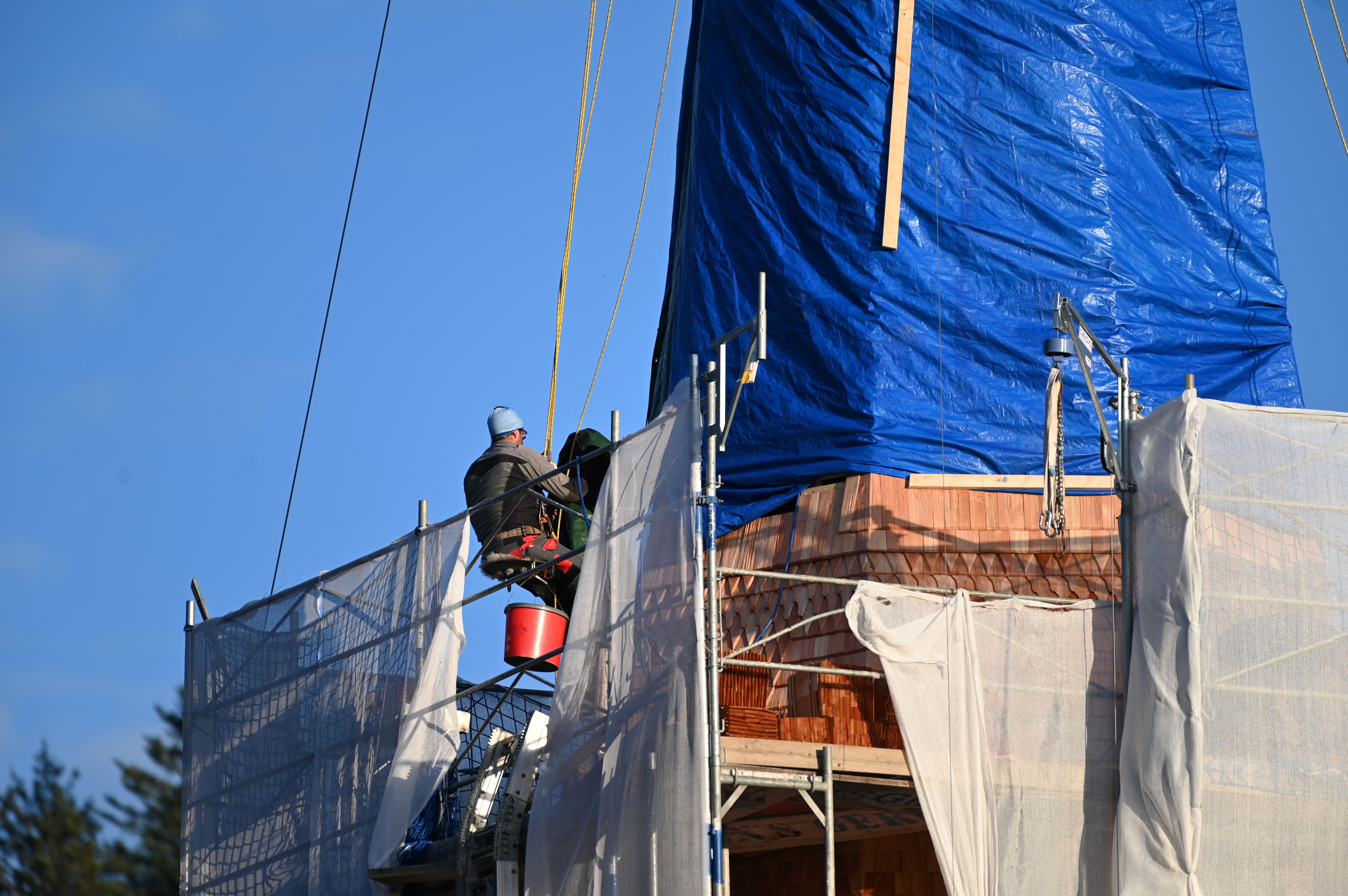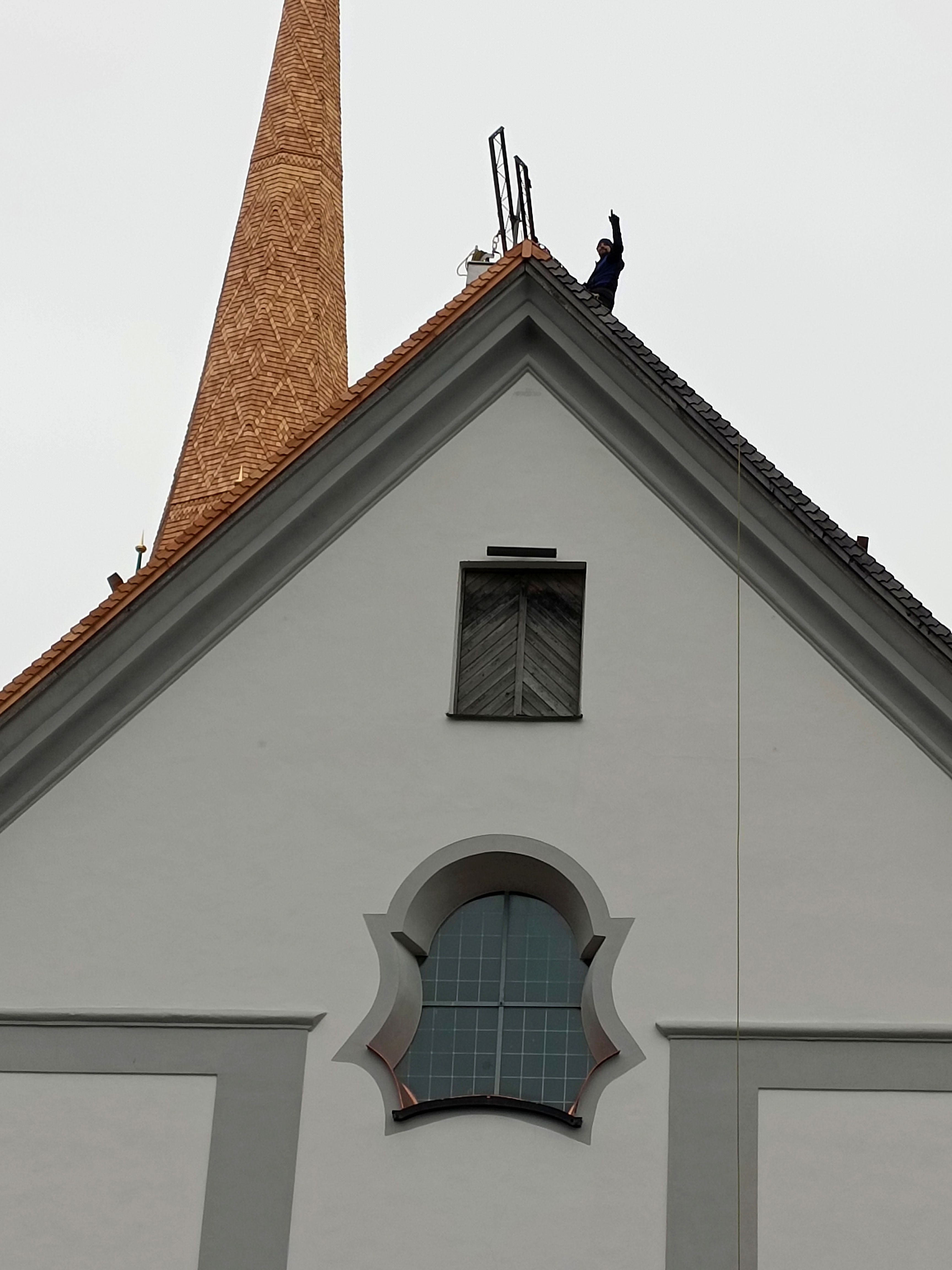 Den Abschluss der Turmarbeiten bildete das Aufsetzen der gesegneten Kreuzkugel mit Kreuz und Wetterhahn. Auch das Kirchendach erhielt neue, langlebige Lärchen-Holzschindeln und ist nun wieder zuverlässig gegen Wind und Wetter geschützt.