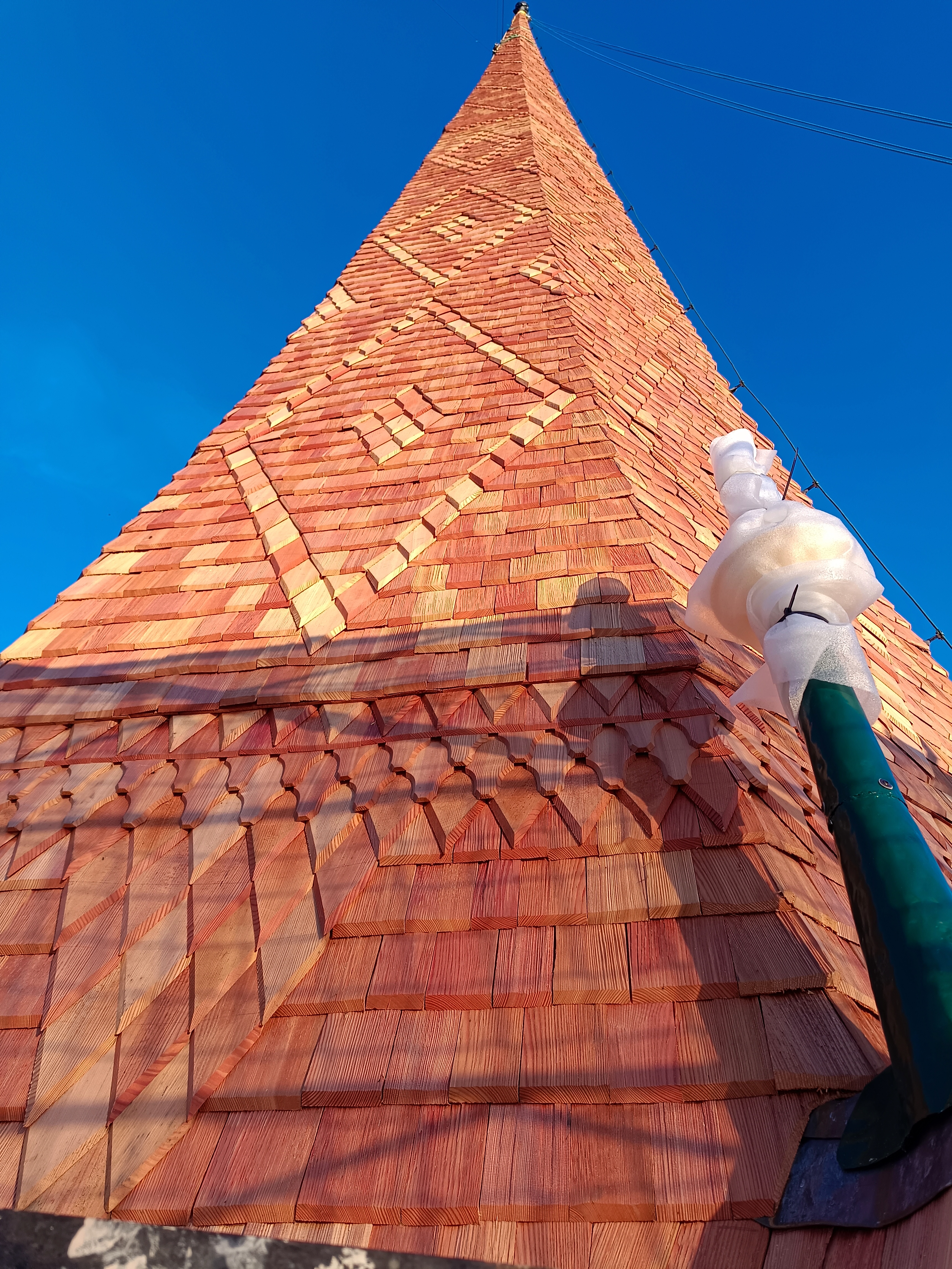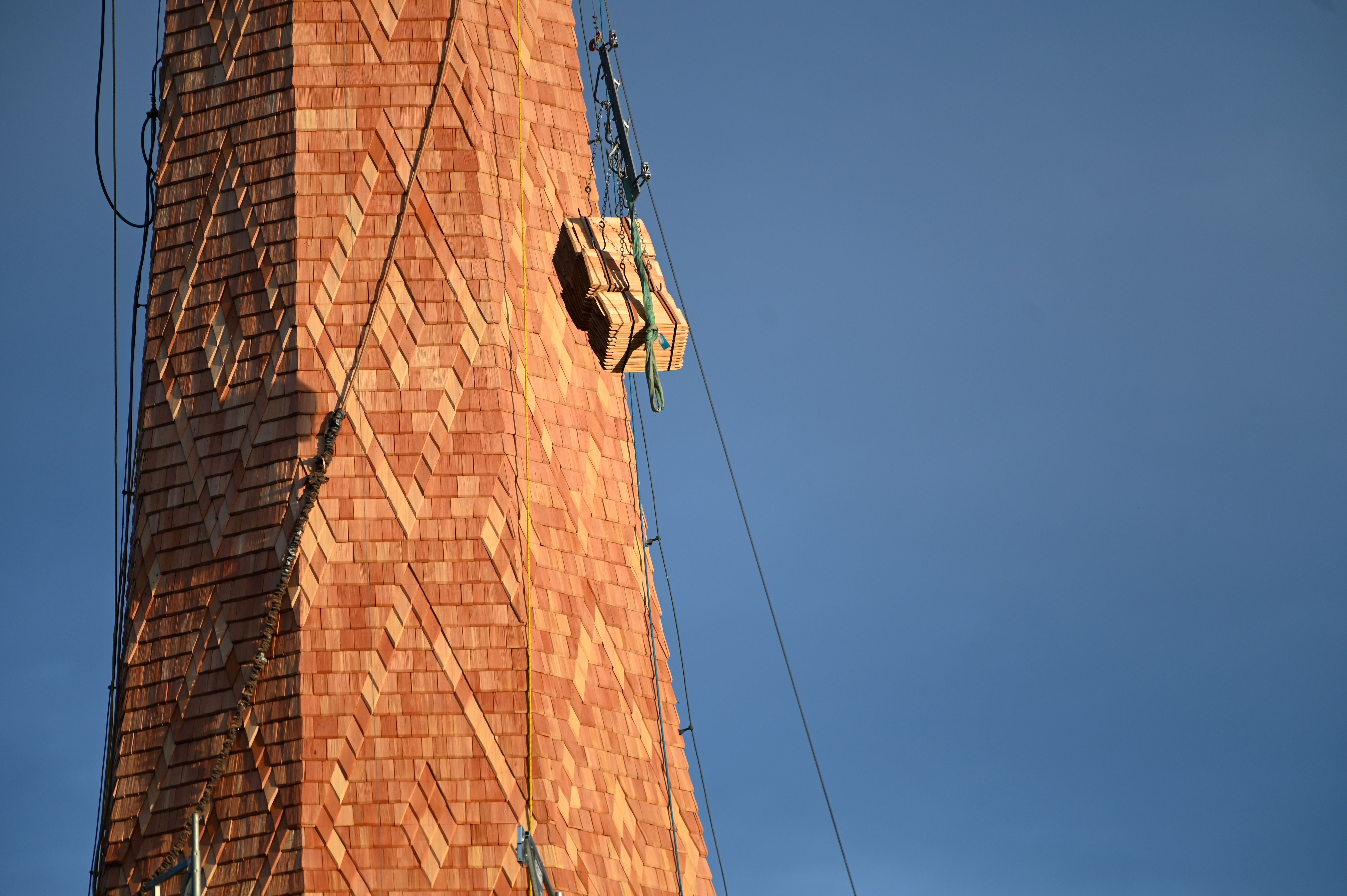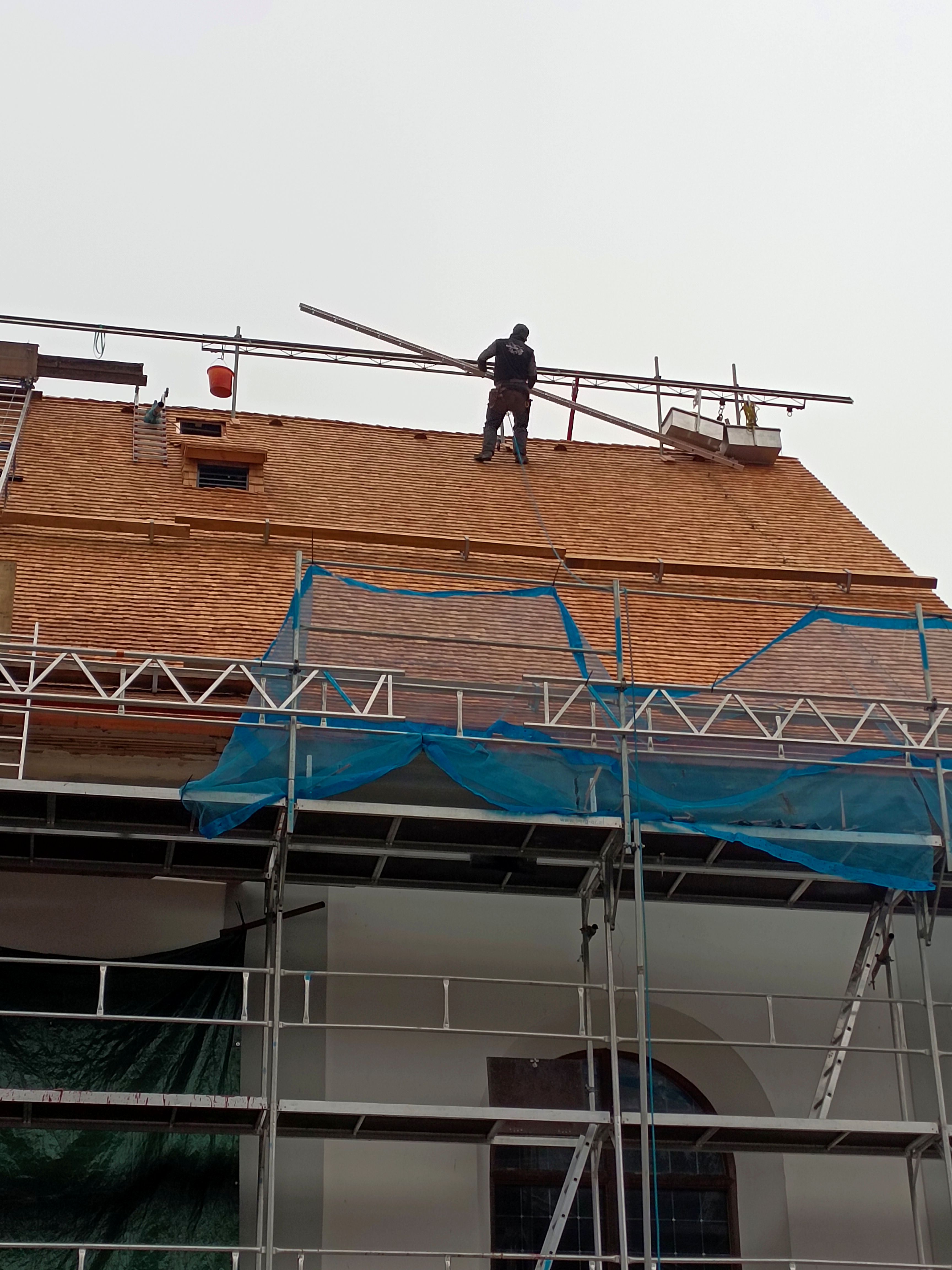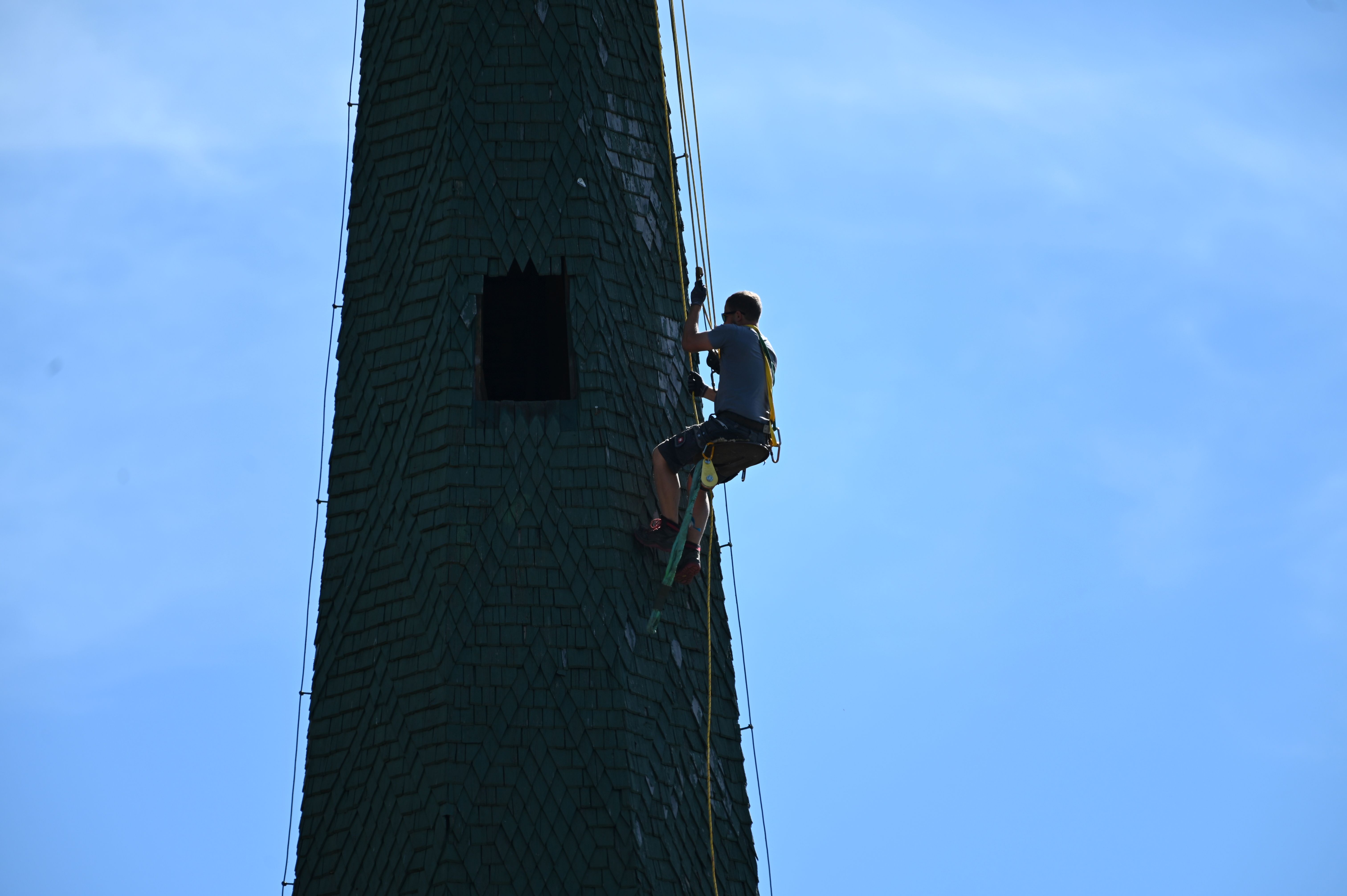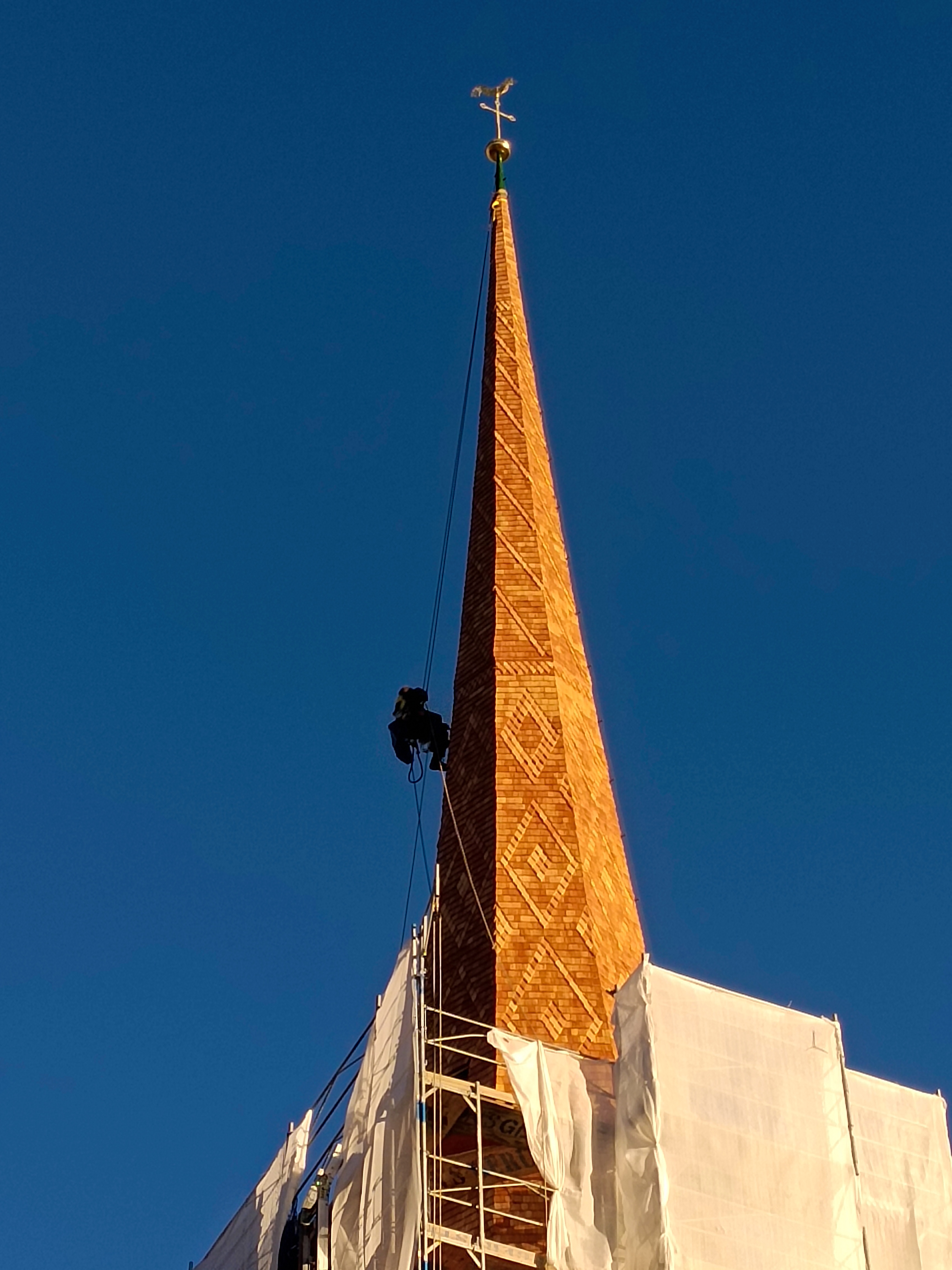 Den Abschluss der Turmarbeiten bildete das Aufsetzen der gesegneten Kreuzkugel mit Kreuz und Wetterhahn. Auch das Kirchendach erhielt neue, langlebige Lärchen-Holzschindeln und ist nun wieder zuverlässig gegen Wind und Wetter geschützt.