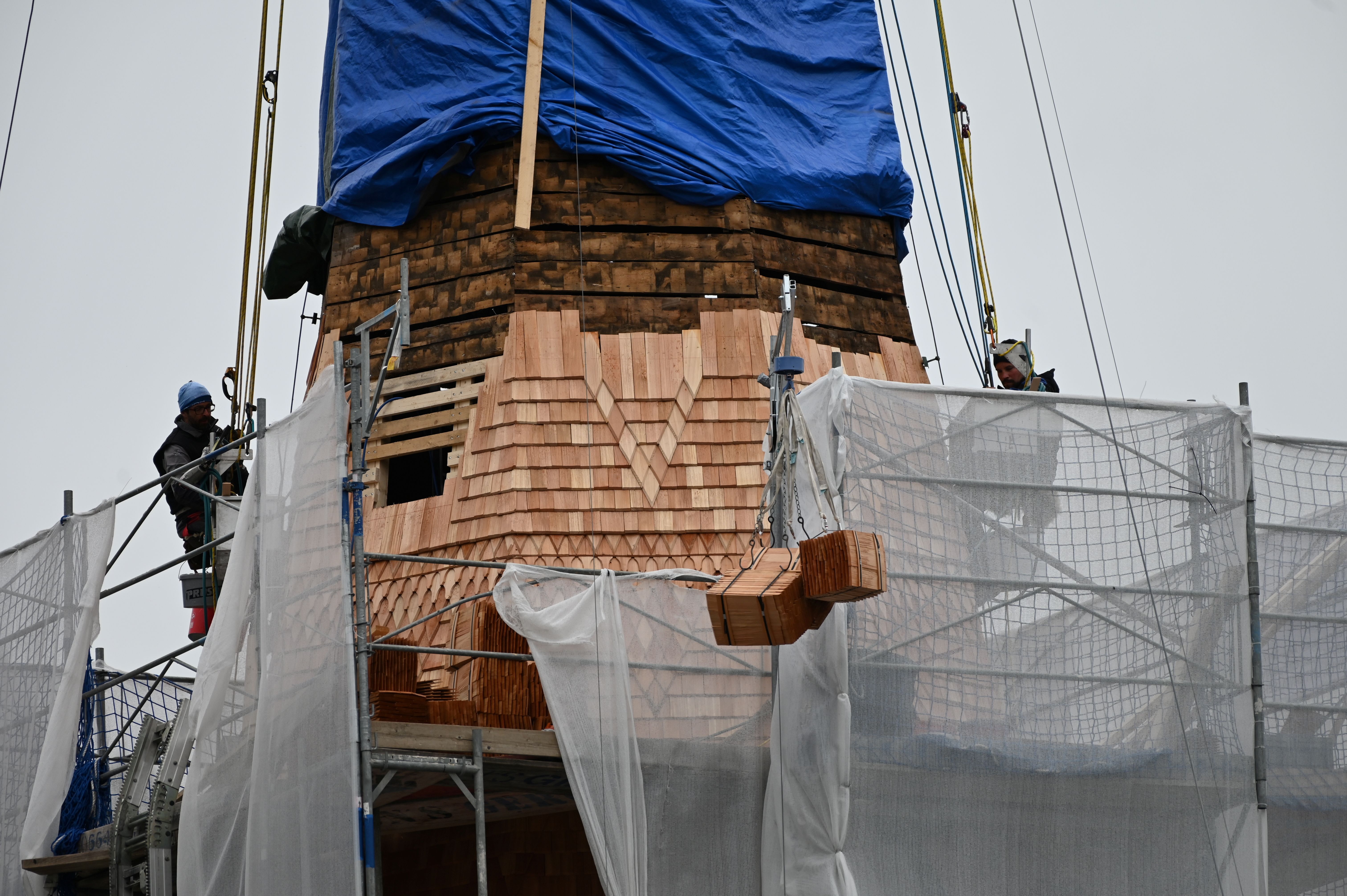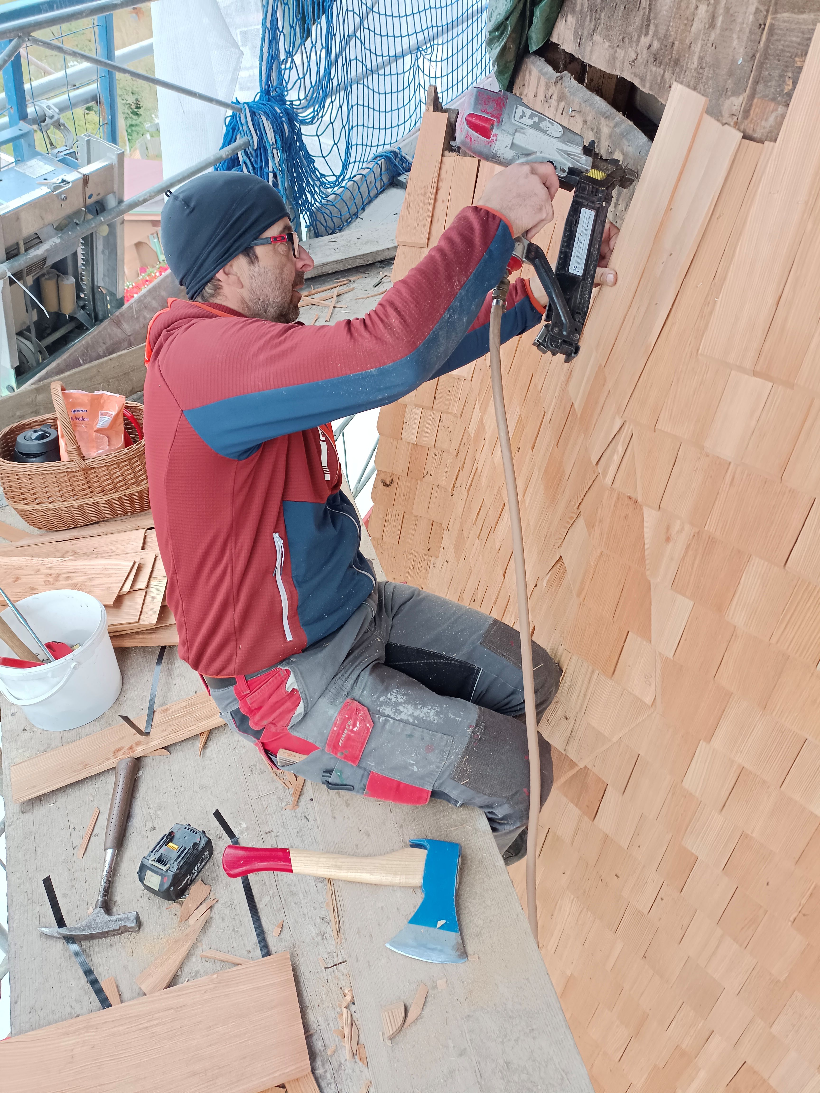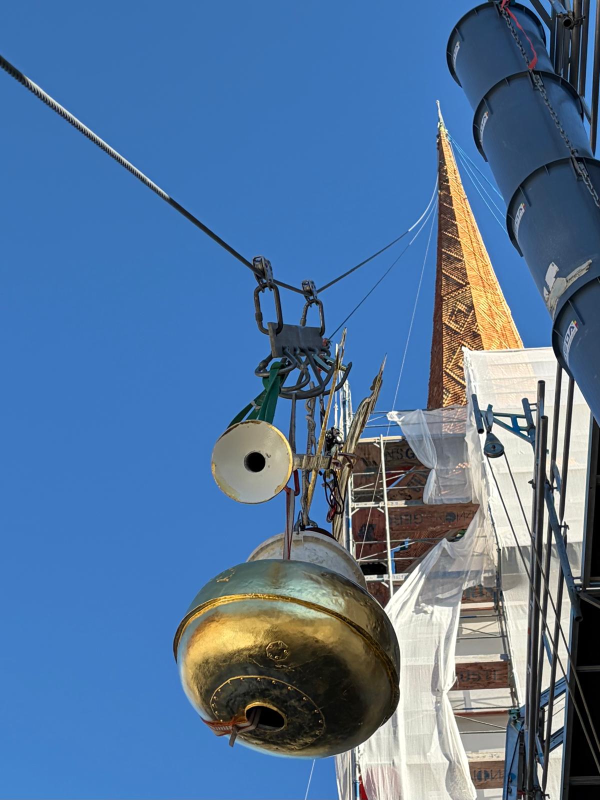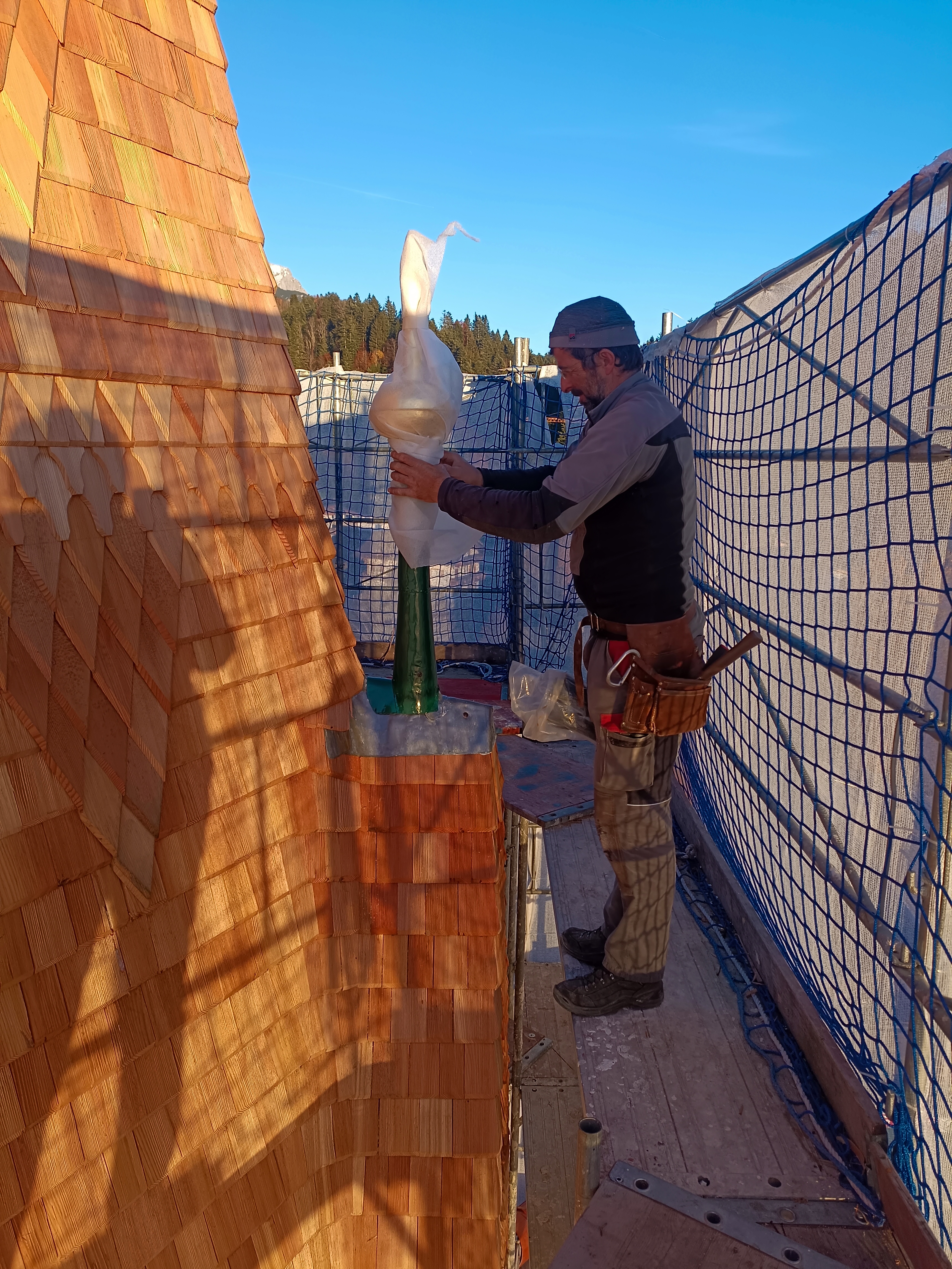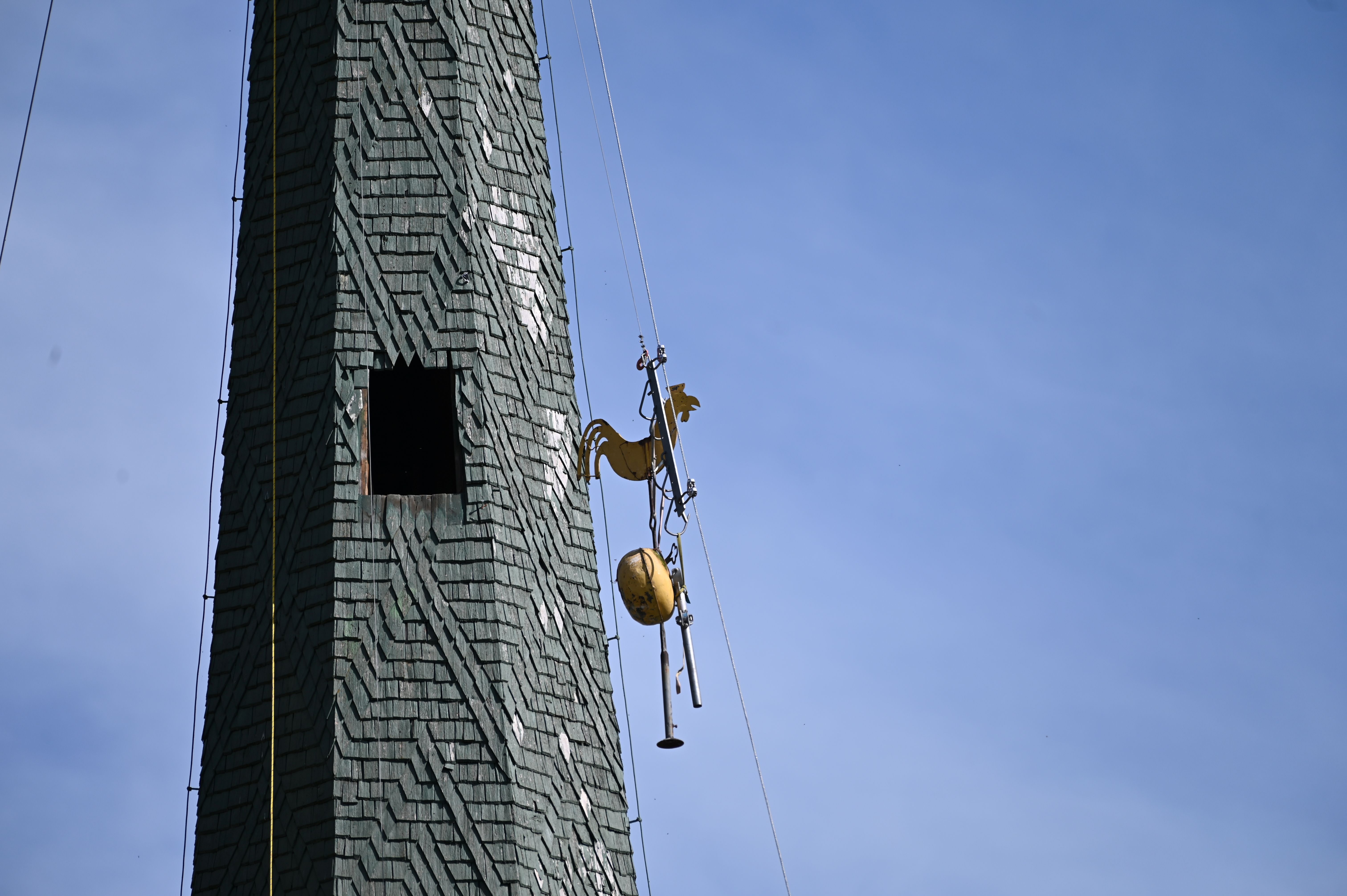 Den Abschluss der Turmarbeiten bildete das Aufsetzen der gesegneten Kreuzkugel mit Kreuz und Wetterhahn. Auch das Kirchendach erhielt neue, langlebige Lärchen-Holzschindeln und ist nun wieder zuverlässig gegen Wind und Wetter geschützt.