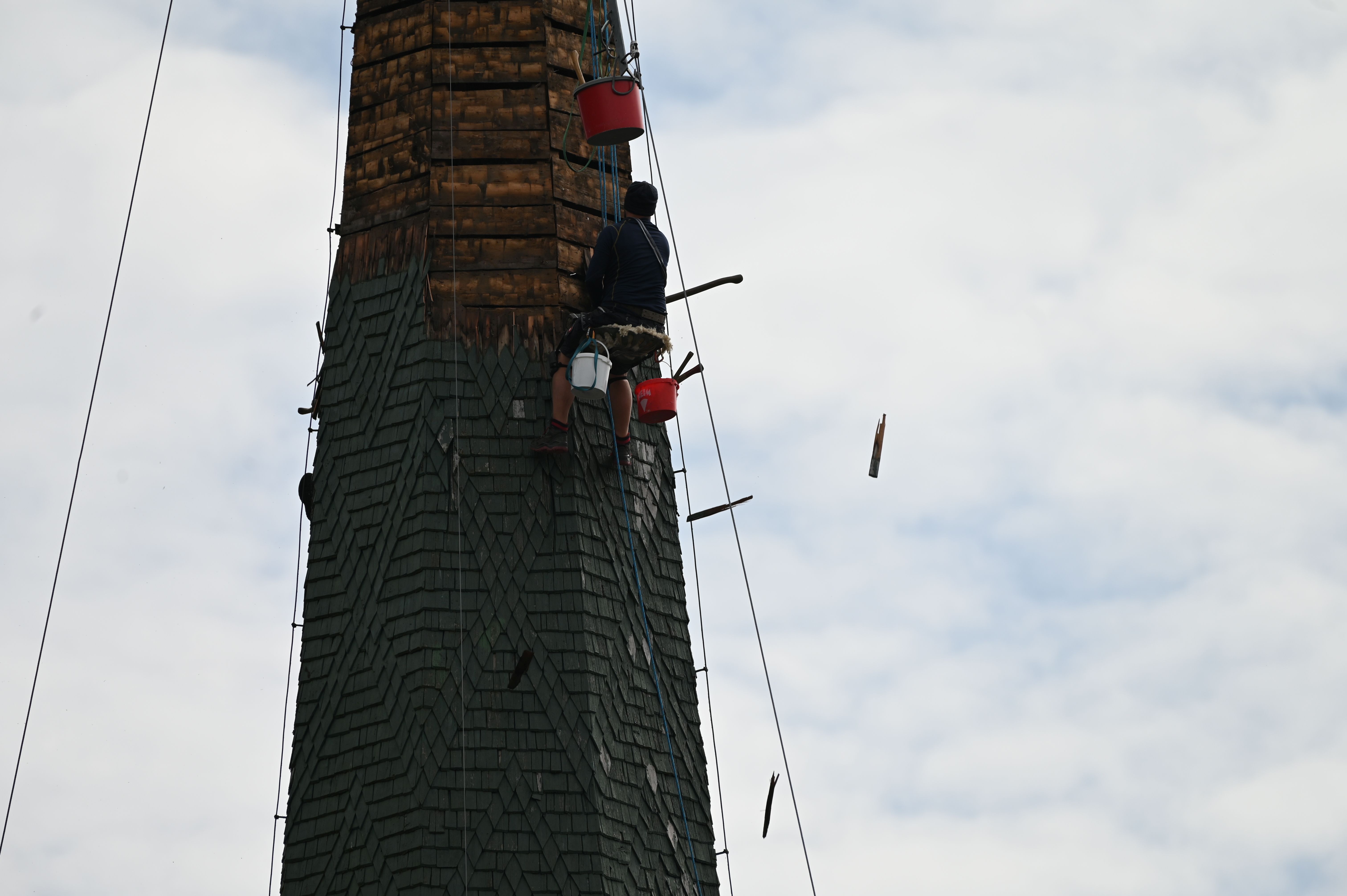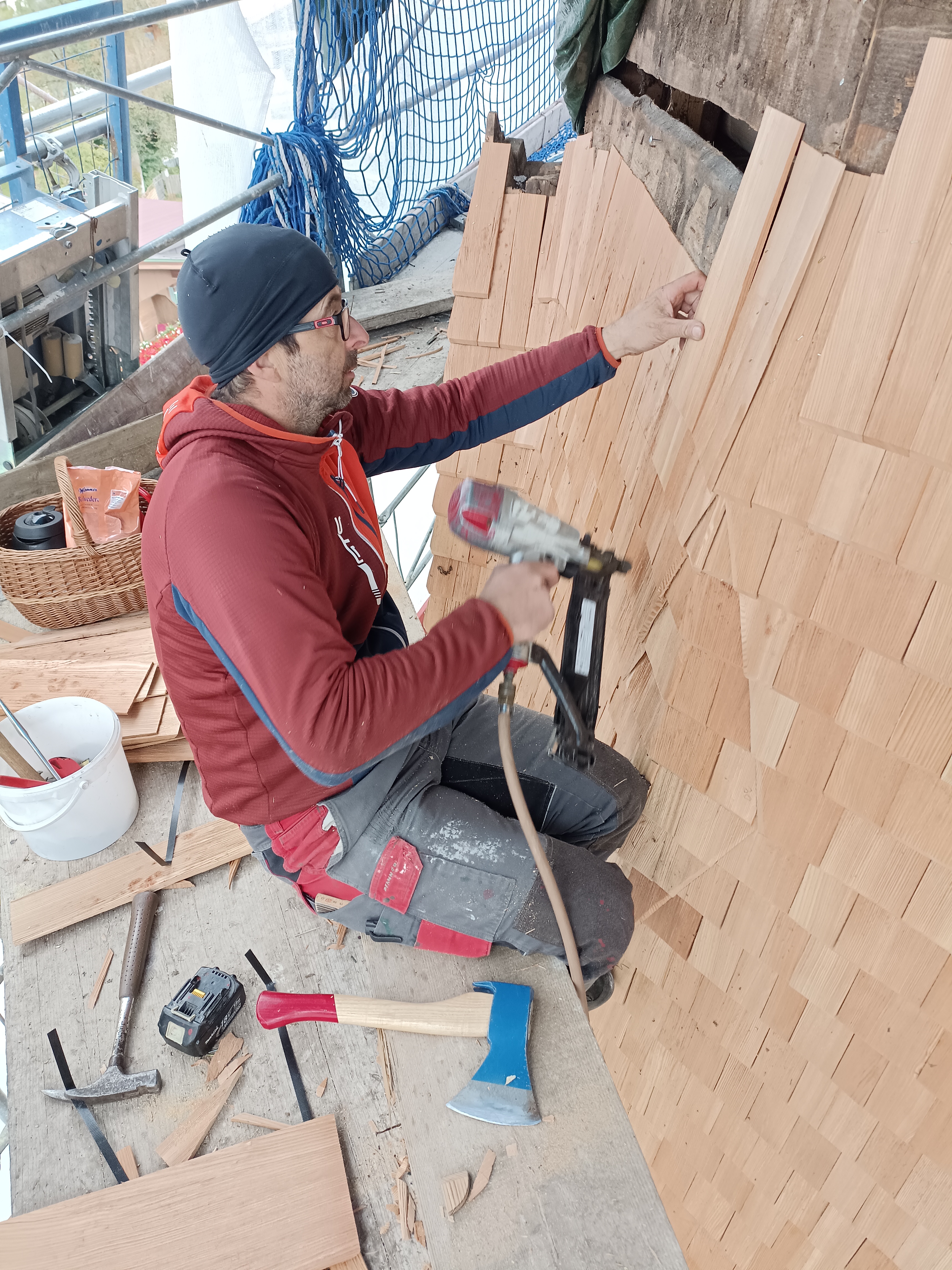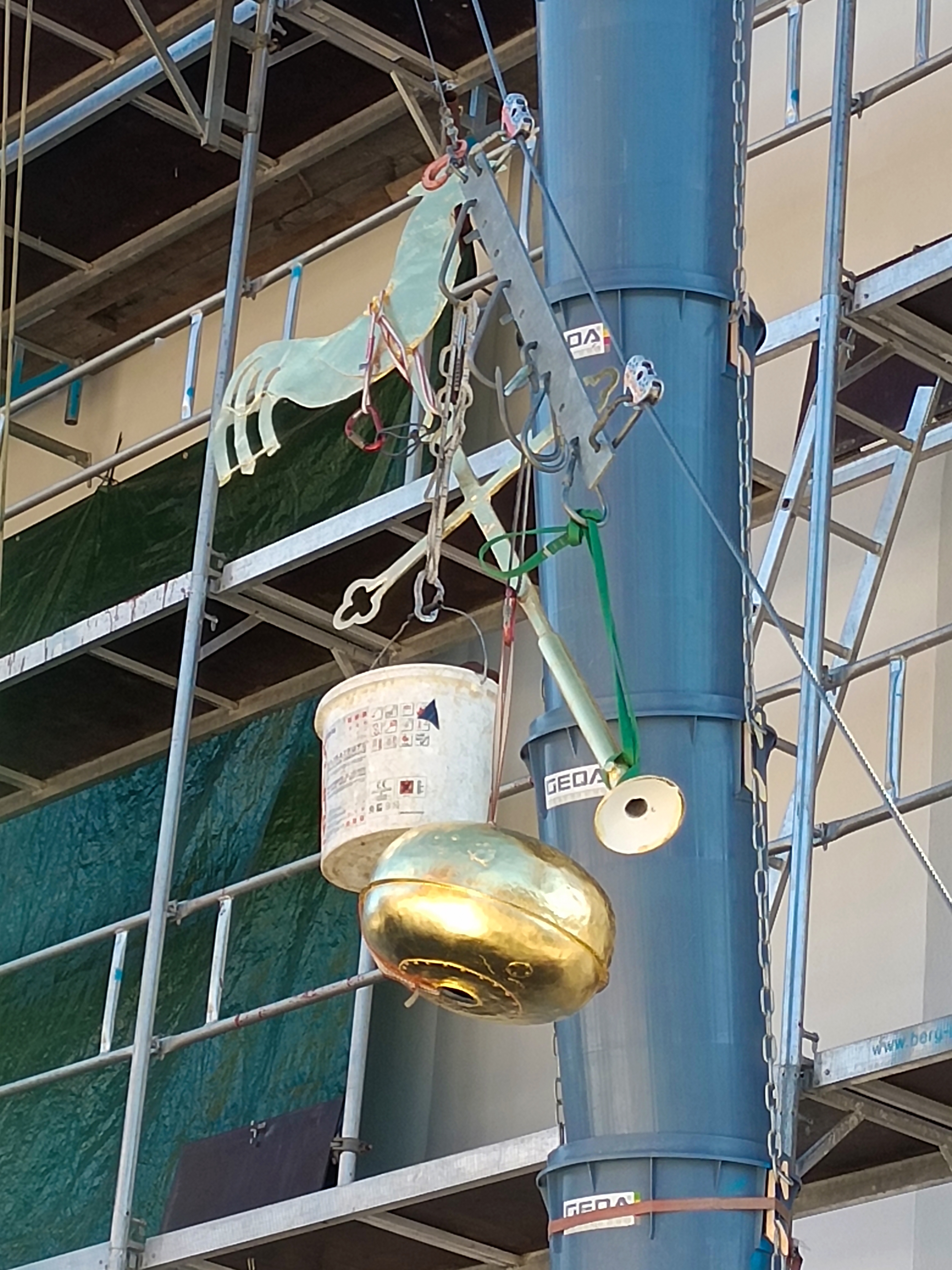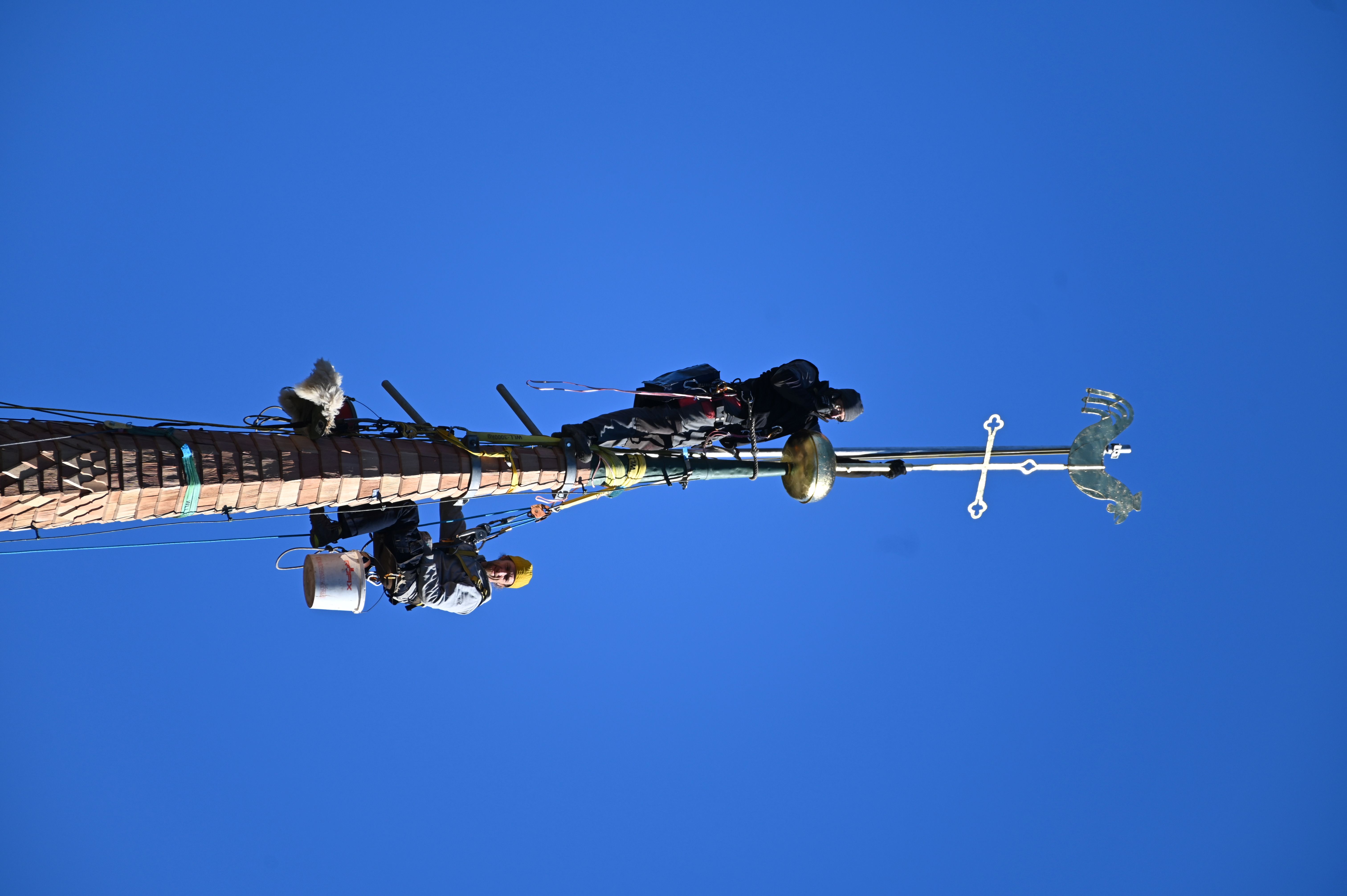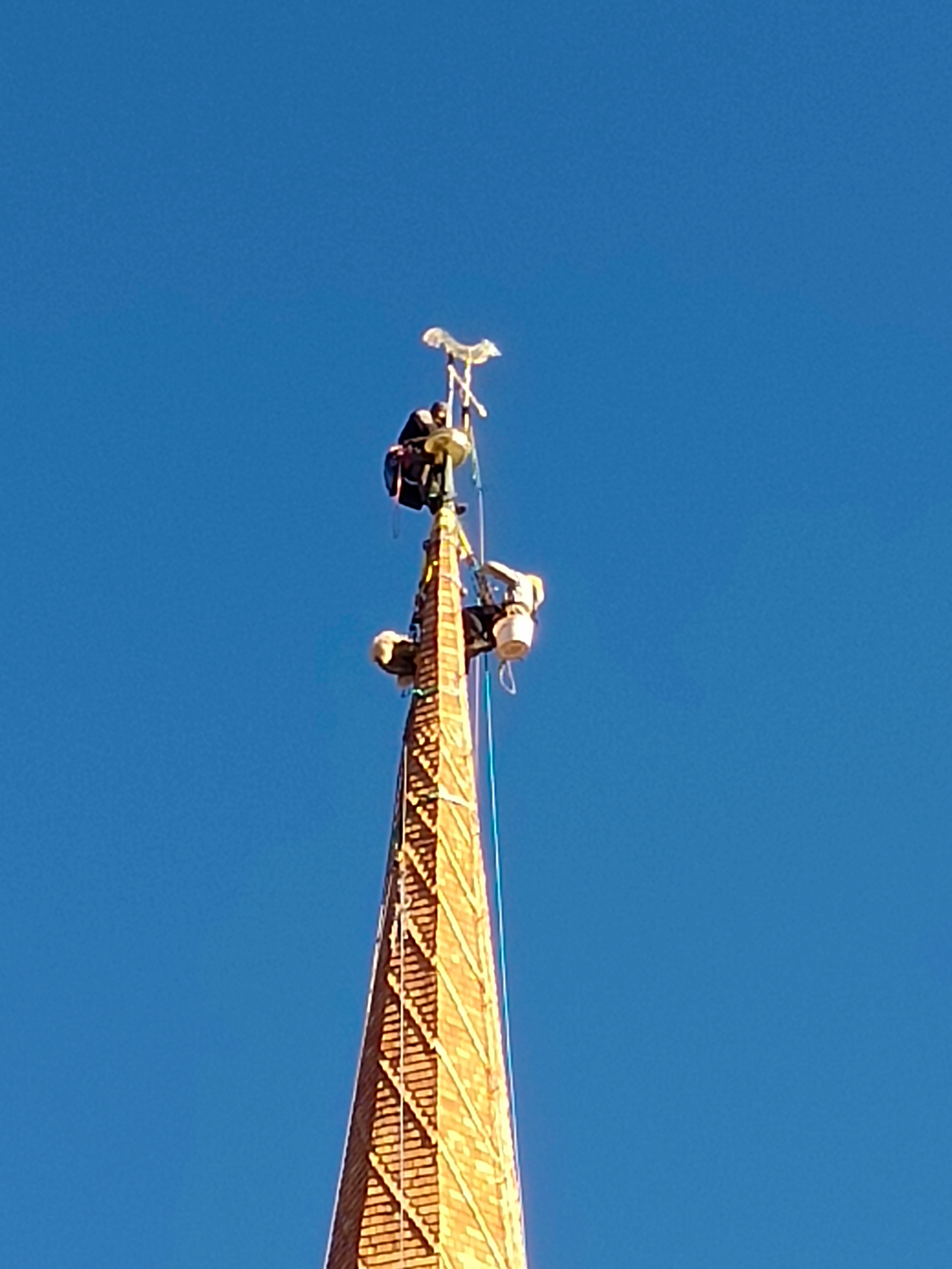 Den Abschluss der Turmarbeiten bildete das Aufsetzen der gesegneten Kreuzkugel mit Kreuz und Wetterhahn. Auch das Kirchendach erhielt neue, langlebige Lärchen-Holzschindeln und ist nun wieder zuverlässig gegen Wind und Wetter geschützt.