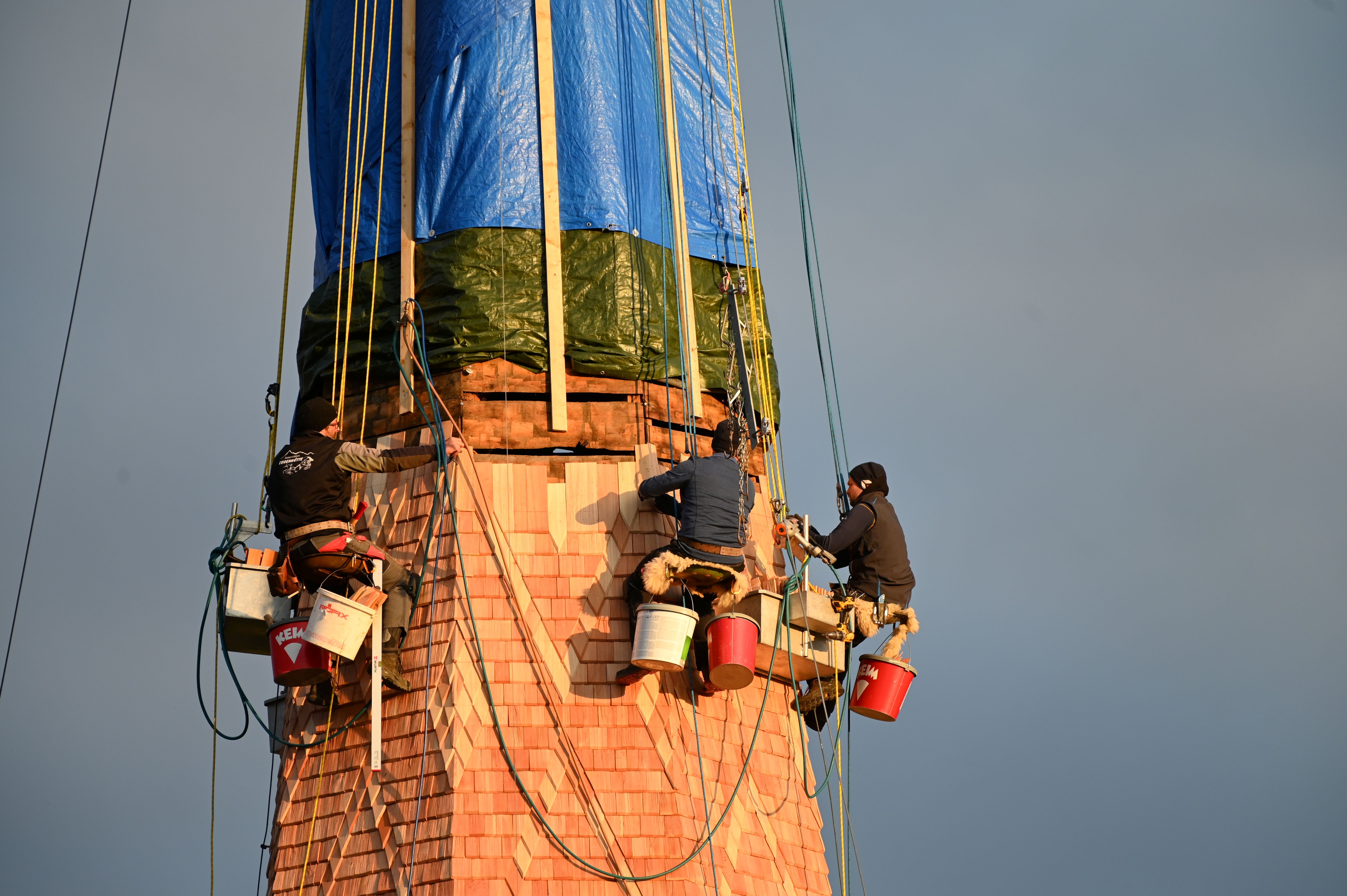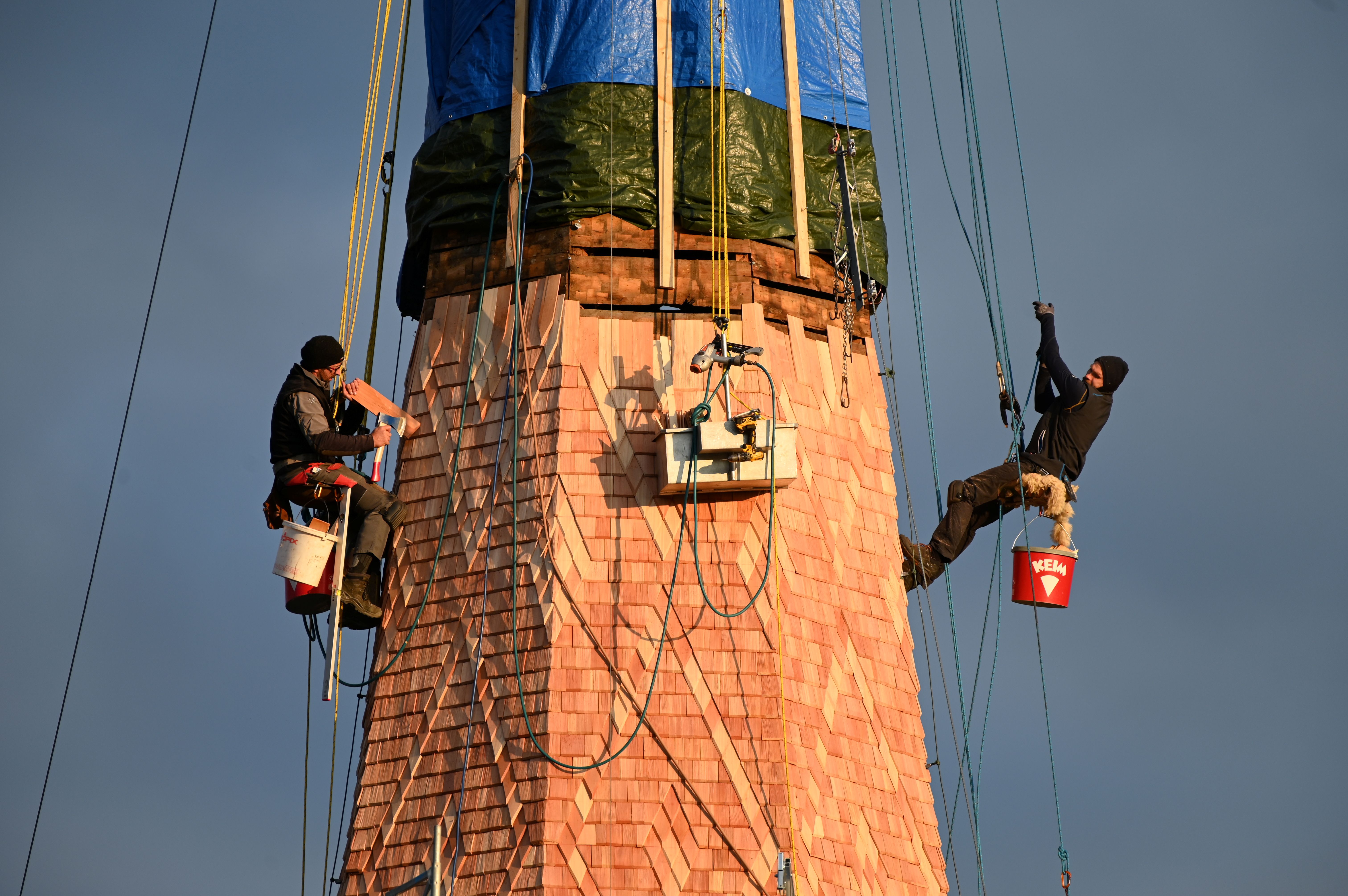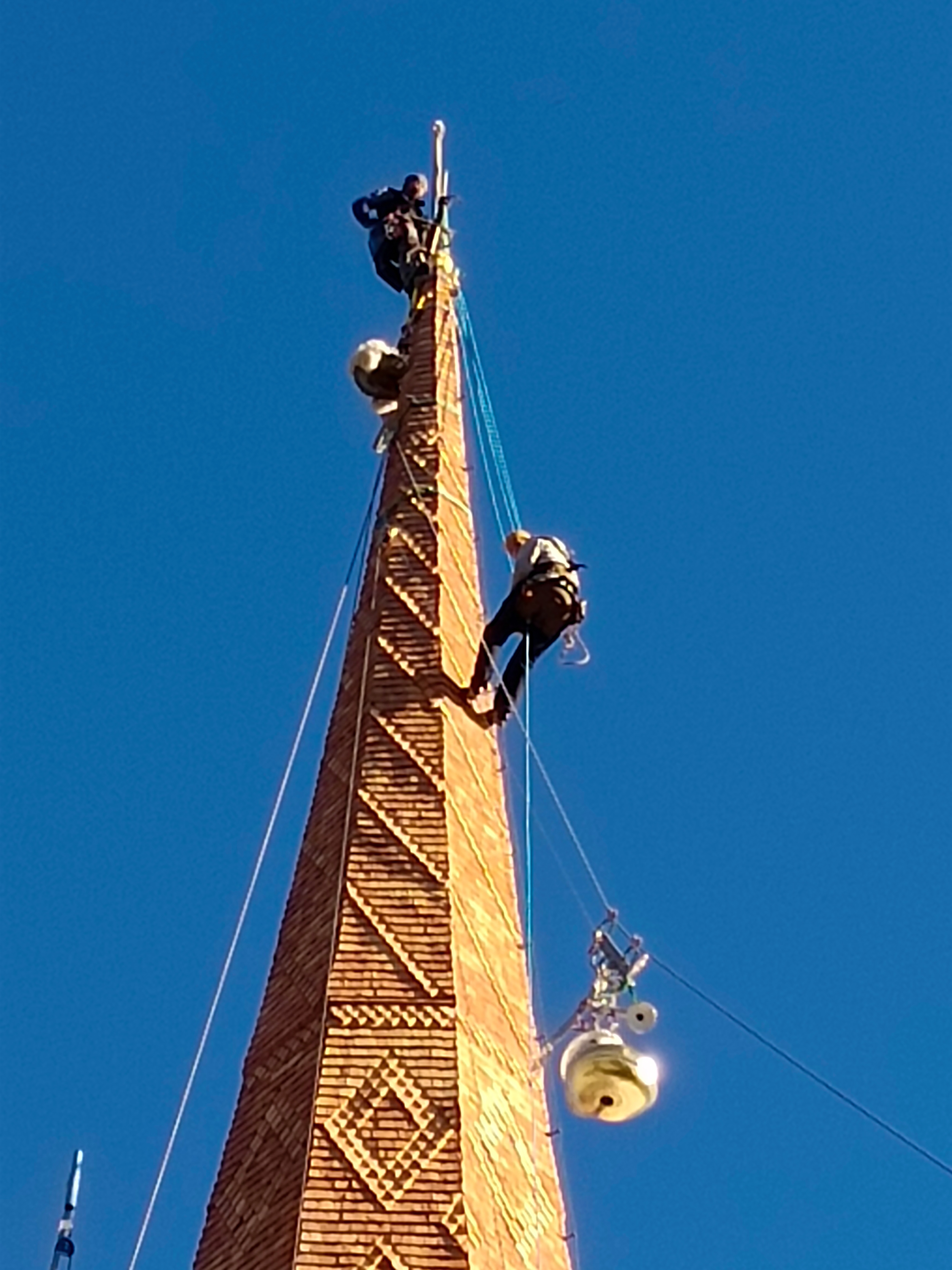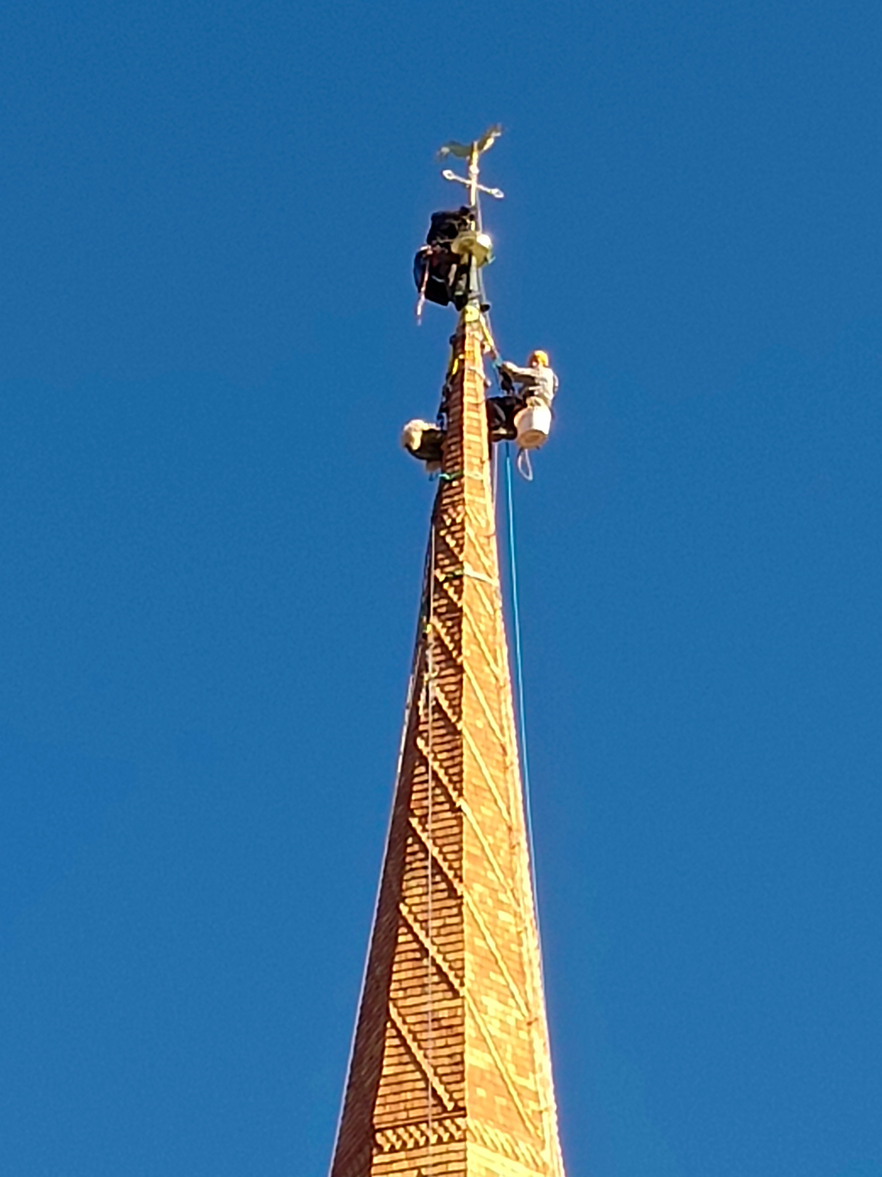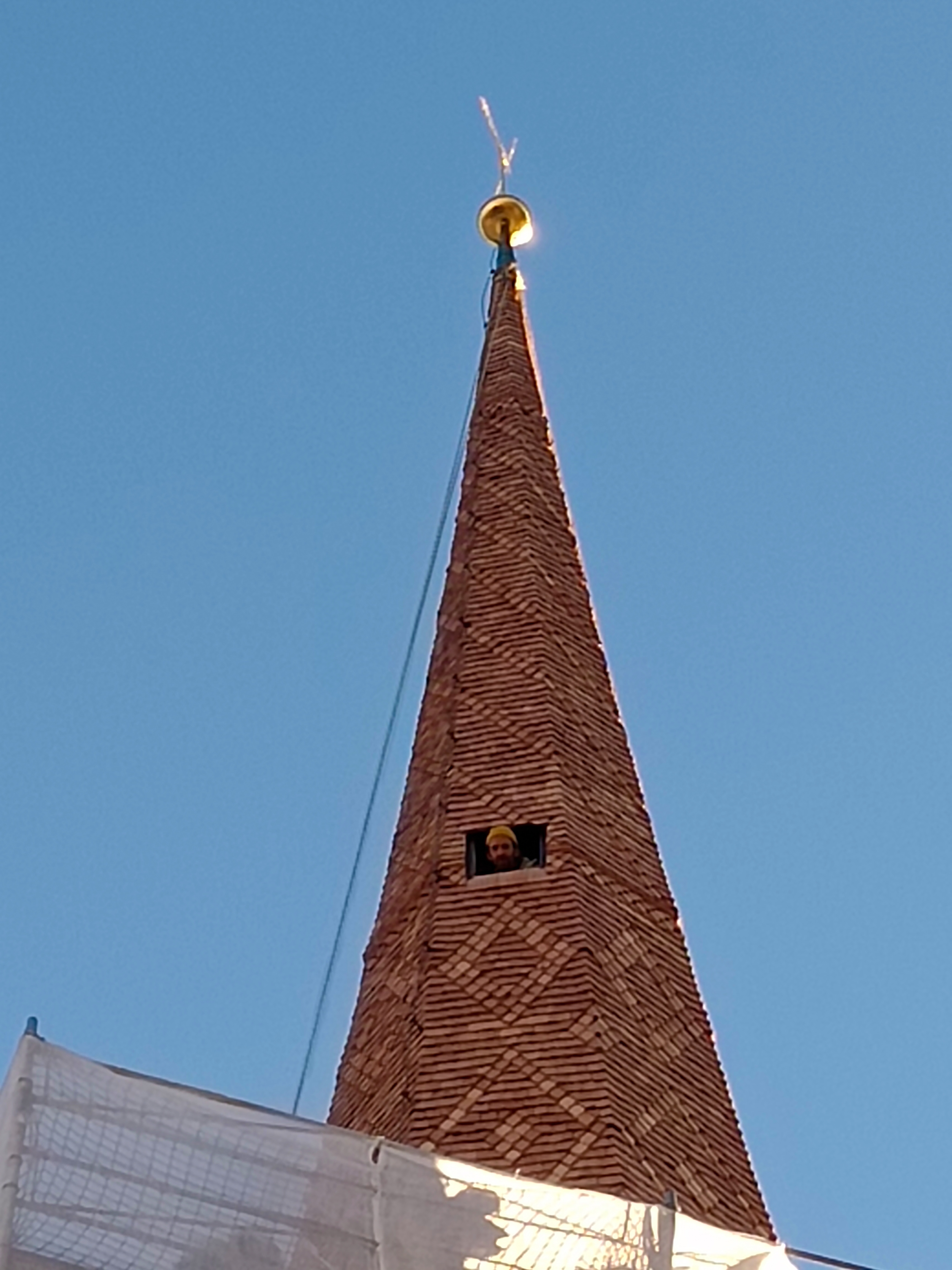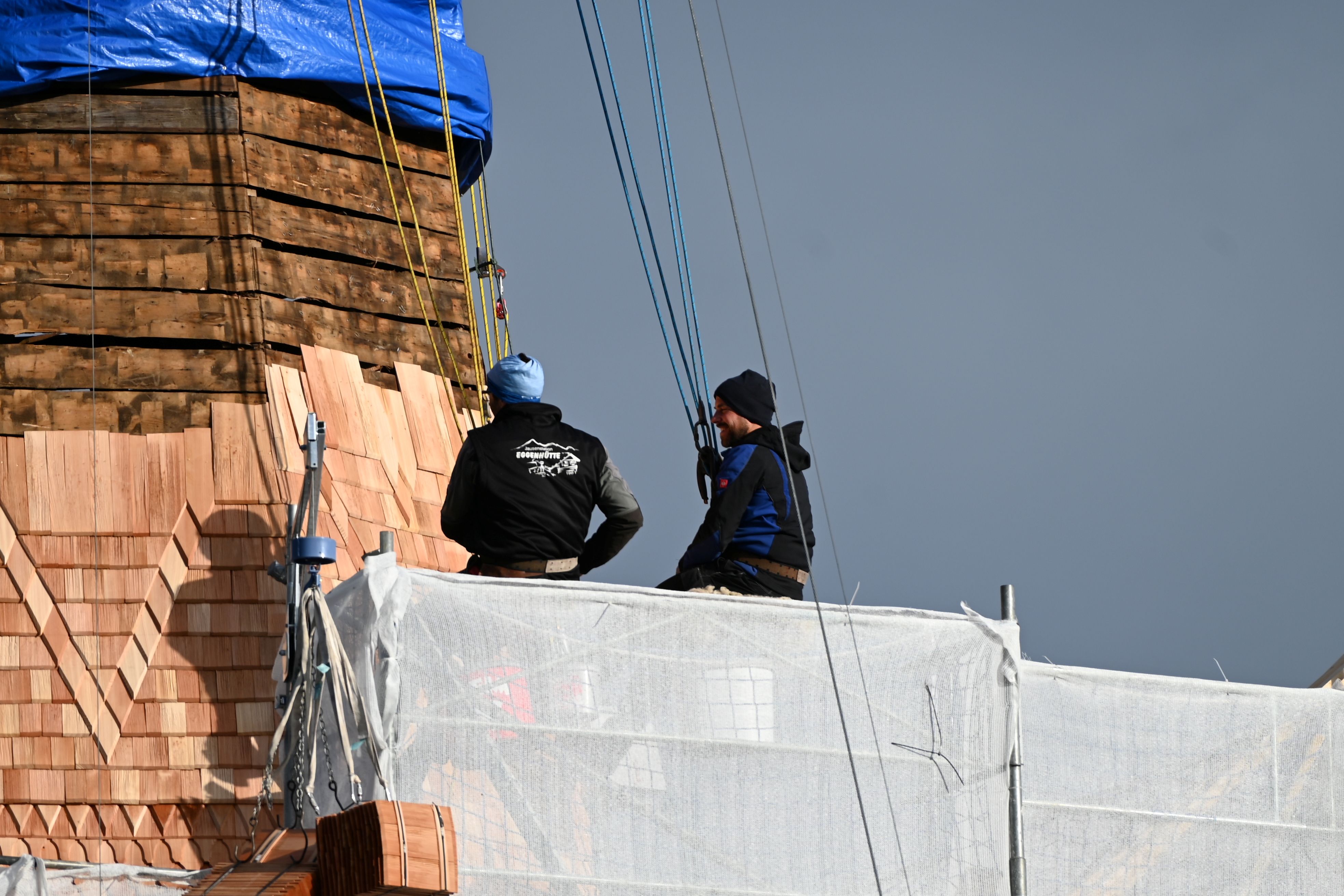 Den Abschluss der Turmarbeiten bildete das Aufsetzen der gesegneten Kreuzkugel mit Kreuz und Wetterhahn. Auch das Kirchendach erhielt neue, langlebige Lärchen-Holzschindeln und ist nun wieder zuverlässig gegen Wind und Wetter geschützt.