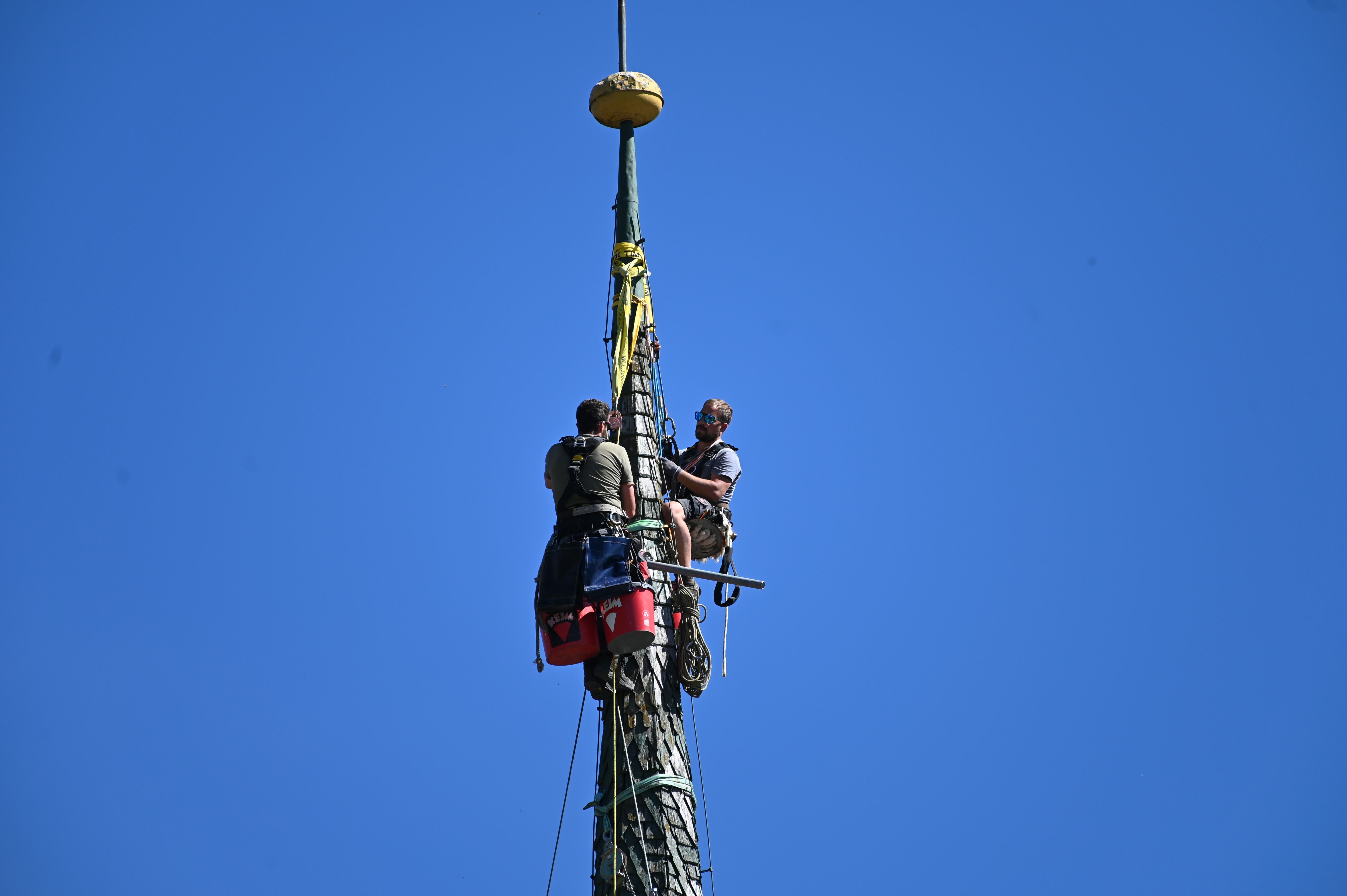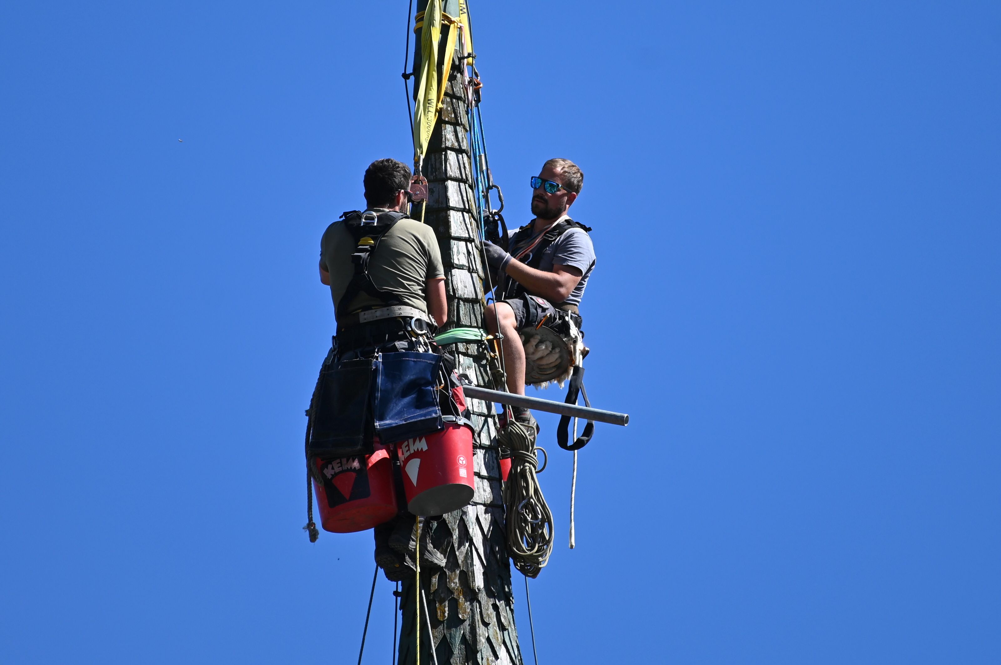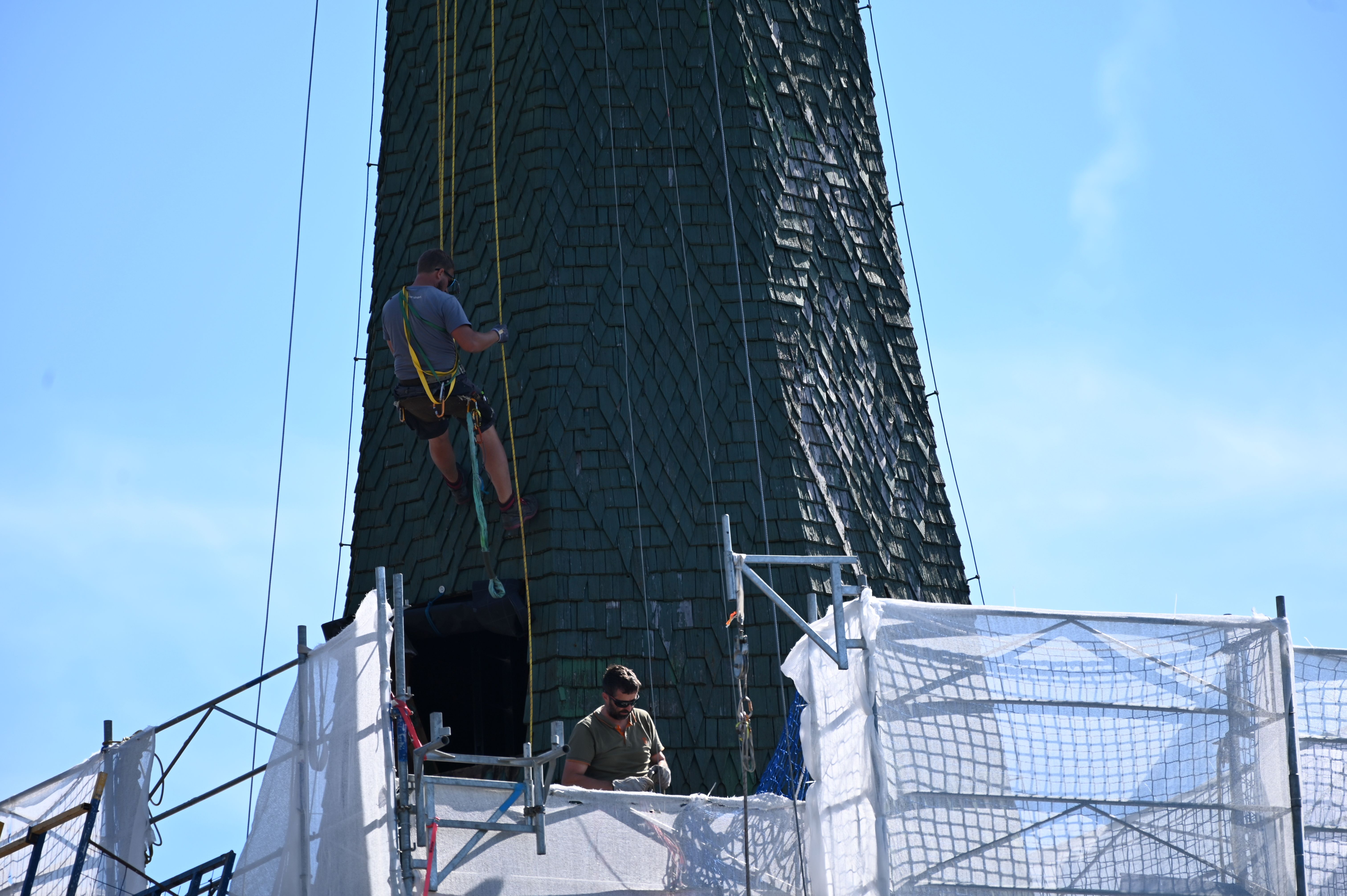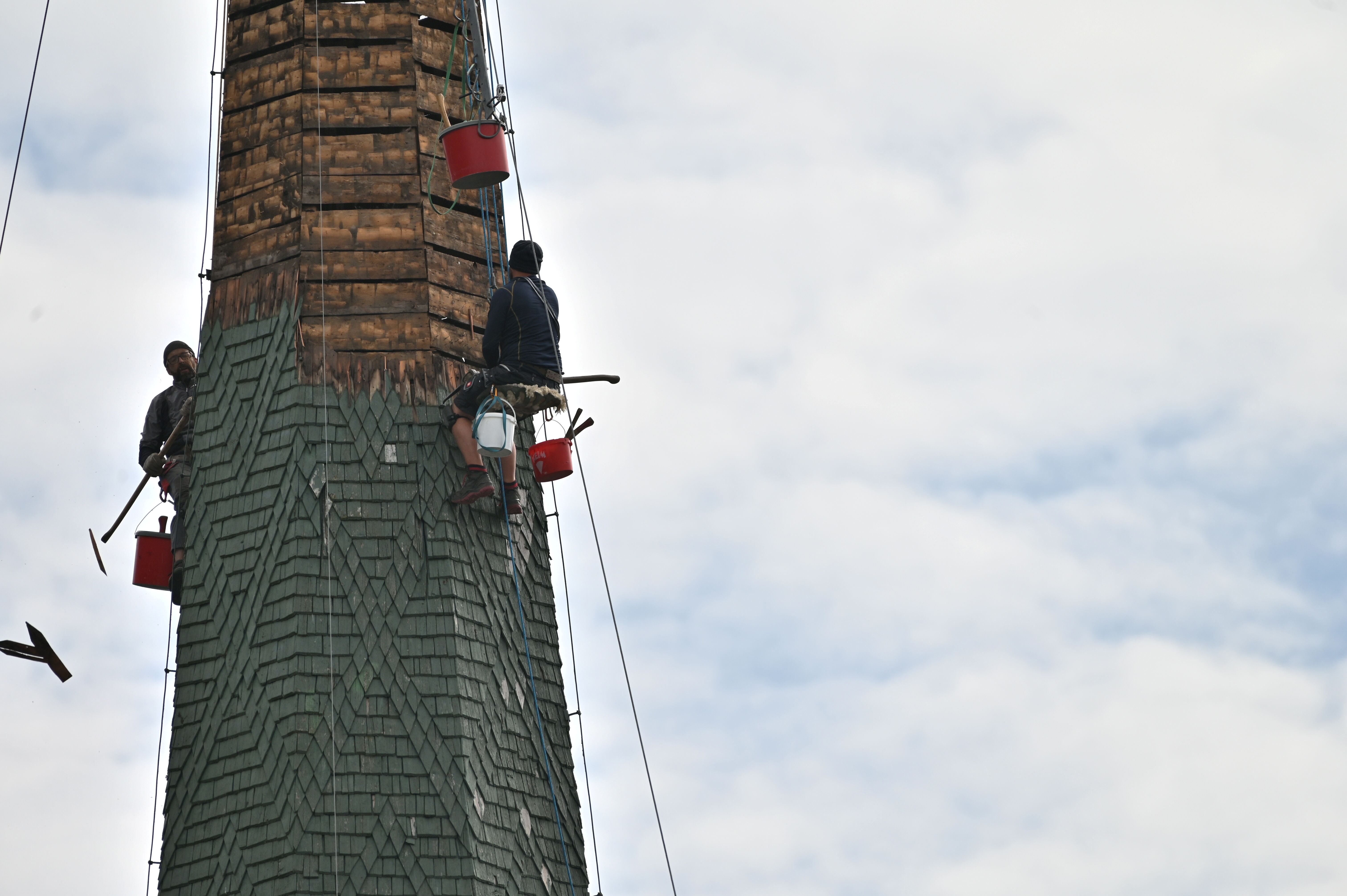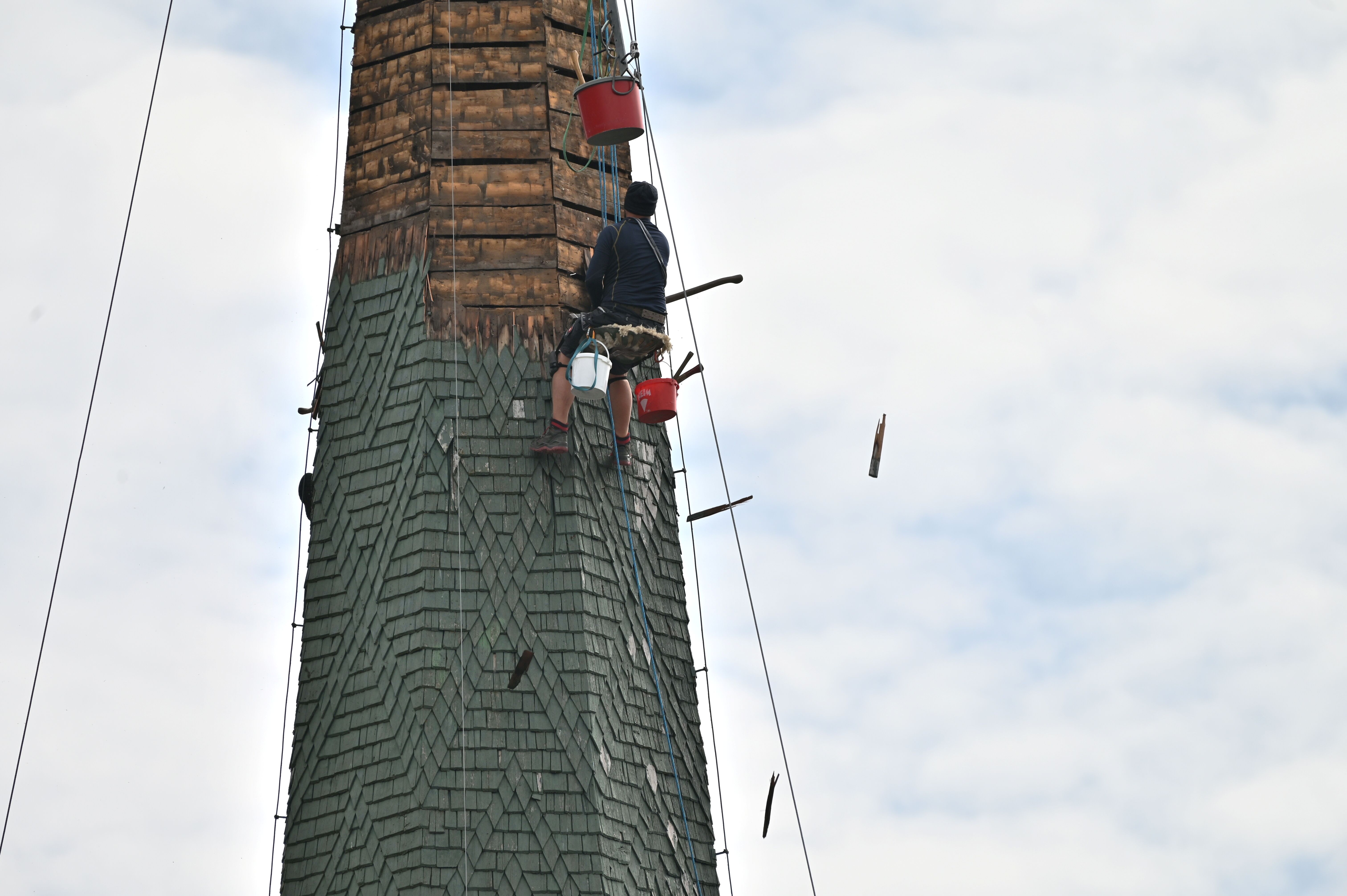 Den Abschluss der Turmarbeiten bildete das Aufsetzen der gesegneten Kreuzkugel mit Kreuz und Wetterhahn. Auch das Kirchendach erhielt neue, langlebige Lärchen-Holzschindeln und ist nun wieder zuverlässig gegen Wind und Wetter geschützt.