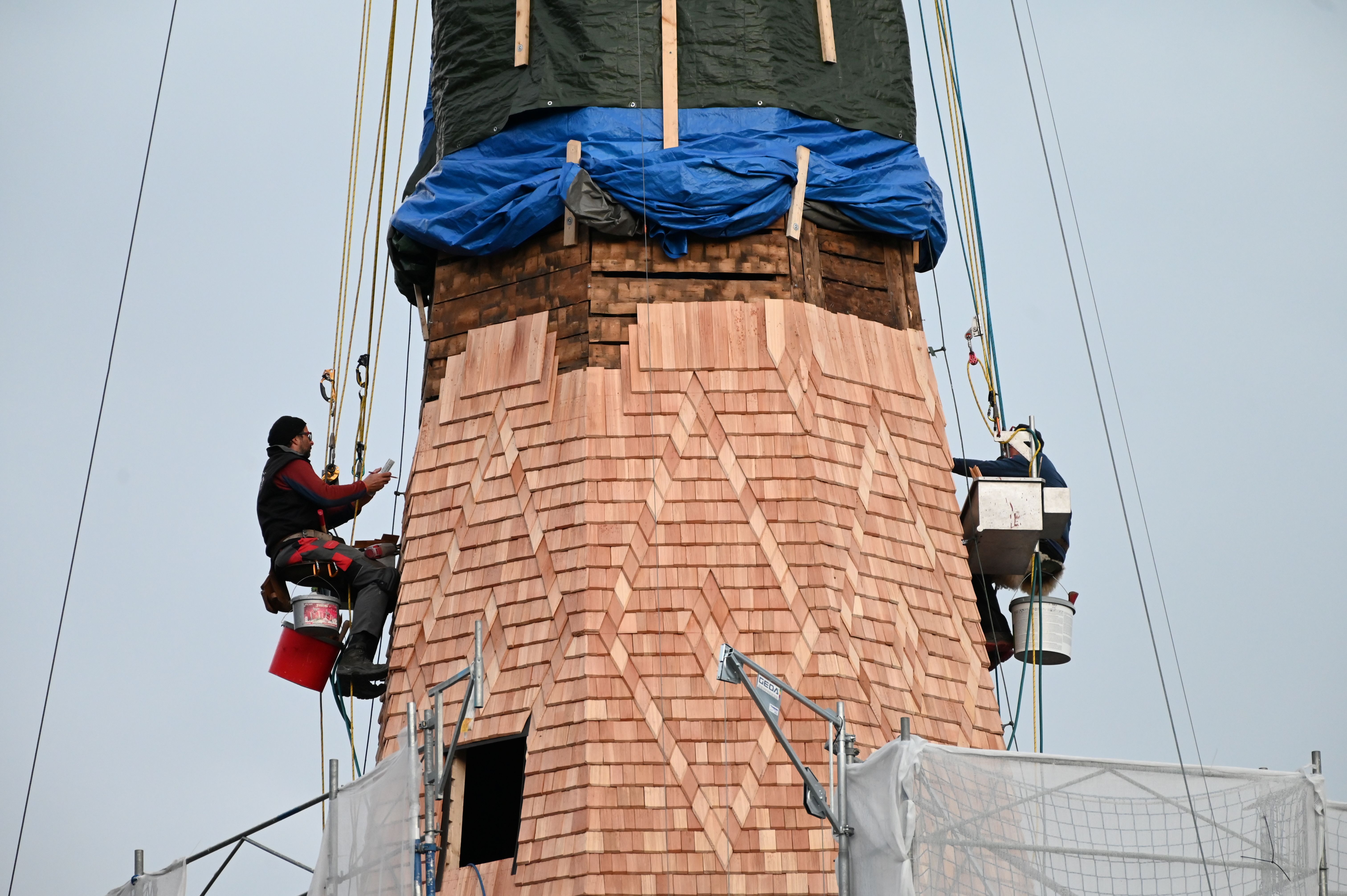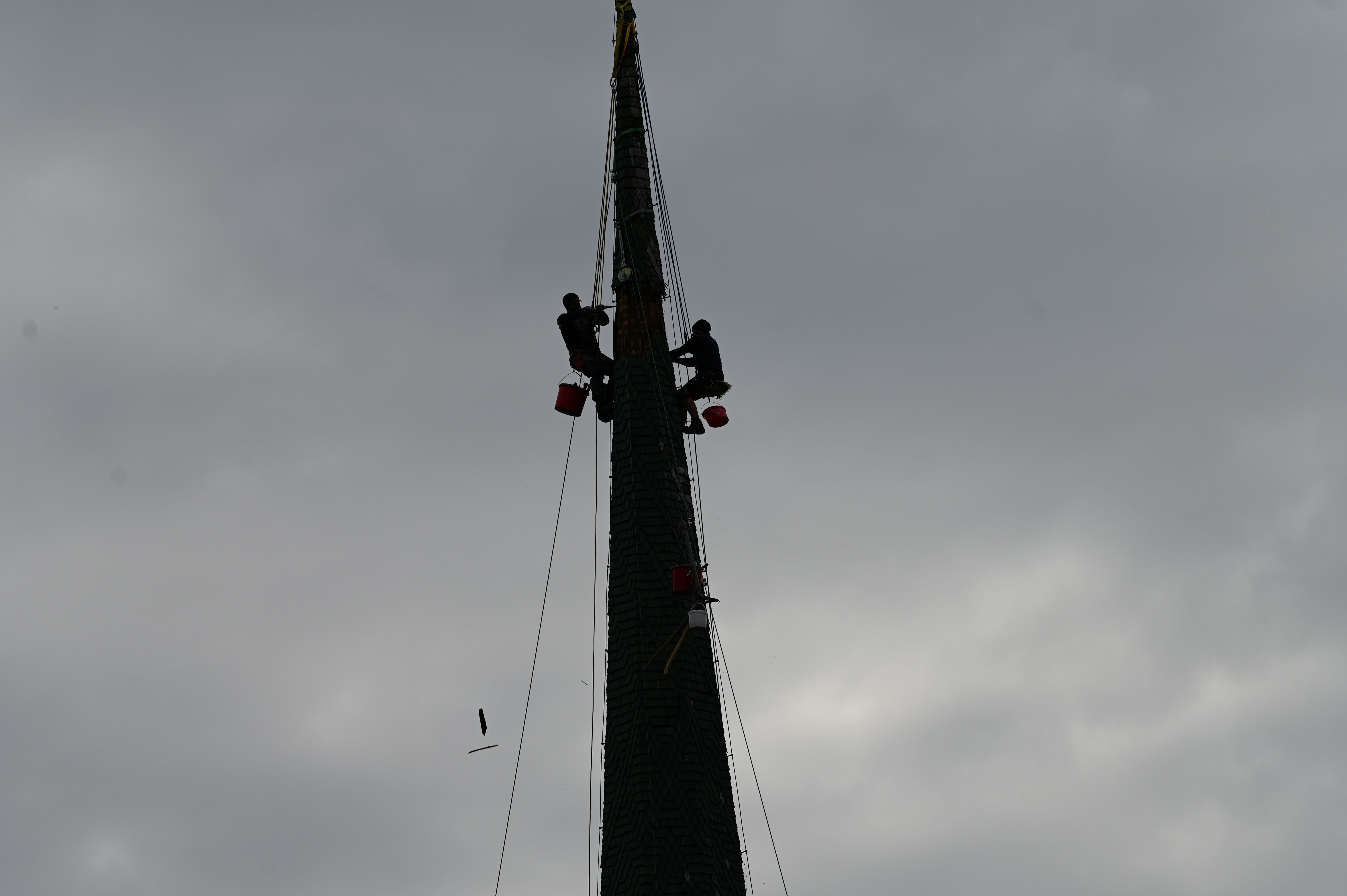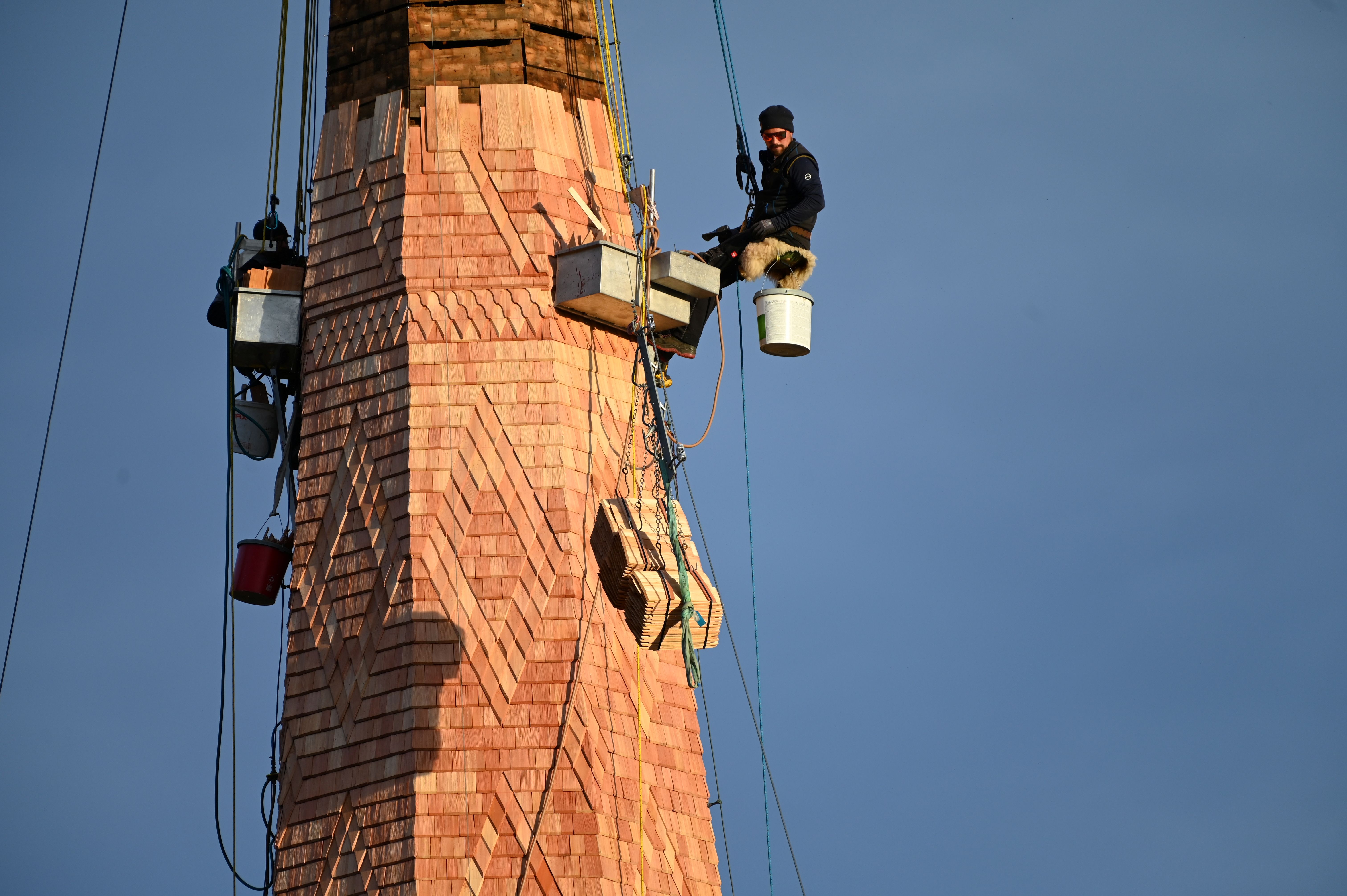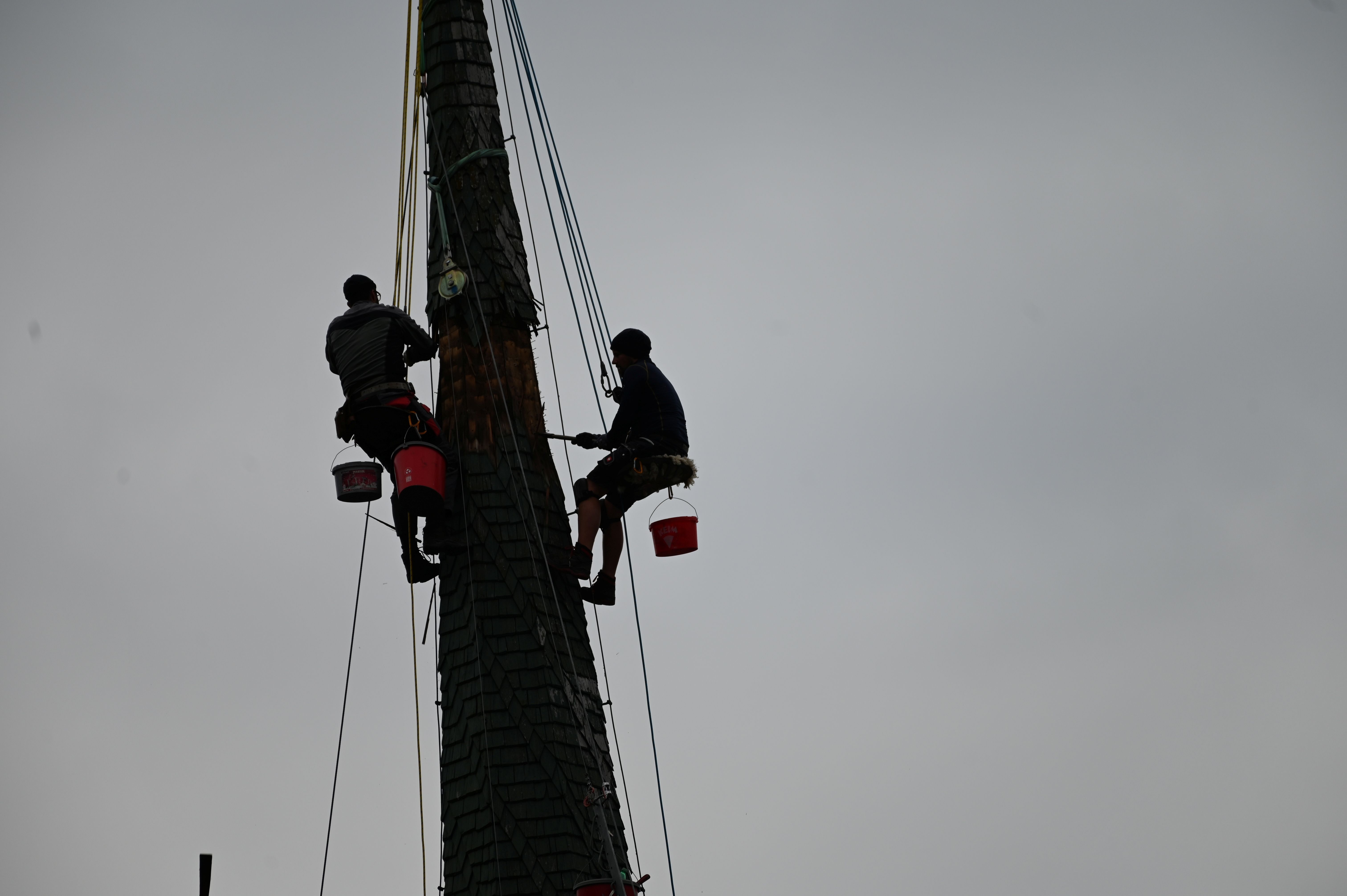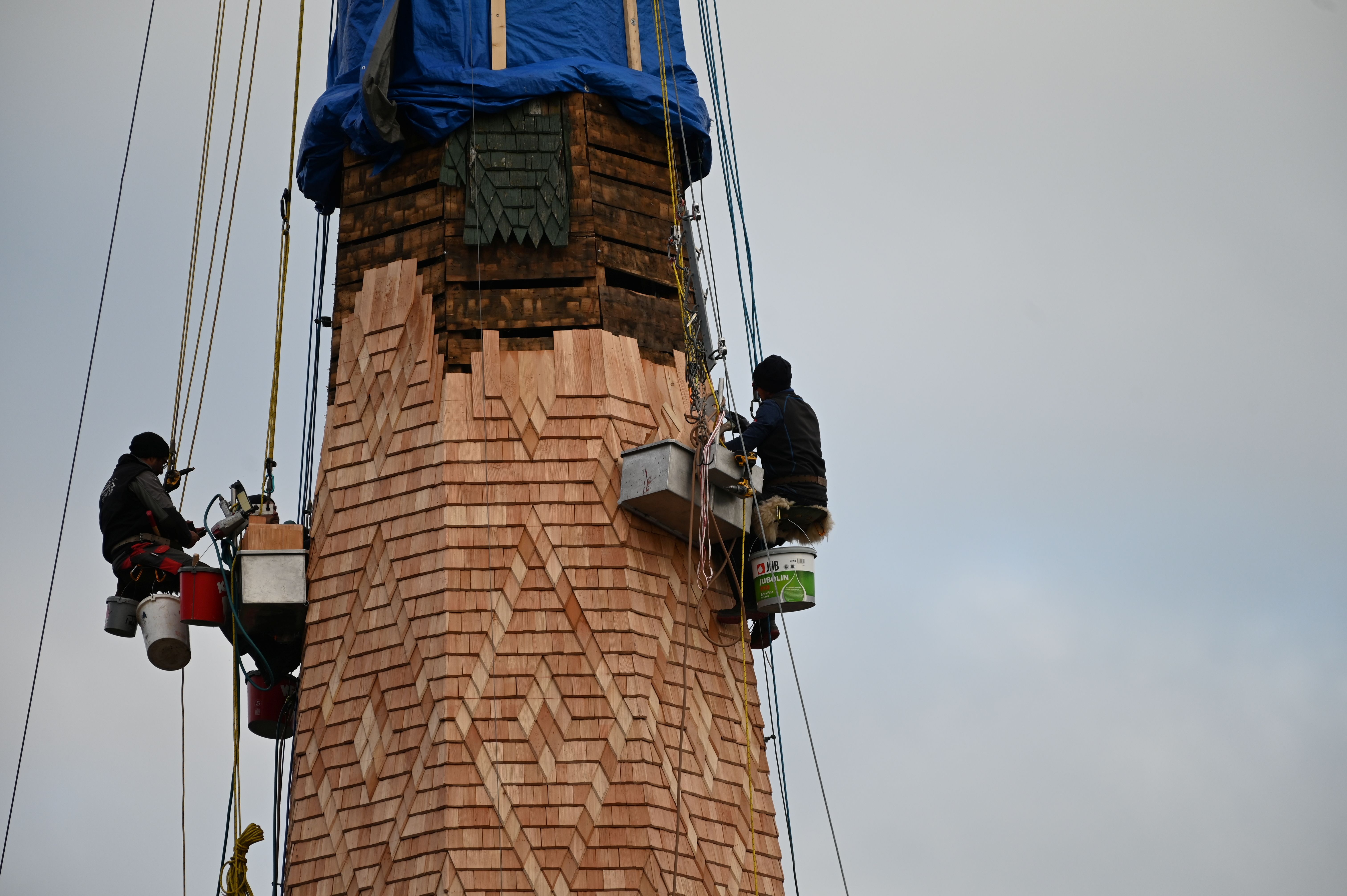Den Abschluss der Turmarbeiten bildete das Aufsetzen der gesegneten Kreuzkugel mit Kreuz und Wetterhahn. Auch das Kirchendach erhielt neue, langlebige Lärchen-Holzschindeln und ist nun wieder zuverlässig gegen Wind und Wetter geschützt.